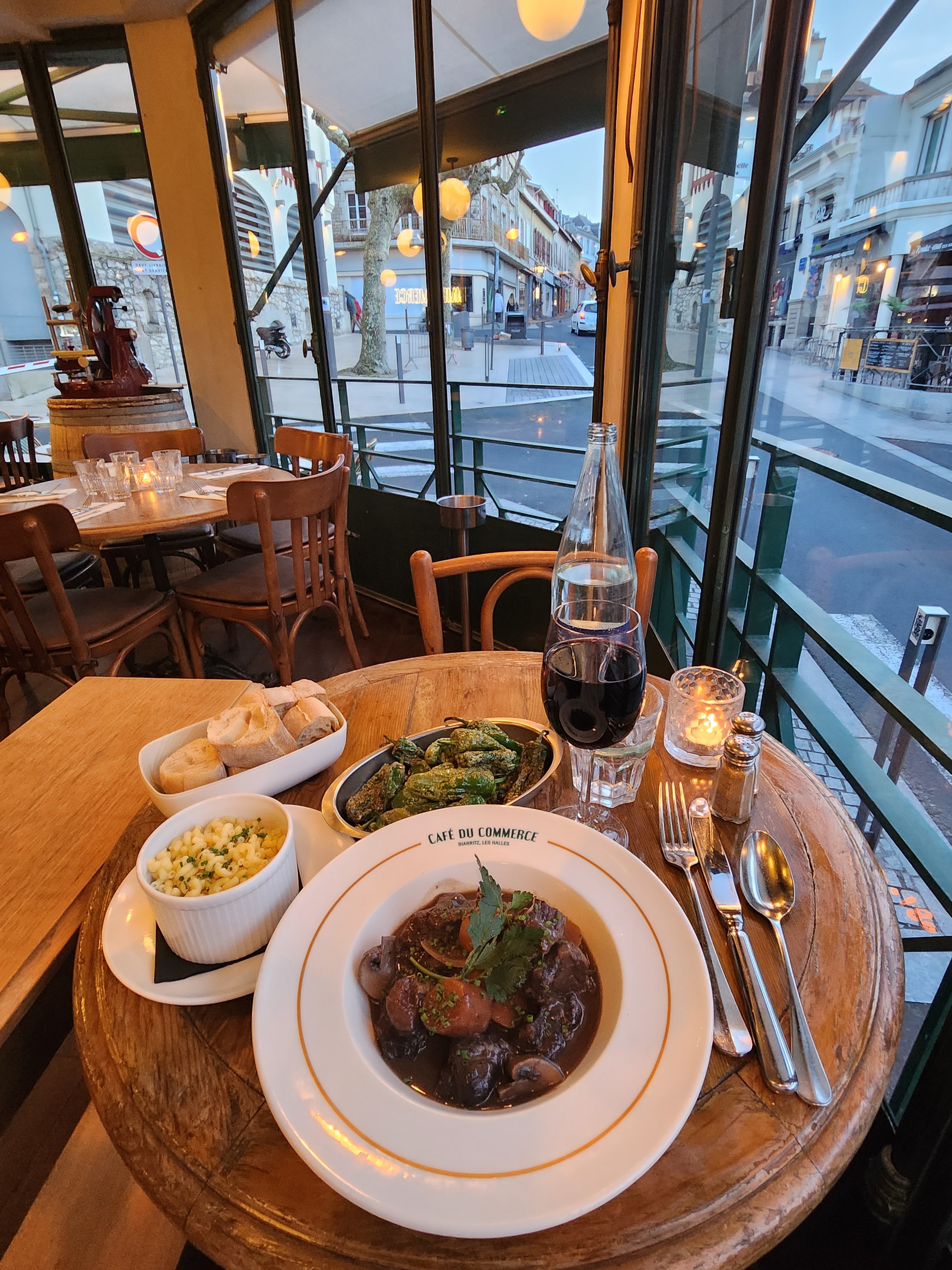 Nous sommes arrivés à Biarritz assez tard dans la nuit et alors que tout était en train de fermer et qu'on nous avait dit d'aller voir à la Cantina, voilà qu'on tombe sur le Café du Commerce par hasard. Le maître de a été très accueillant ainsi que les serveuses. On nous a installé en terrasse ce qui nous a permis d'apprécier le tout Biarritz qui défilait et s'amusait. :). On a vraiment bien mangé. Très belle l'ambiance avec des clients qui semblent vraiment aimer la vie. :)
