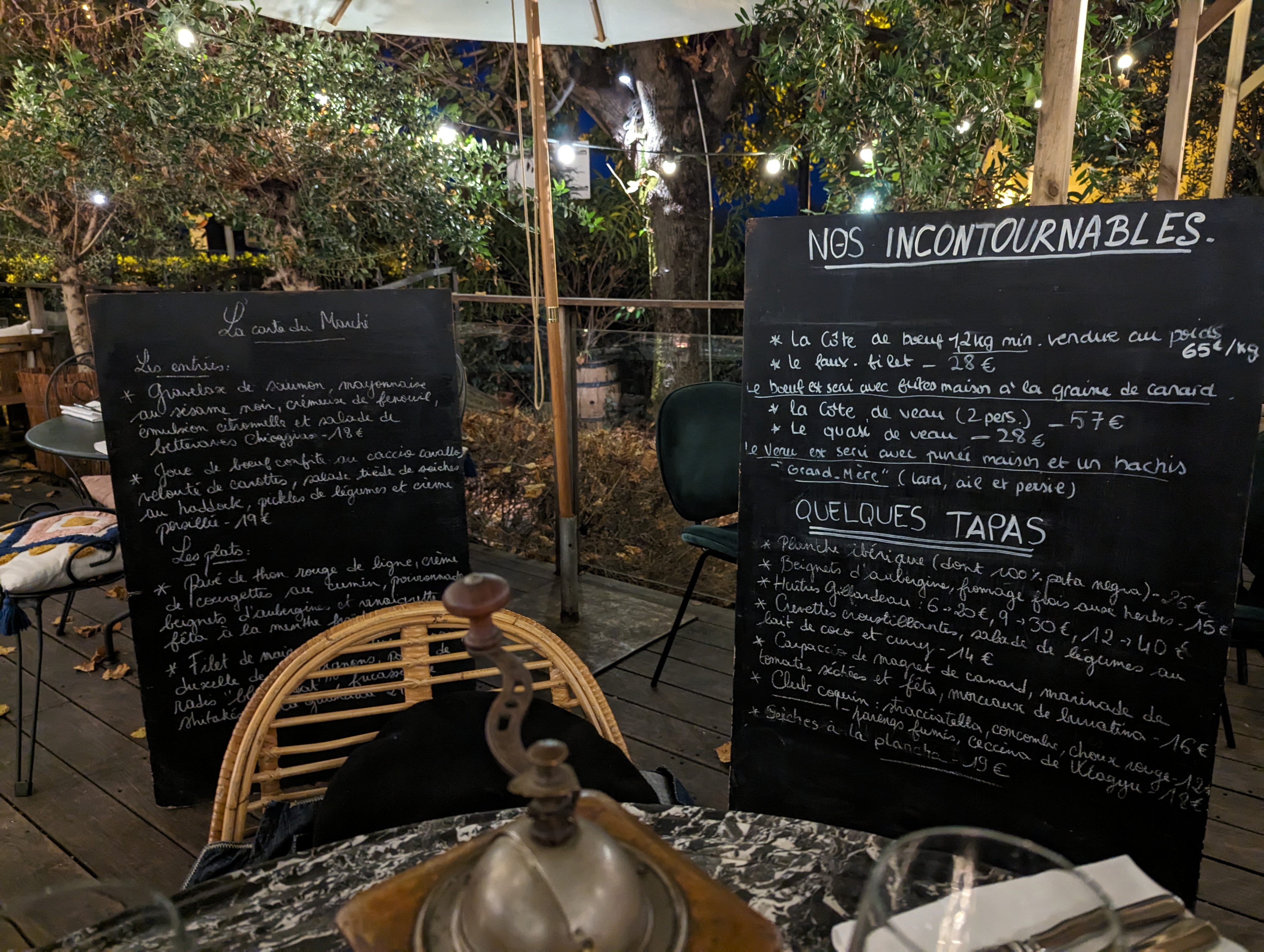 Ombragé, service impeccable, le menu extre