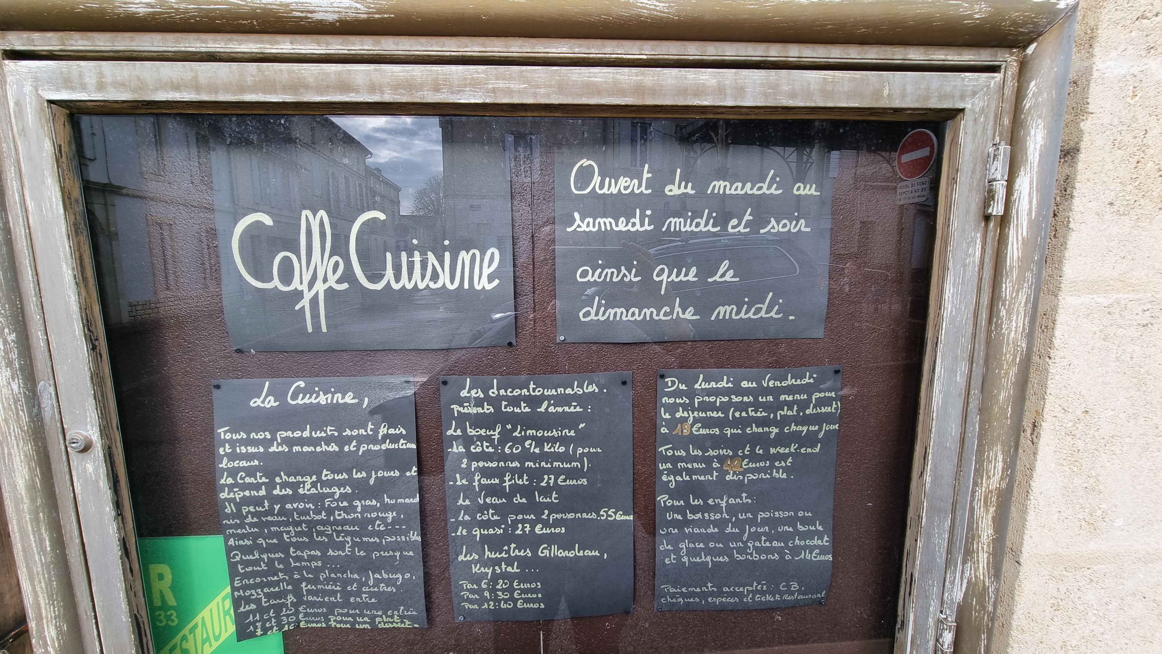 Je suis venue le dimanche 22 septembre pour midi, l'entrée du restaurant de paye pas de mine mais c'est une agréable découverte la côte de bœuf est à tomber, le dessert gourmand avec le café est généreux, les huîtres bien charnues , c'est une très bonne table, nous avons eu droit au digestif offert par la maison, en bref ils savent vraiment recevoir les clients, je vous le conseille vivement, je reviendrai.