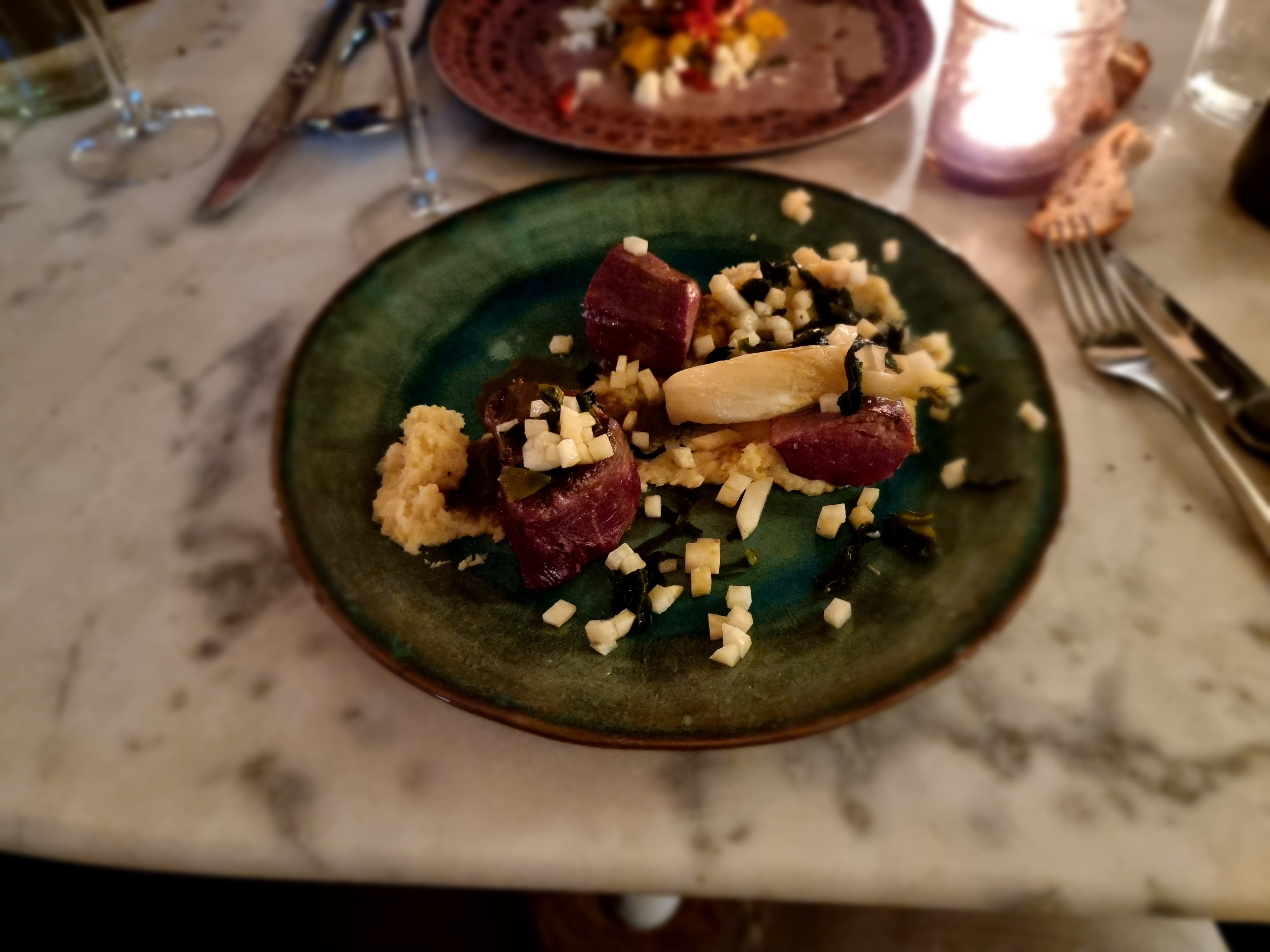 Le restaurant est superbement décoré, très charmant. Le service était courtois et assez attentif, rapide également. Le problème était principalement avec la cuisine. Où commencer? Les entrées n’étaient pratiquement pas assaisonnées, la lotte était quasi-cru, j’ai du la renvoyer (la table à côté également - mème problème), quand j’ai reçu l’assiette en retour la cuissons était correcte mais le reste de l’assiette était asséché à force d’être resté sous la lampe trop longtemps. Les cèpes en accompagnement n’ont pas été lavé correctement, il y avait du sable. D’autres détails n’ont pas aidé l’expérience (bouteille d’eau cassée; moucheron dans le verre de vin quand il arrive à la table; etc.). L’addition pour deux: 145eur (2 entrées; 2 plats; 2 verres de vin; 2 champagnes en apéritif; 2 cafés) Première recommandation décevante du fooding.