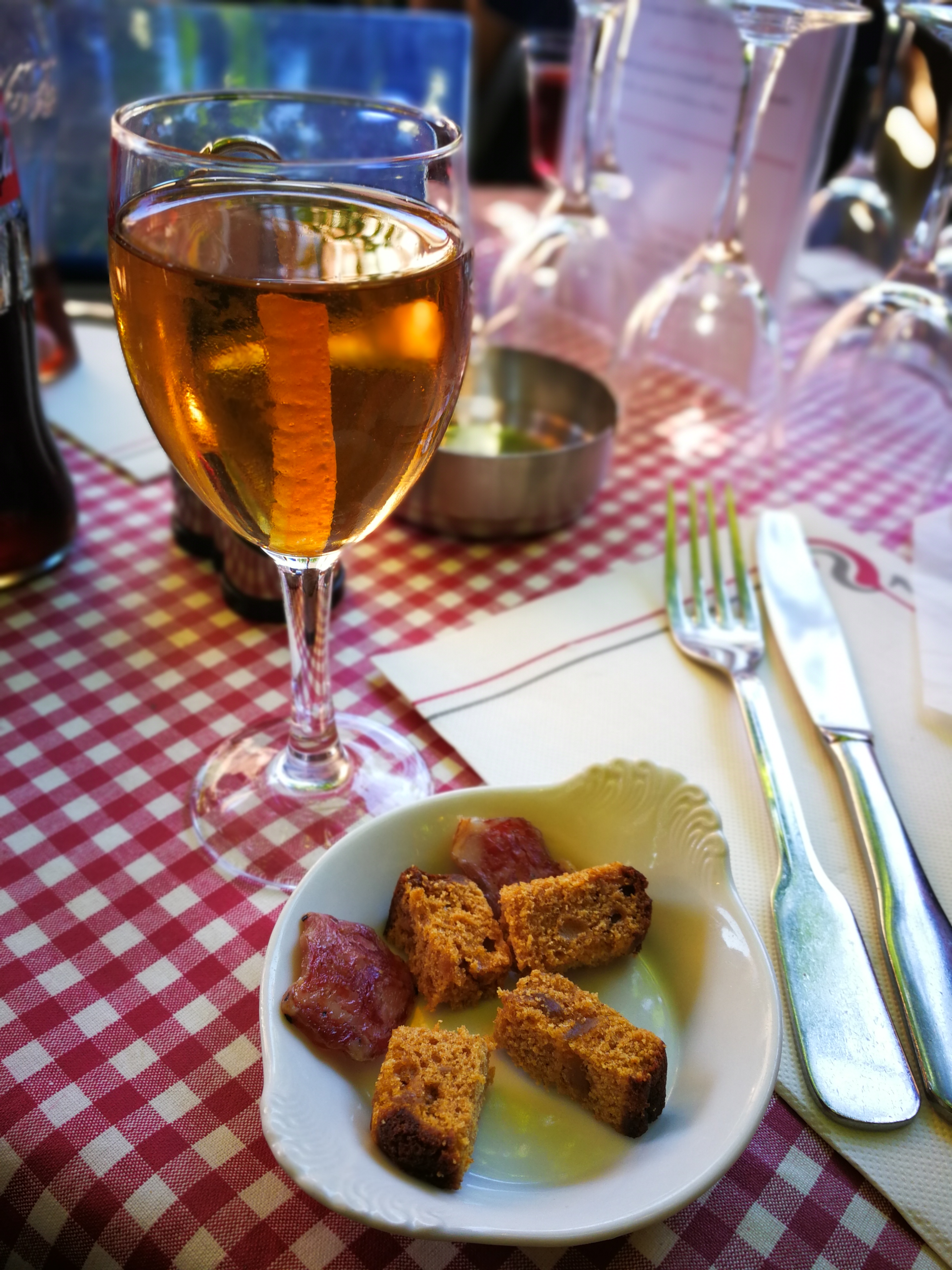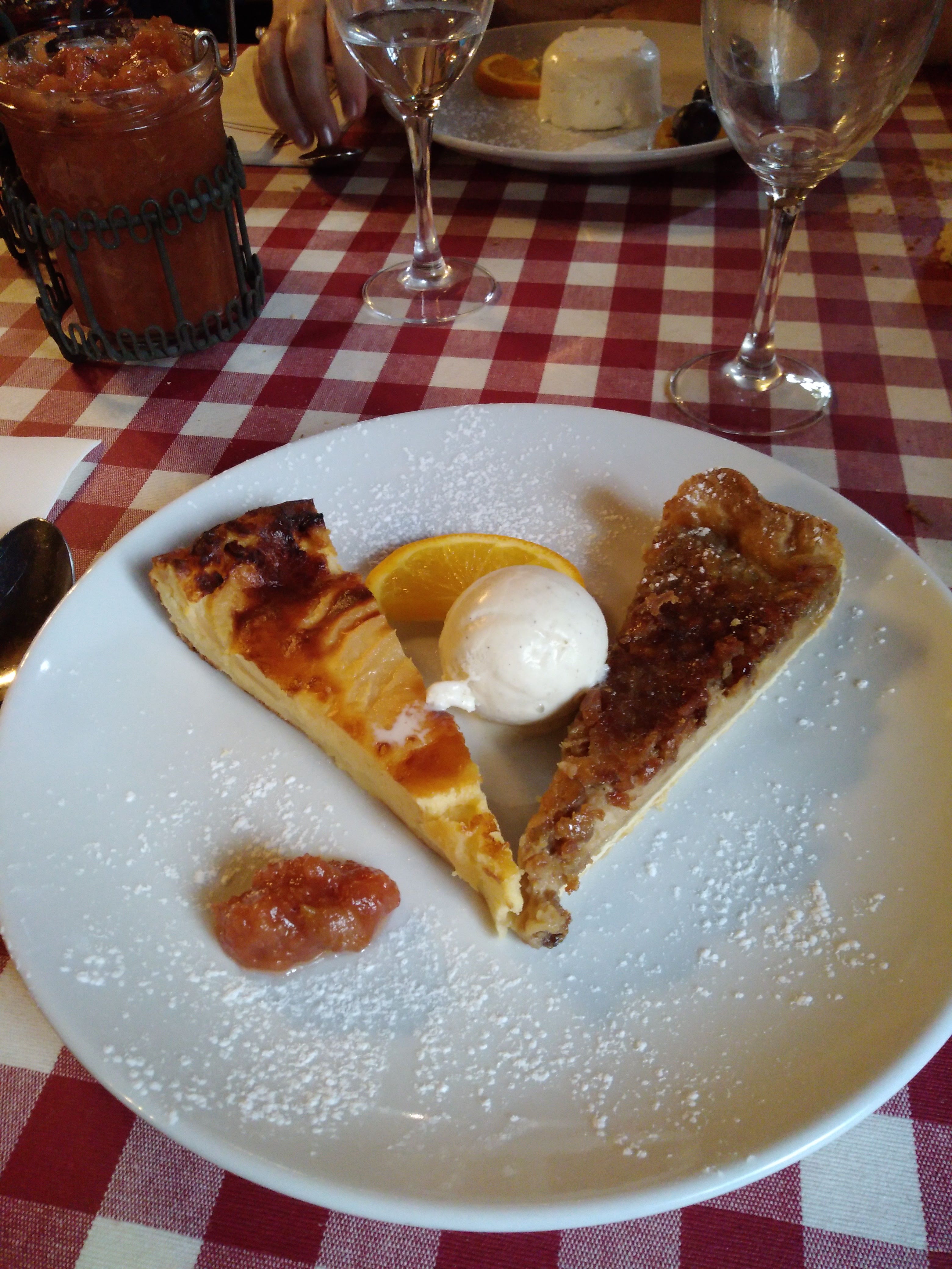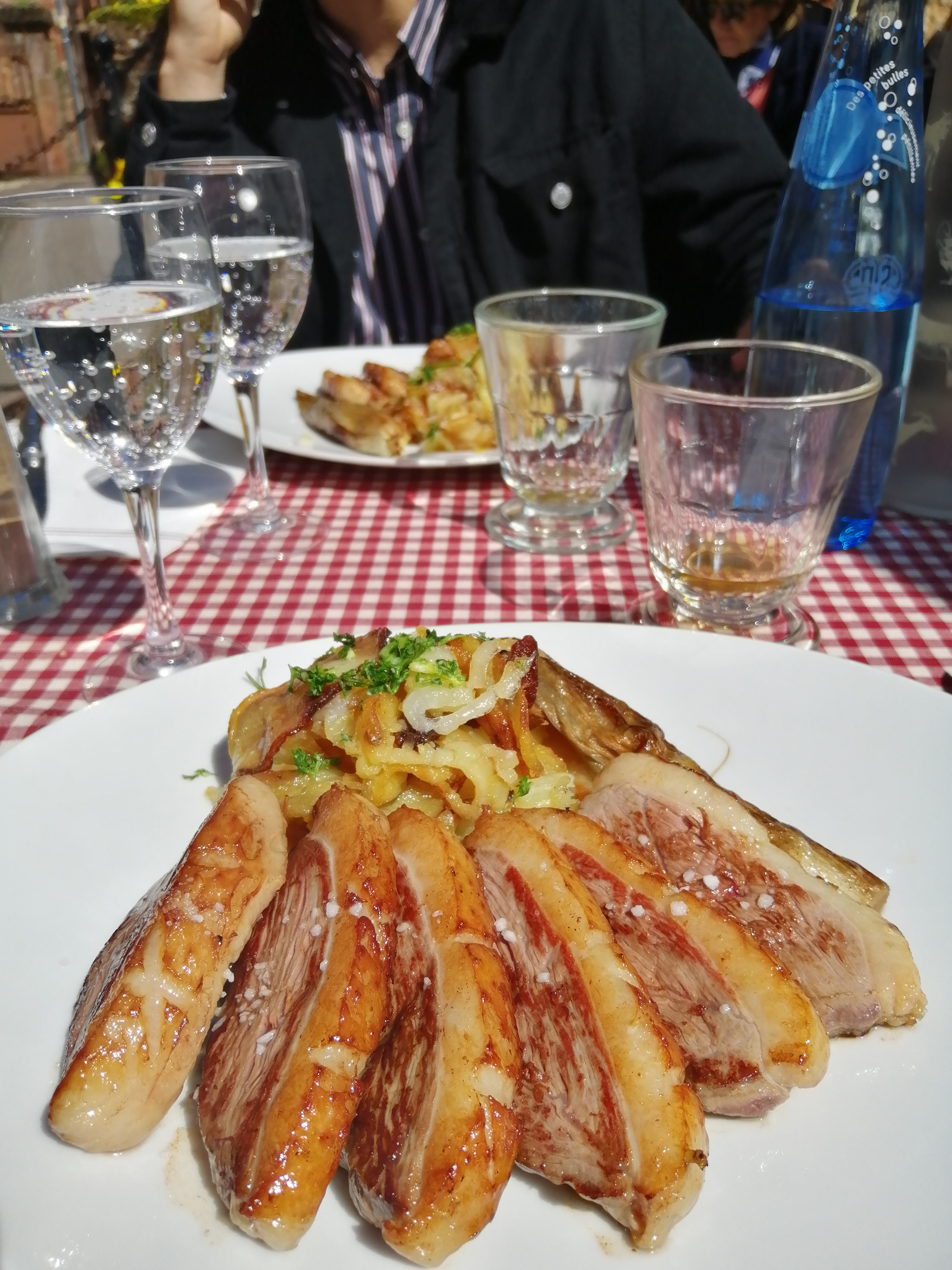 Le cadre est beau, déjeuner sous la vigne à l'ombre tranquille. Le foie gras avec son chutney d'oignon, tranche de pain grillé et pain d'épice était délicieux. Comme plat du jour nous avons pris le magret de canard certes pas suffisamment salé mais facile à rectifier. Quant aux pommes de terre, une petite tuerie ! Tous le personnel était très gentil et sympathique