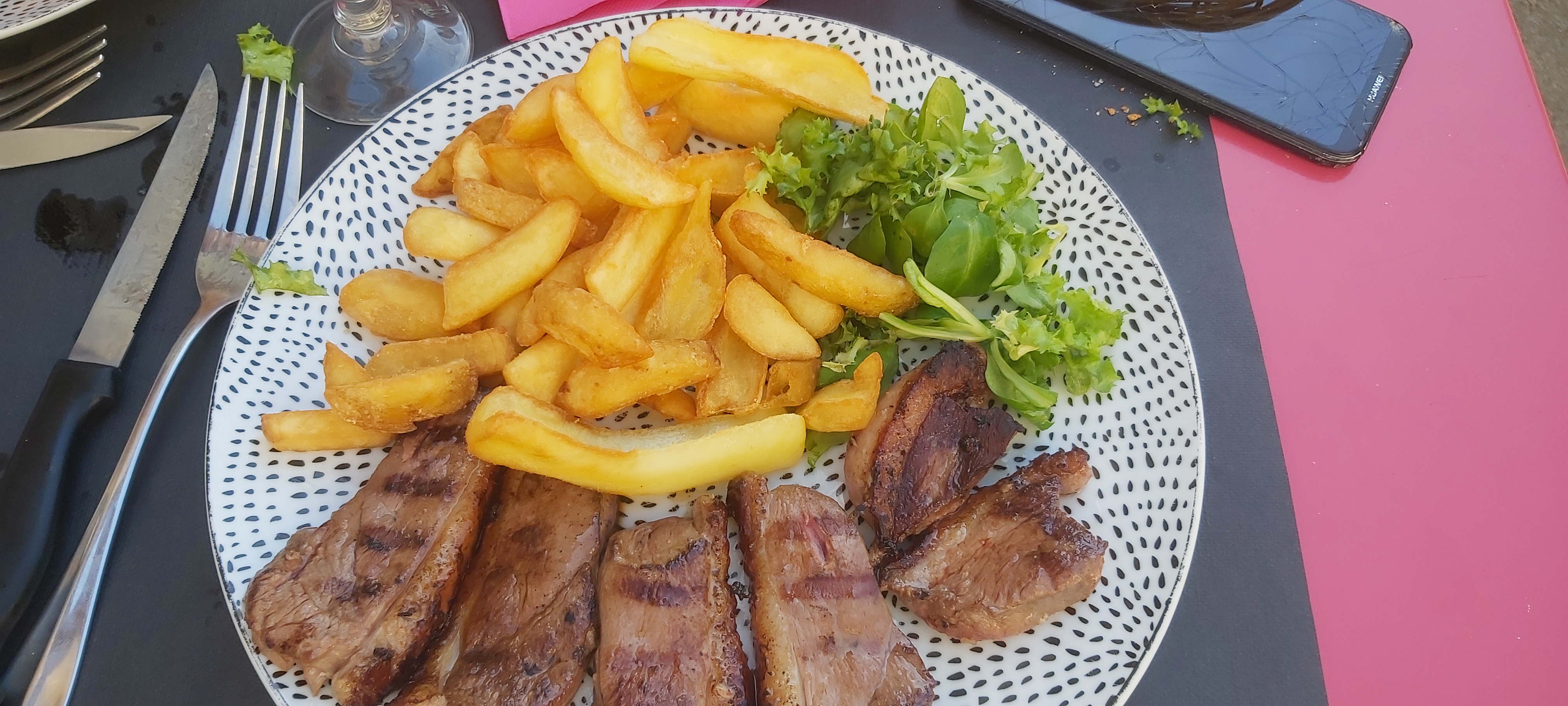 Bien que nous soyons arrivés tardivement (13h45) nous avons pu nous installer pour déjeuner. Viande(bavette) d'excellente qualité et grande salade 🥗 bien servie. Nous avons passé un moment agréable en extérieur pour profiter de l'air par cette chaude journée.