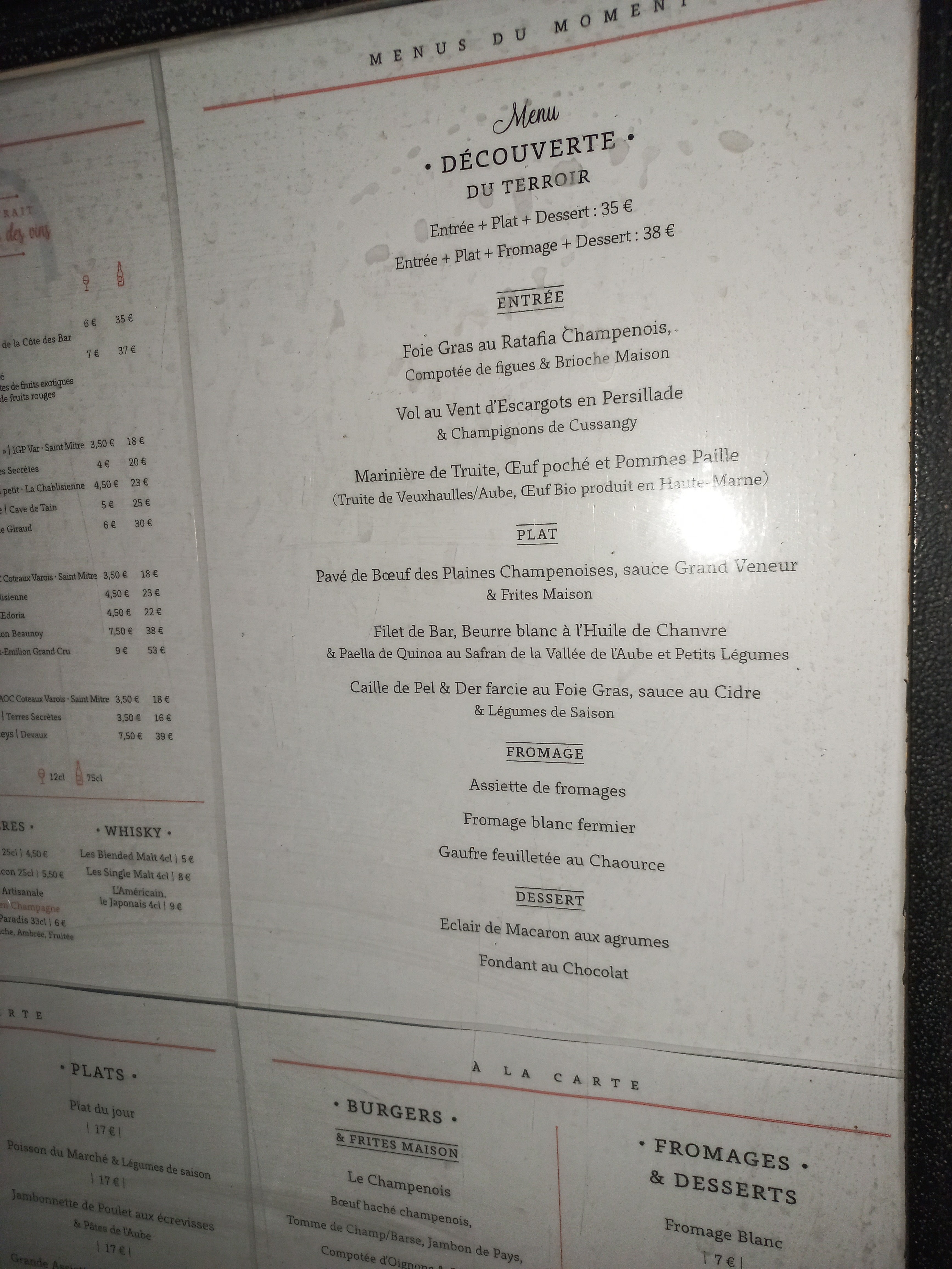 Une excellente découverte ! Contrairement à certains avis que j’avais lu, le service est irréprochable, souriant et bienveillant. La carte est variée. J’étais hésitant car impossible de trouver une carte en ligne mais je confirme ce qu’on peut lire dans les autres avis, un menu 2 services dès 16€ et un menu 3 services des 22€ ! La carte des vins est juste extra ! Je recommande sans hésitation !