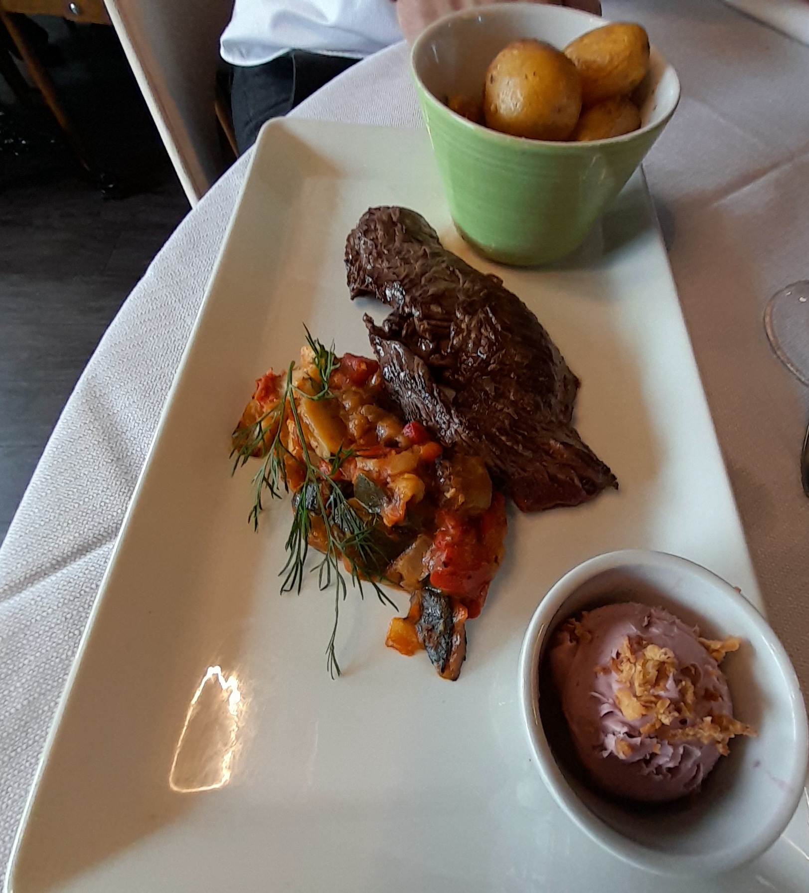 Posté le 02/03/2023 à 18:30"Bien, mais j en attendais plus, la bavette était bonne, mais j en attendais plus de saveur. Les légumes un peu trop cuit. Dessert bien mais pas excellent."