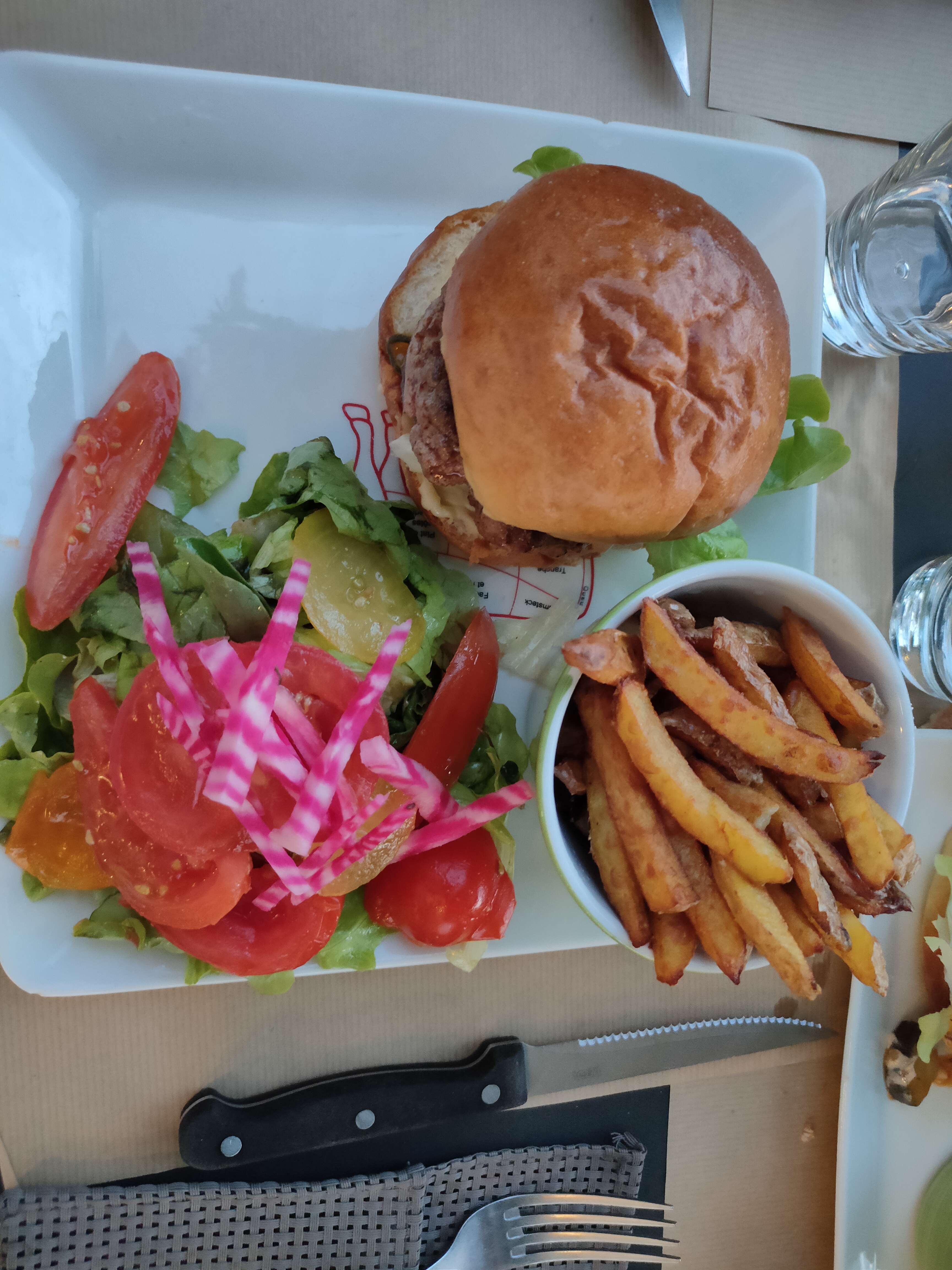 Posté le 20/08/2022 à 15:25"Un régal. J'ai commandé un burger végétarien et je trouve ça super qu'une option végétarienne ait été pensée au pays du bœuf. Le burger était délicieux, le beurre persillé parfait. L'accompagnement était tout aussi copieux. Le cuisinier ne lésine pas sur les quantités. Enfin, le serveur a été agréable et très pro, nous a donné un couvert pour bébé et a fait réchauffer son plat. Nous n'avons pas attendu très longtemps. Ce restaurant est une petite pépite et j'espère vivement y retourner"