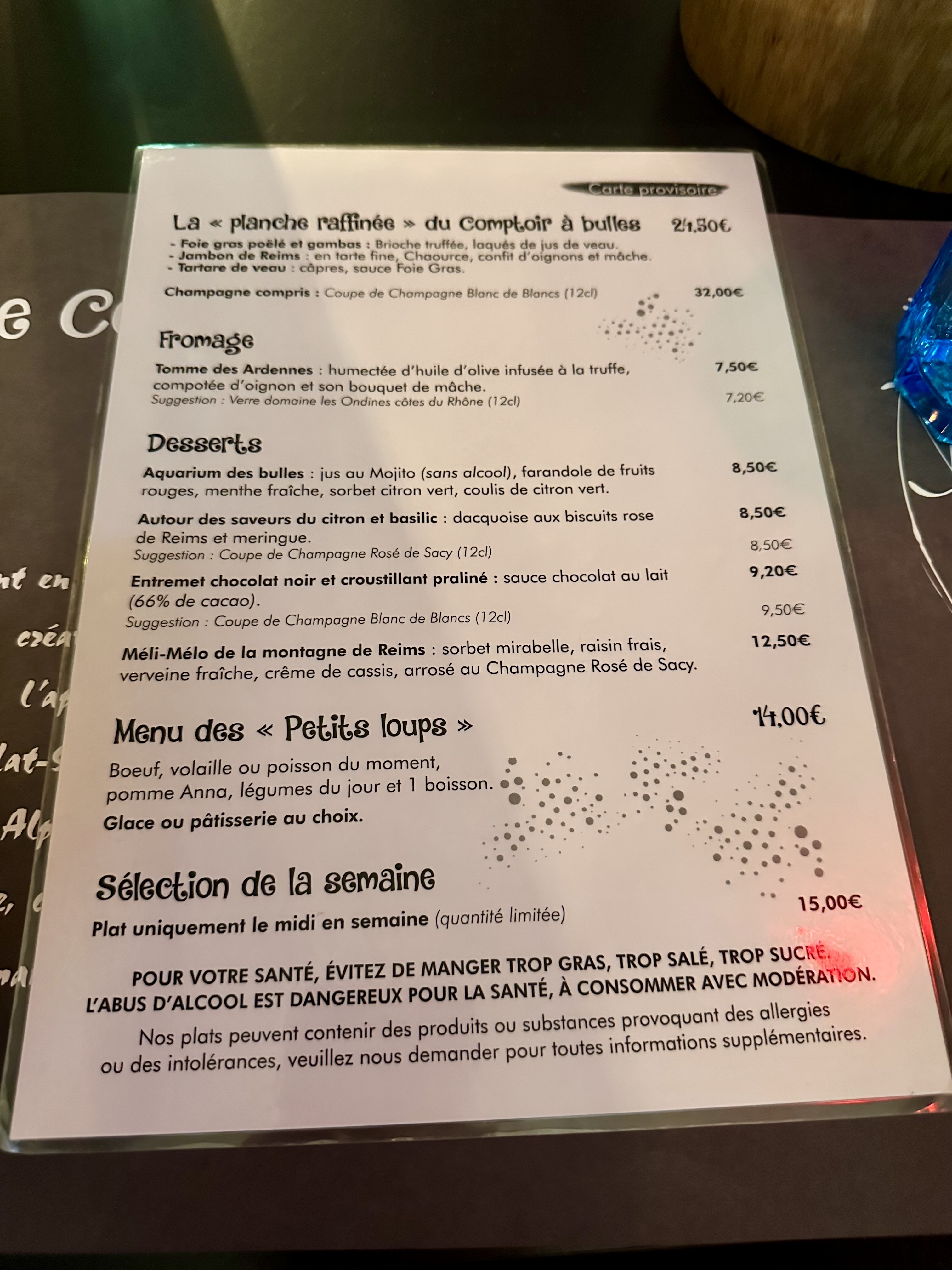 Très bon ! Les plats sont d’excellentes qualités et ça vaut bien son prix ! Le personnel très gentil et généreux, mettent une bonne ambiance, n’hésitent pas à nous donner des conseils sur le choix des champagnes. Vraiment très bien, si nous retournons vers Reims, nous reviendrons !