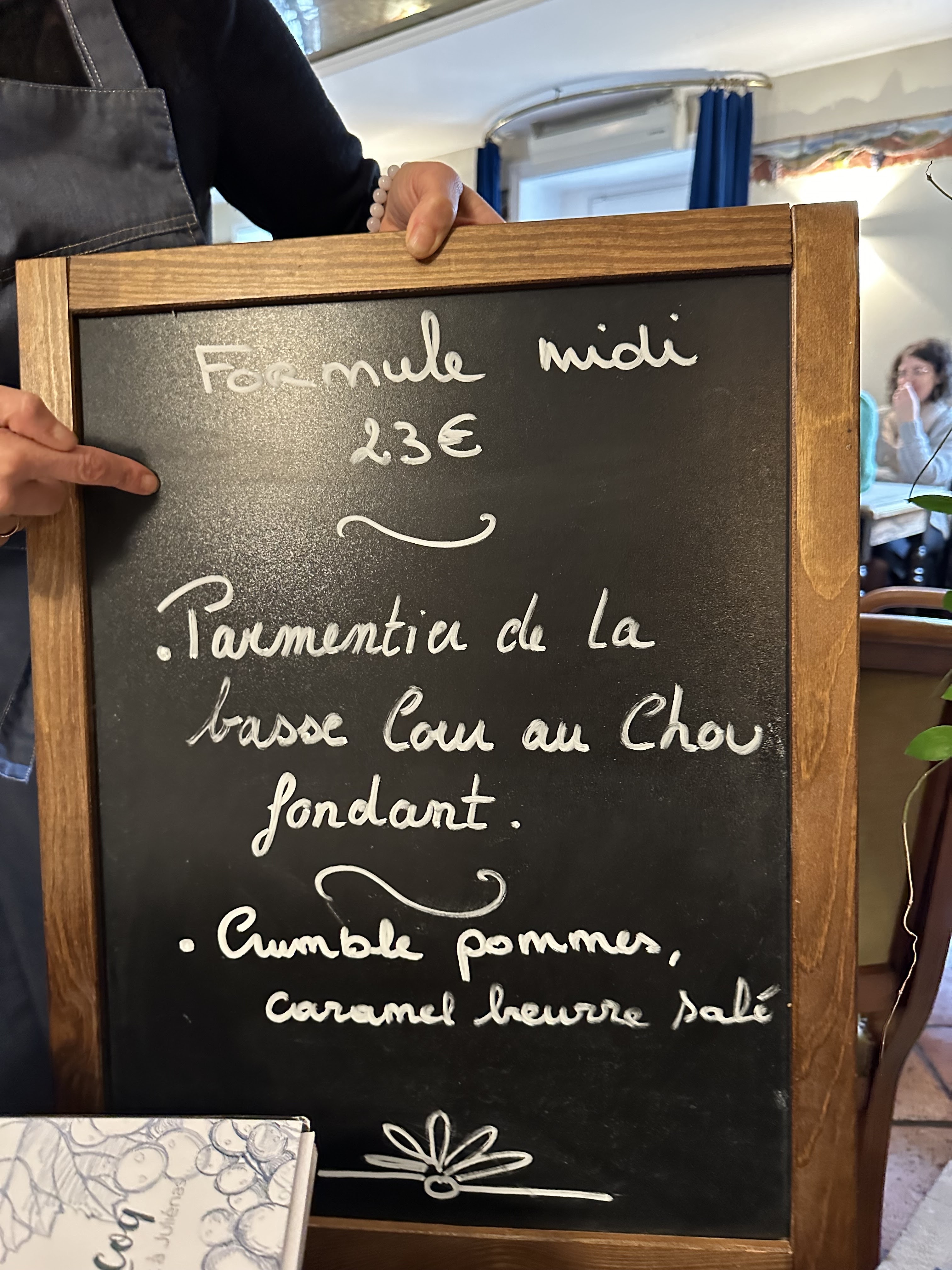 Posté le 27/10/2024 à 20:09"Finalement un peu déçus. Compte tenu des prix affichés, nius nous attendions à un semi gastro. Le bon point des vrais plats de terroir. Dommage le coq au vin était en deçà des attentes. La viande était vraiment sèche et portions correctes sans plus. Bonne purée..mais c est de la purée. Etc...le Coq au vin de ma.grand mère restera inégalé. Une petite mise en bouche pour patienter aurait été un plus. Service un peu long au début pour apporter le vin local. Desserts ok. Détail. Pour une table de 3, au moment d apporter l addition, ne mettez pas 1 mais 3 morceaux de chocolat. On ne vient pas pour ça mais le diable est dans les détails. Salle bruyante."