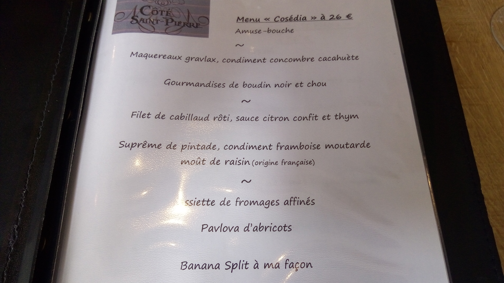 Testé le restaurant ''Côte Saint-Pierre'' un soir en semaine avec leur formule 3 plats pour 33 euros. La cuisine est de qualité Le service fut un peu long (près d'une ½h pour commander - lors de la réservation on m'avait prévenu que ça pourrait être un peu long).
