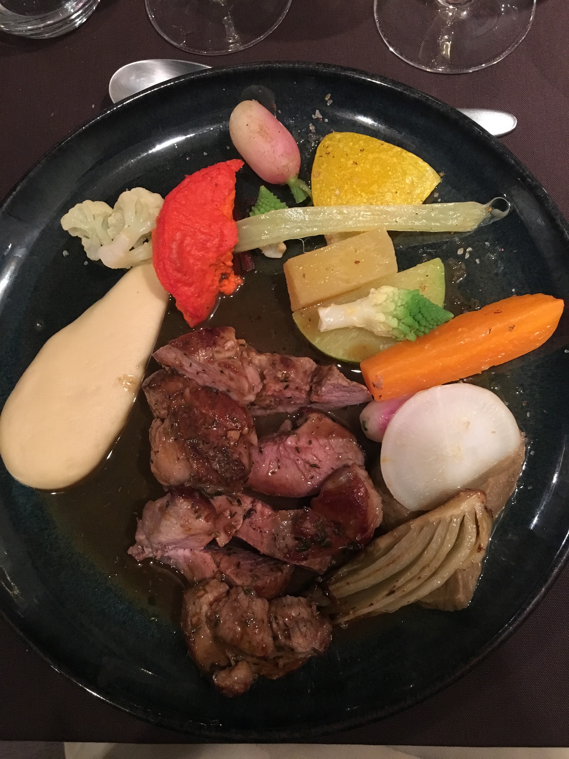 Je ne comprend pas l orientation choisis, nous avons mange a notre grand étonnement japonnais ce soir la, la viande proposée. Le plat n était pas mauvais, un canard laque et nouille sans plus, si je veux manger asiatique, je sais ou aller et je n étais pas venu pour ça. Il faisais froid dans le restaurant. Un vrai pincement au cœur, nous adorions ce restaurant a la fois traditionnel et novateur. Le serveur toujours au top.