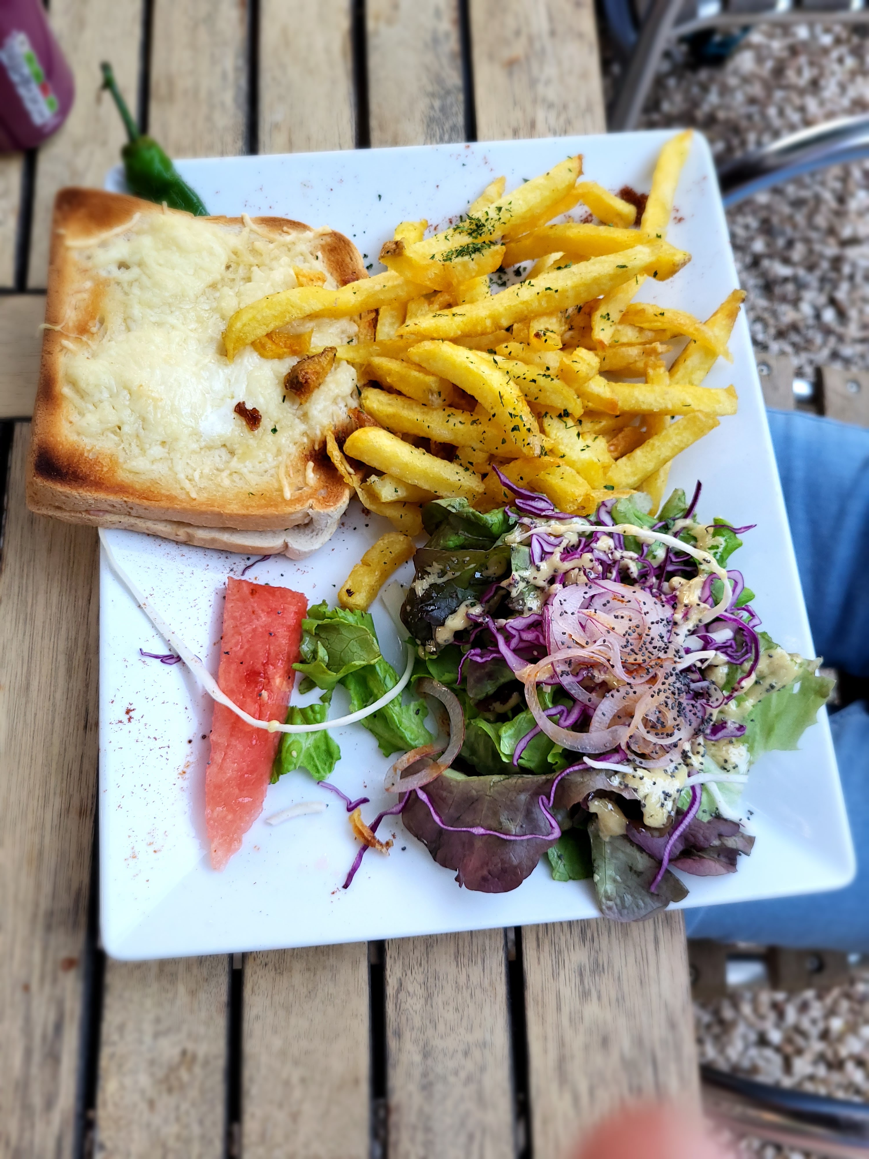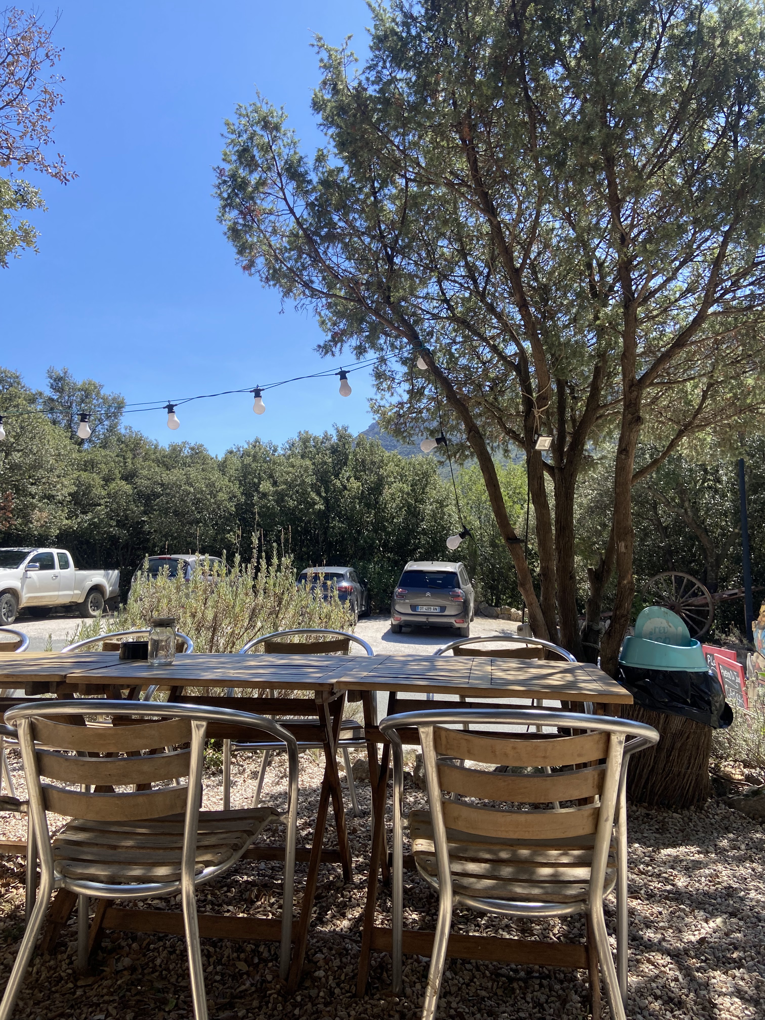 Frites maison, pain burger artisanal, bière locale… jolie terrasse en étages sous les chênes, super accueil… hamac pour la sieste après le déjeuner, dommage il faisait un peu frais 😬nickel 👌
