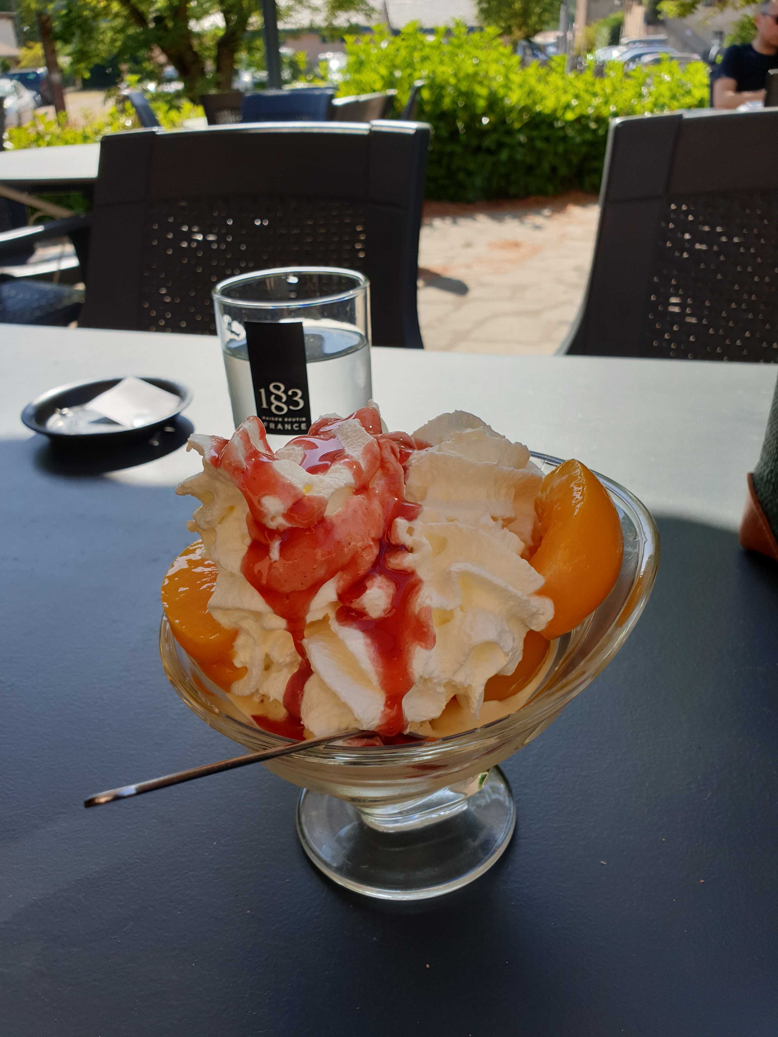Sympa 🌞 ombragé heureusement vu la chaleur Dégustation de glace ... très bonne et à prix très honnête 6 euros 50 la pêche Melba Eau pour le chien ! Cool Aimable