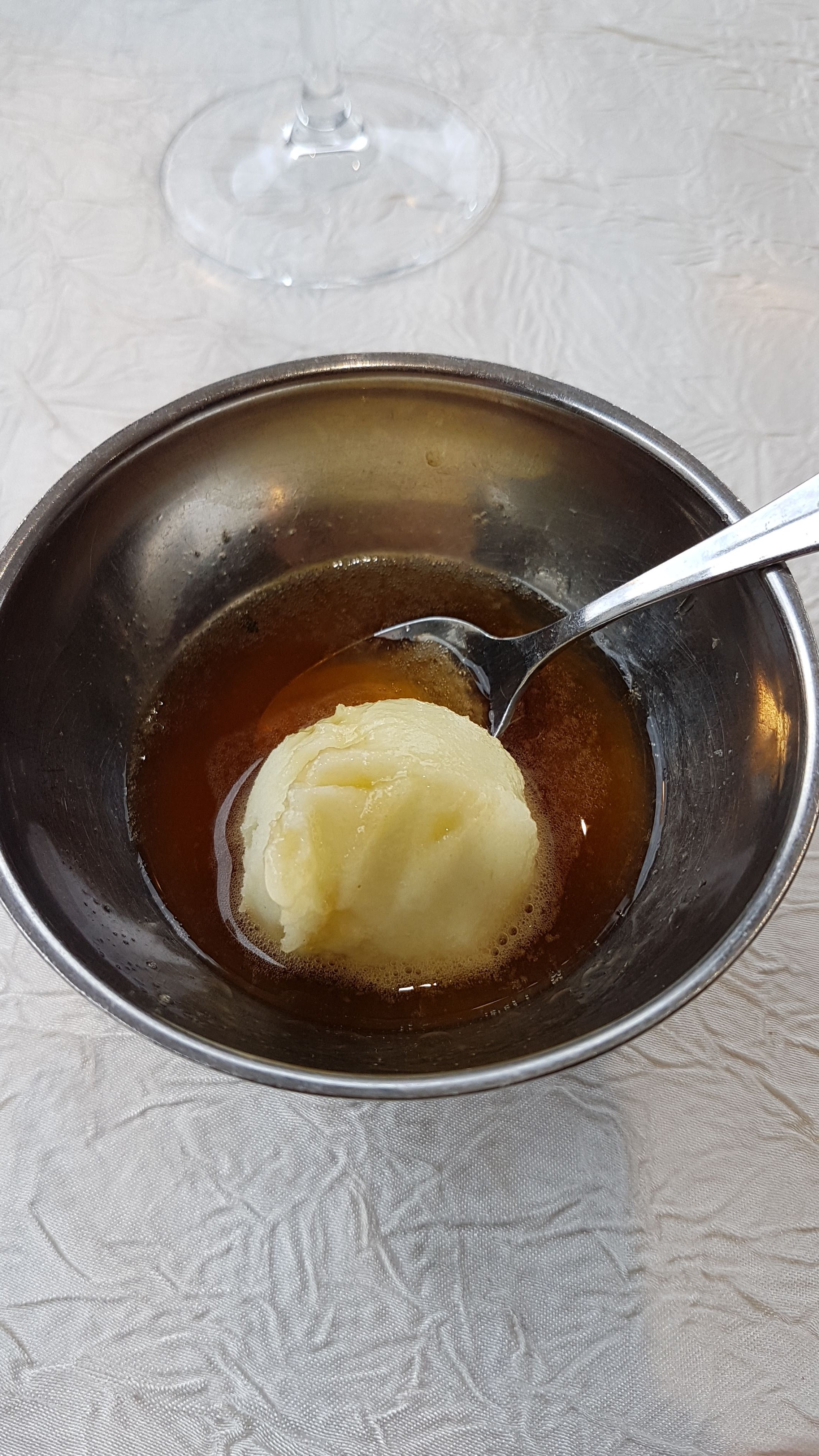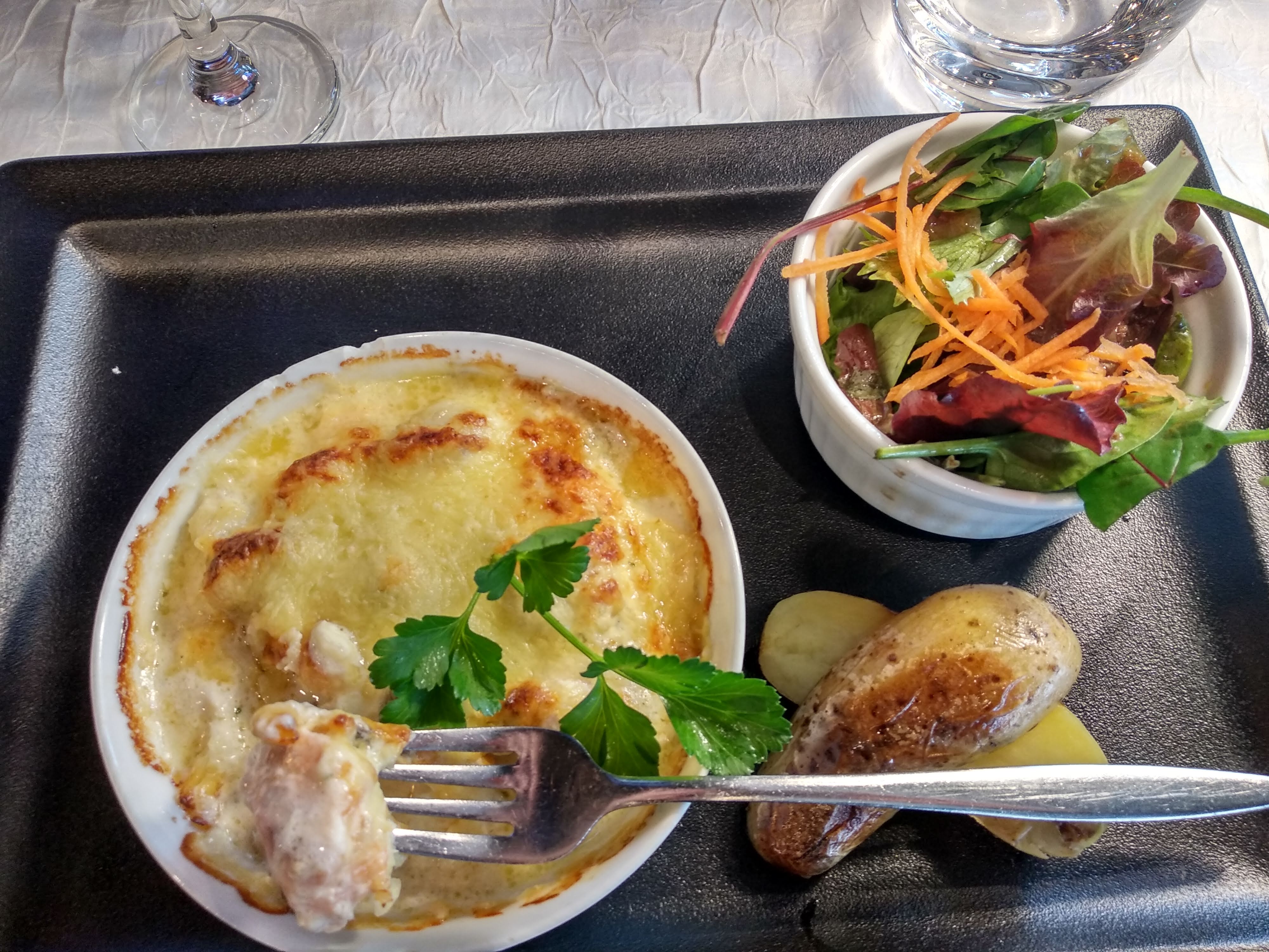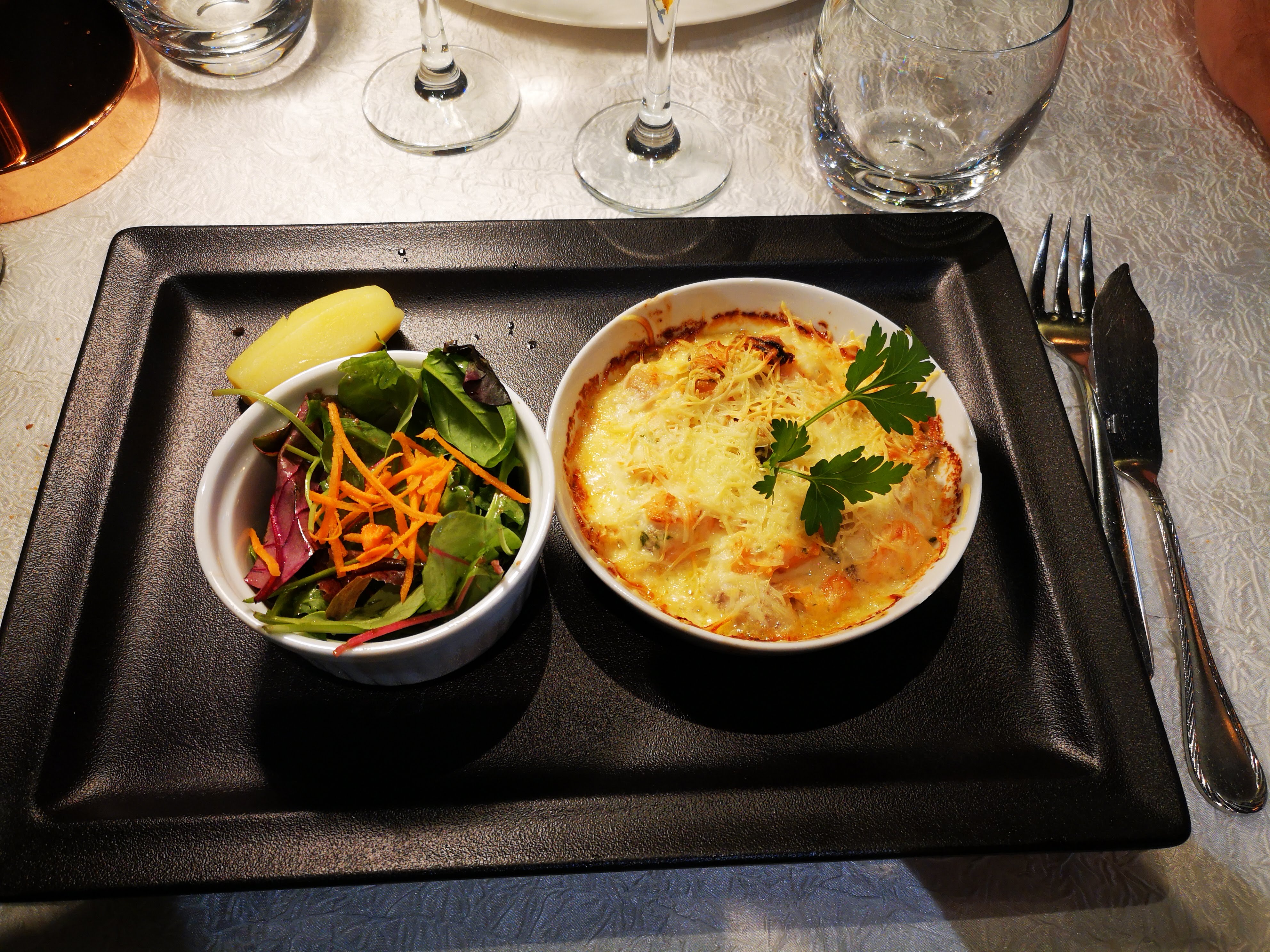 J’ai pris deux plats à la carte : Des huîtres chaudes au sabayon et champagne et une choucroute de la mer. Je n’ai pas aimé les huîtres, je ne pense pas que ça vienne du plat en lui même, mais de moi. La choucroute de la mer était bien garnie. J’ai compté six poissons différents dont du rouget, du bar, du saumon, de la sole, du haddock, avec des moules et une grosse crevette rose