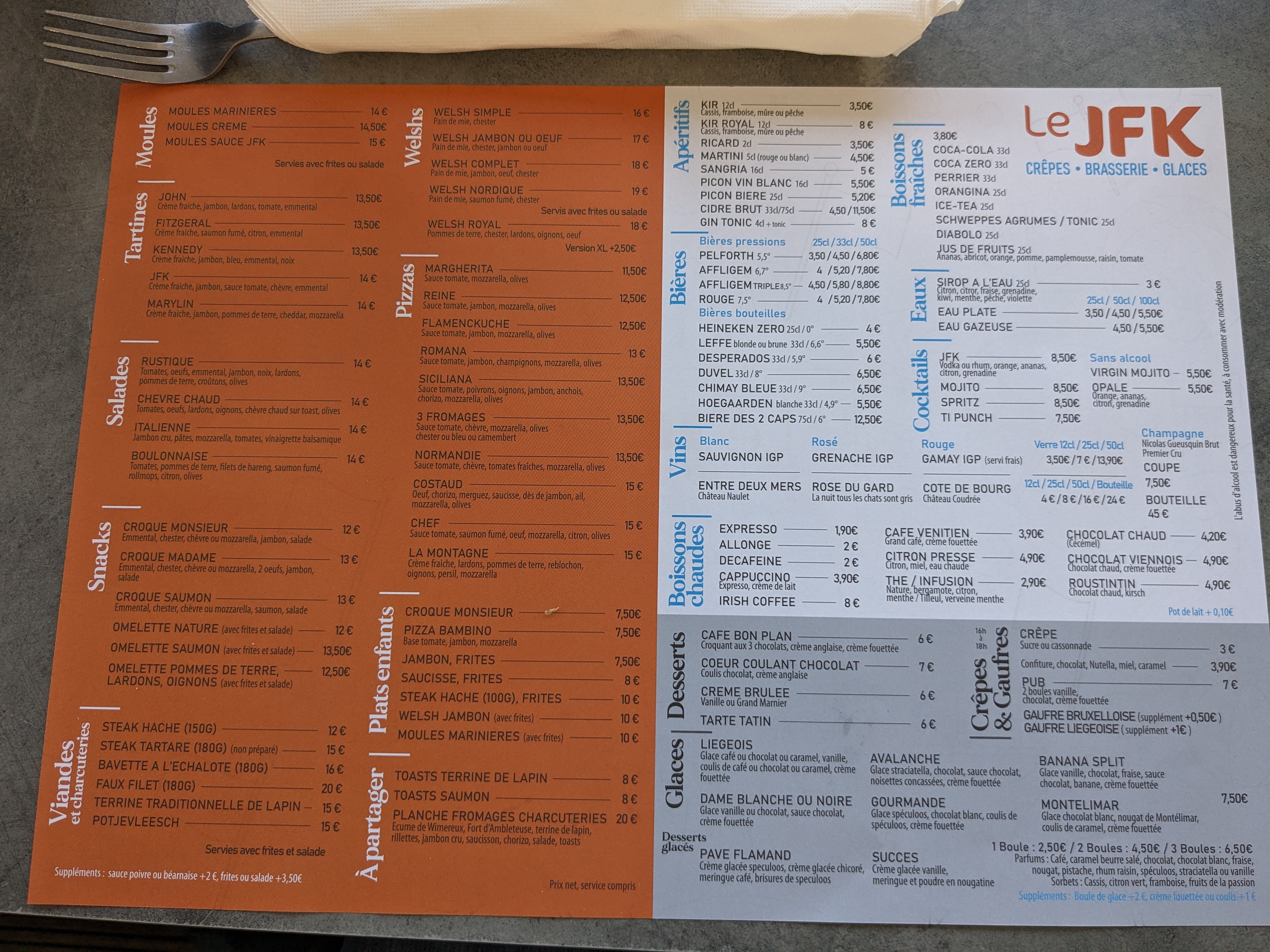 Heureusement que le restaurant d à côté, n avait plus de place pr nous, on a été bien accueilli par l équipe du JFK, très bien mangé aussi, prix raisonnable, on y retournera ss hésiter.