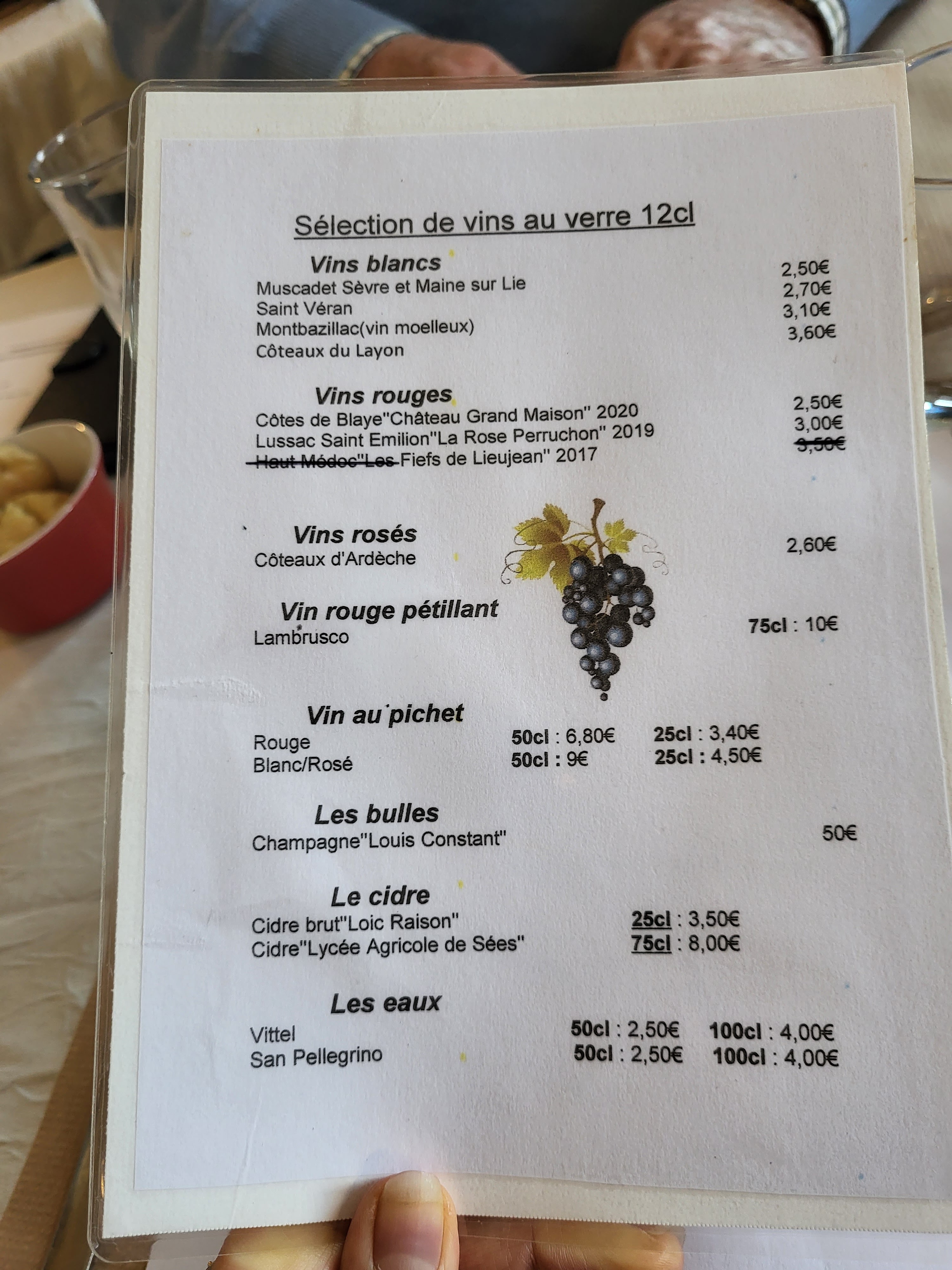 Excellent rapport qualité prix, trois entrées au choix, deux plats du jour, fromage au plateau ,dessert (3 au choix) tout est maison et frais. Bien cuisiné cidre ou vin compris. Le tout pour 13€. Je recommande vivement.