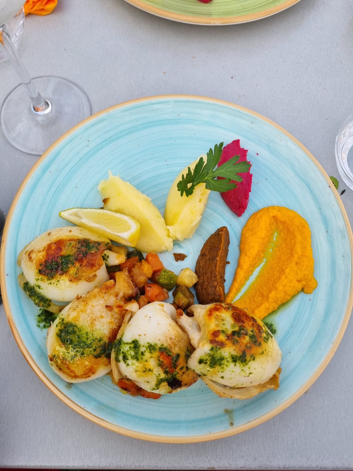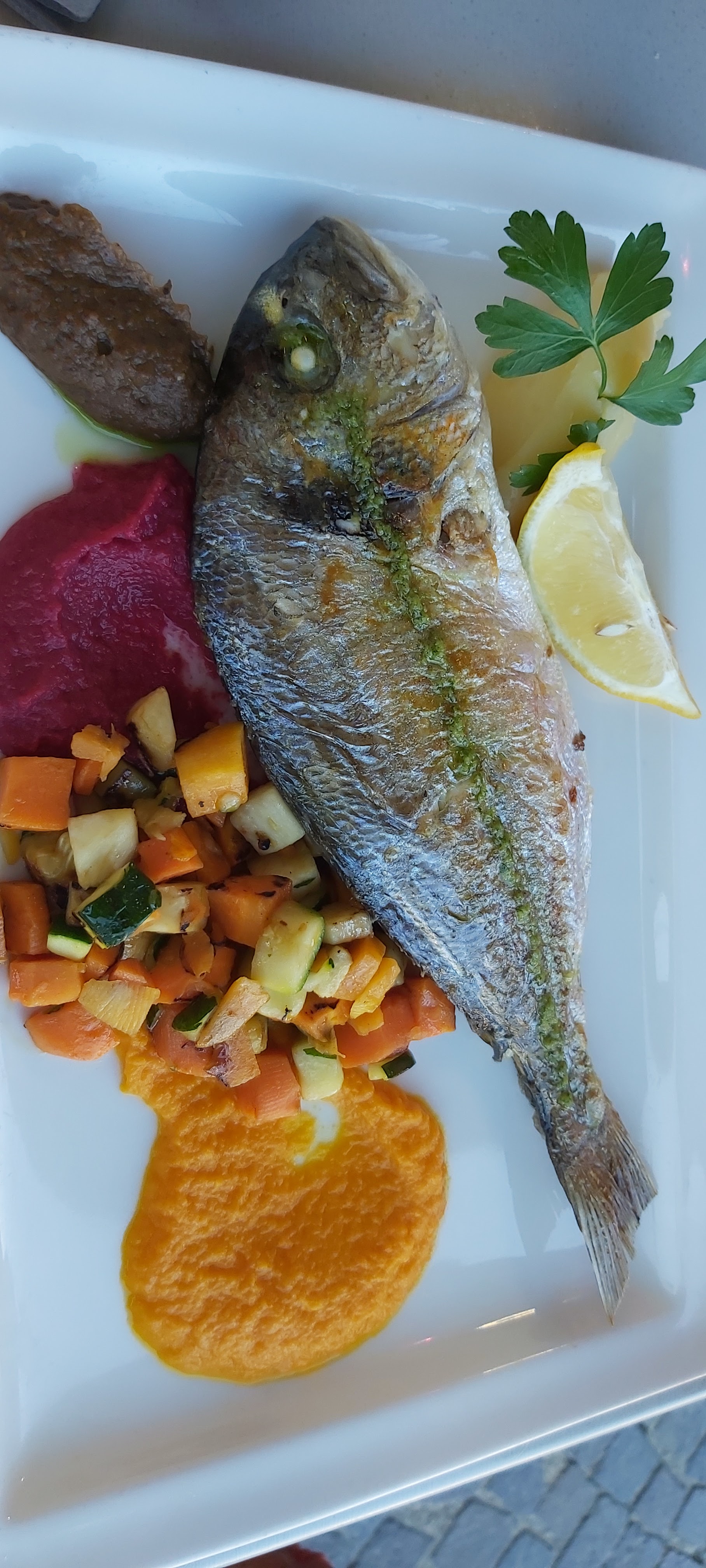 Filets de daurades et seiches très bien cuites et goûteuses. Belle présentation