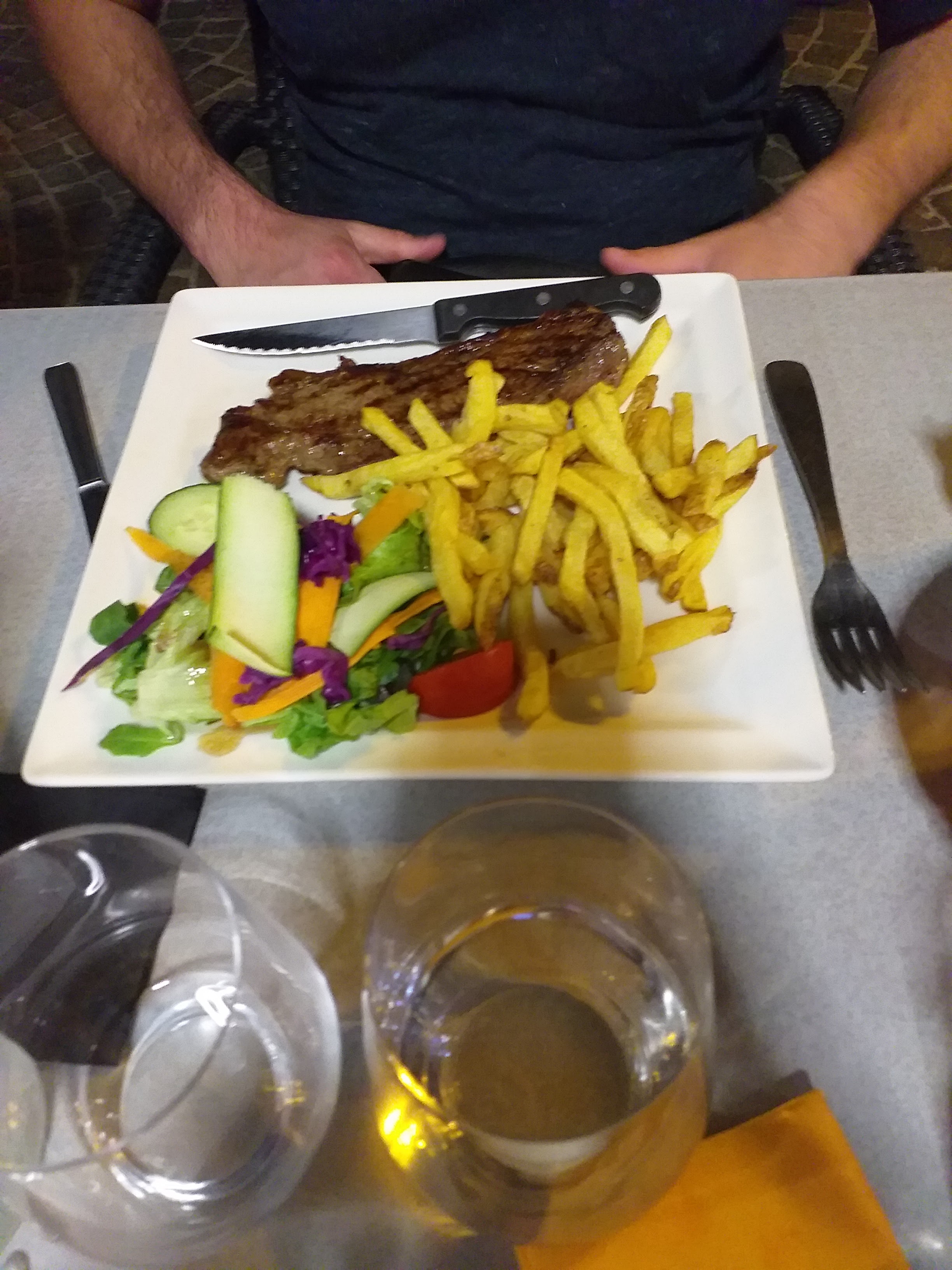 on cherchait un restaurant car il y en je ne sais combien au alentours on s’est arrêté dans celui ci par hasard hier soir et bien c’était excellent service parfait serveur/se très aimable j’ai pris pièce du boucher cuisson parfaite je recommande juste un petit cher mais excellent👌🏽. je recommande.