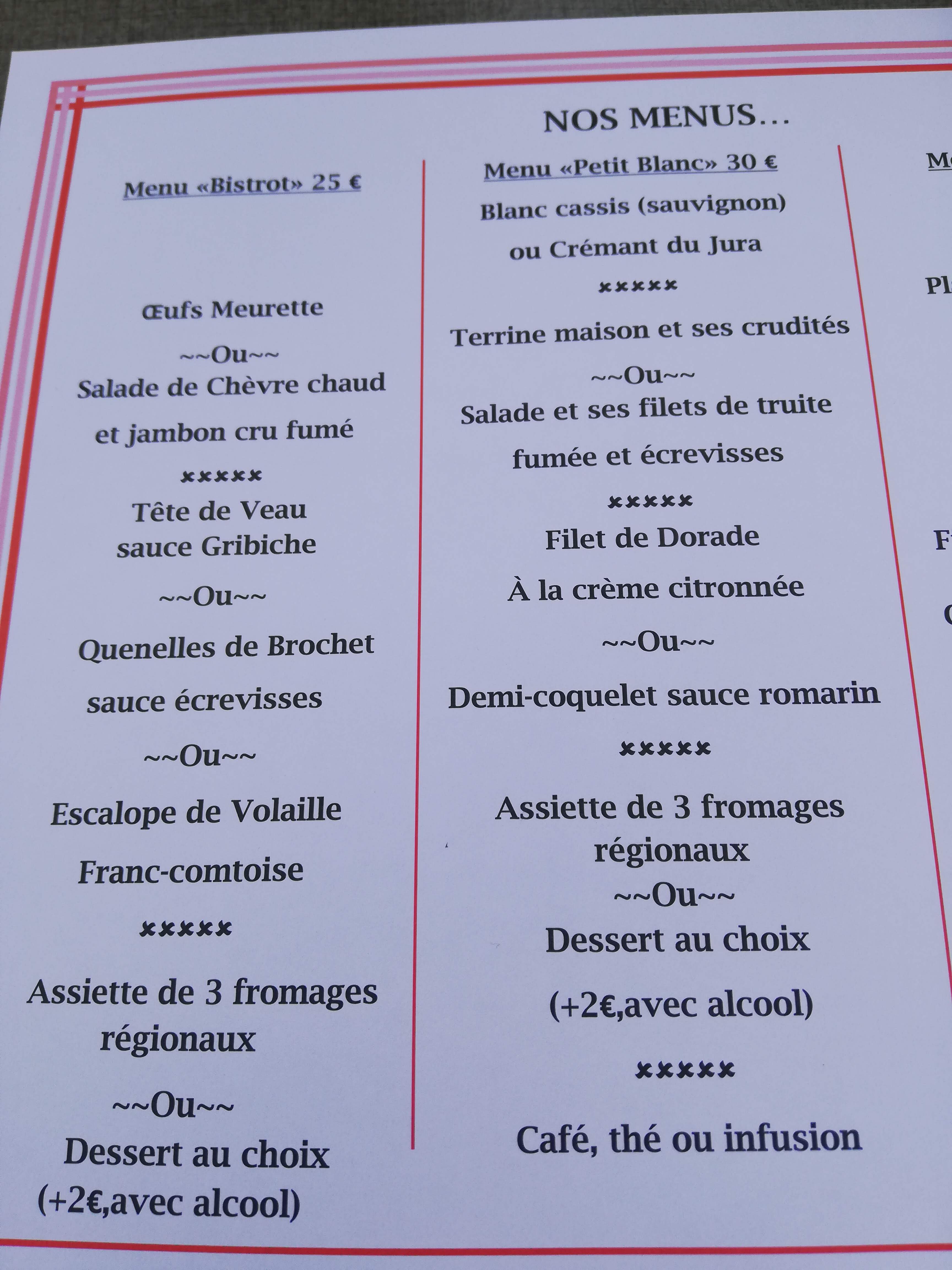 belle salle accueil souriant nous avons appréciés le menu bistrot à 26 euros les oeufs meurettes parfait la tête de veau sauce grébiche cuite comme à l'ancienne souvenir d'enfance superbe et en dessert une faisselle parfaitement assortie à un coulis de fruits rouges délicieux et gourmand. Ce petit repas accompagné d'un excellent arbois ploussard 2018. Ainsi que le second menu Terroir à 36 euros avec une copieuse salade de truite fumée et écrevisses suivi d'un formidable coq et morilles au Vin Jaune et pour finir une petit de fromages du pays et un nougat glacé au coulis fruits rouges et tout cela accompagné d'un sauvignon blanc... Nous avons appréciés le service effectué par Mickaël ainsi que sa petite collègue pour leurs gentillesses et leurs sourires..; Un restaurant a retenir si vous passez par Salins les Bains et les toutous sont acceptés... BON APPETIT A TOUS