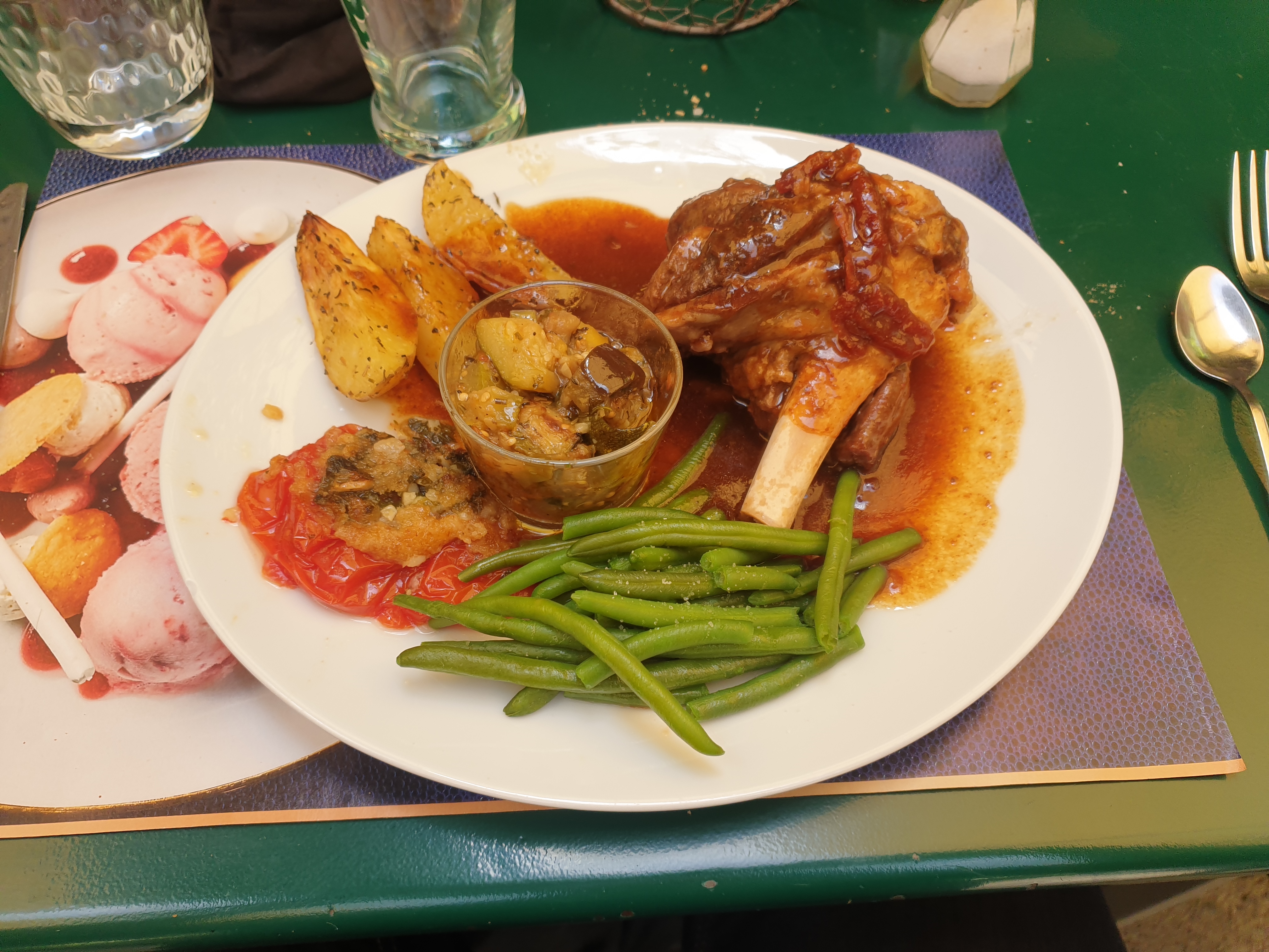 Plat Souris d’agneau et andouillette Dessert baba au rhum maison Manger sous la tonnelle au milieu des plantes ,un cadre idyllique. À recommander.