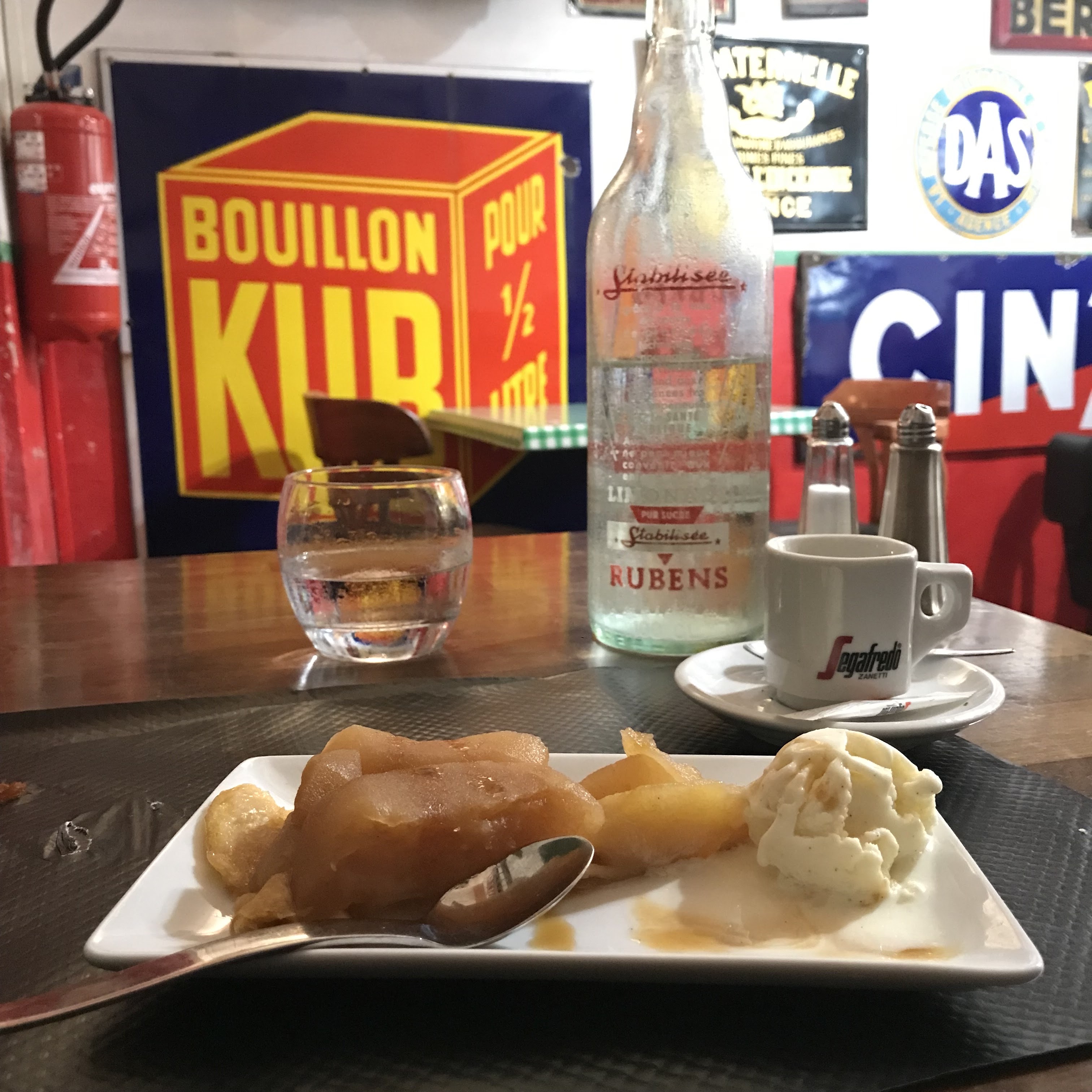 Vaut le détour pour la déco murale. Bonne cuisine du midi en semaine. Musique d'ambiance années 60 70. Service sympathique. La plupart des déserts sont excellents. Souvent du monde.