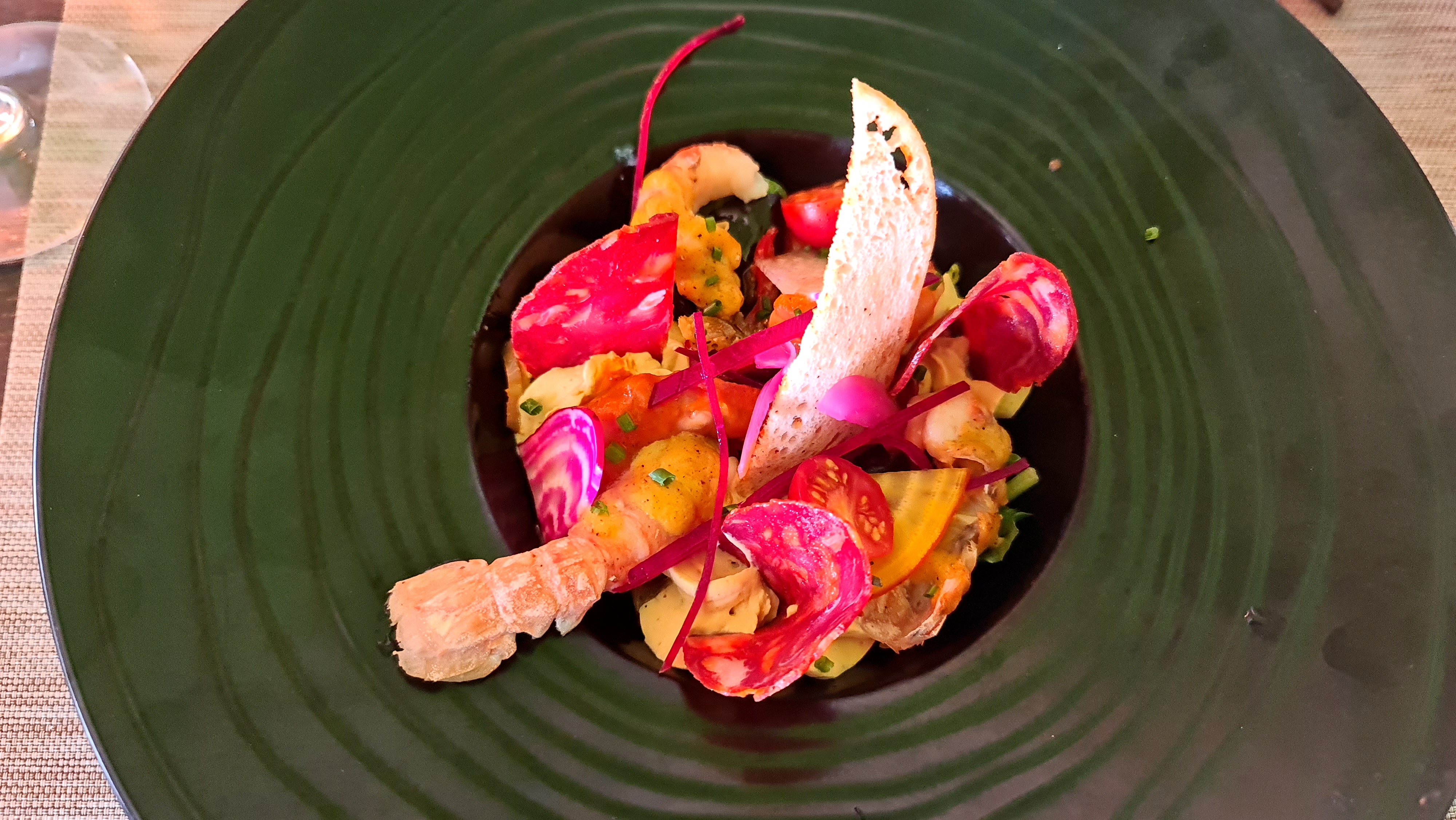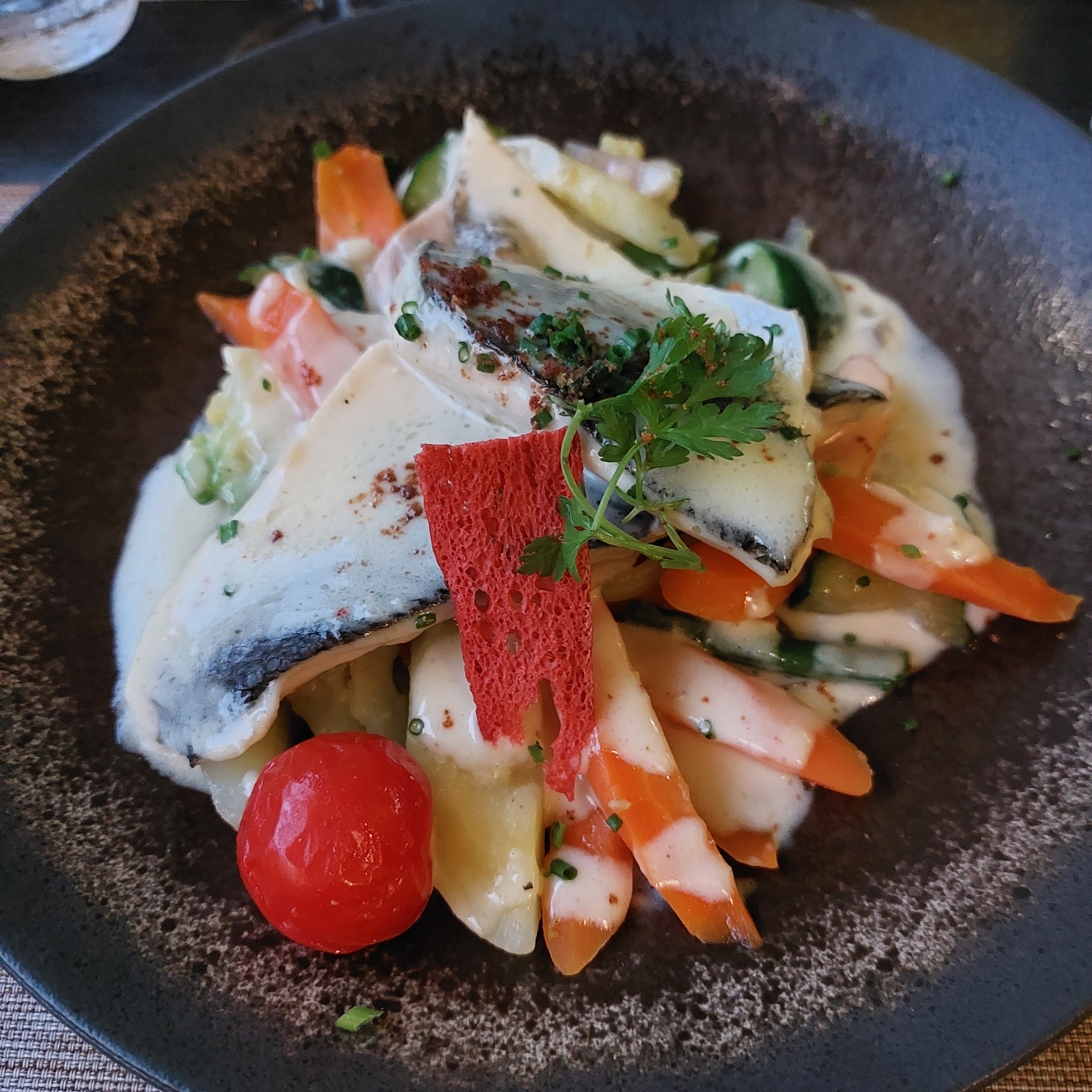 Alors là, 5 étoiles ne suffisent pas!. Excellent rapport qualité / prix. Tout y est: un accueil au top de la part d’un personnel dans son ensemble attentif et aux petits soins avec nous (souci de santé). Un établissement élégamment décoré, parfaitement nickel des cuisines que l’on peut voir de la salle jusqu’aux toilettes. En bonus, des plats copieux composés de produits frais, d’un mélange de saveurs choisi et réalisé de mains de maîtres. N’hésitez pas à vous y rendre et pensez à réserver avant car l’enseigne est connue dans le secteur!. Le plat en photo est « saumon Gravelax », salade composée d’un mélange de saumon cru, de mangue et de tout un cocktail de crudités délicieuses. J’ai rarement goûté un met aussi savoureux.
