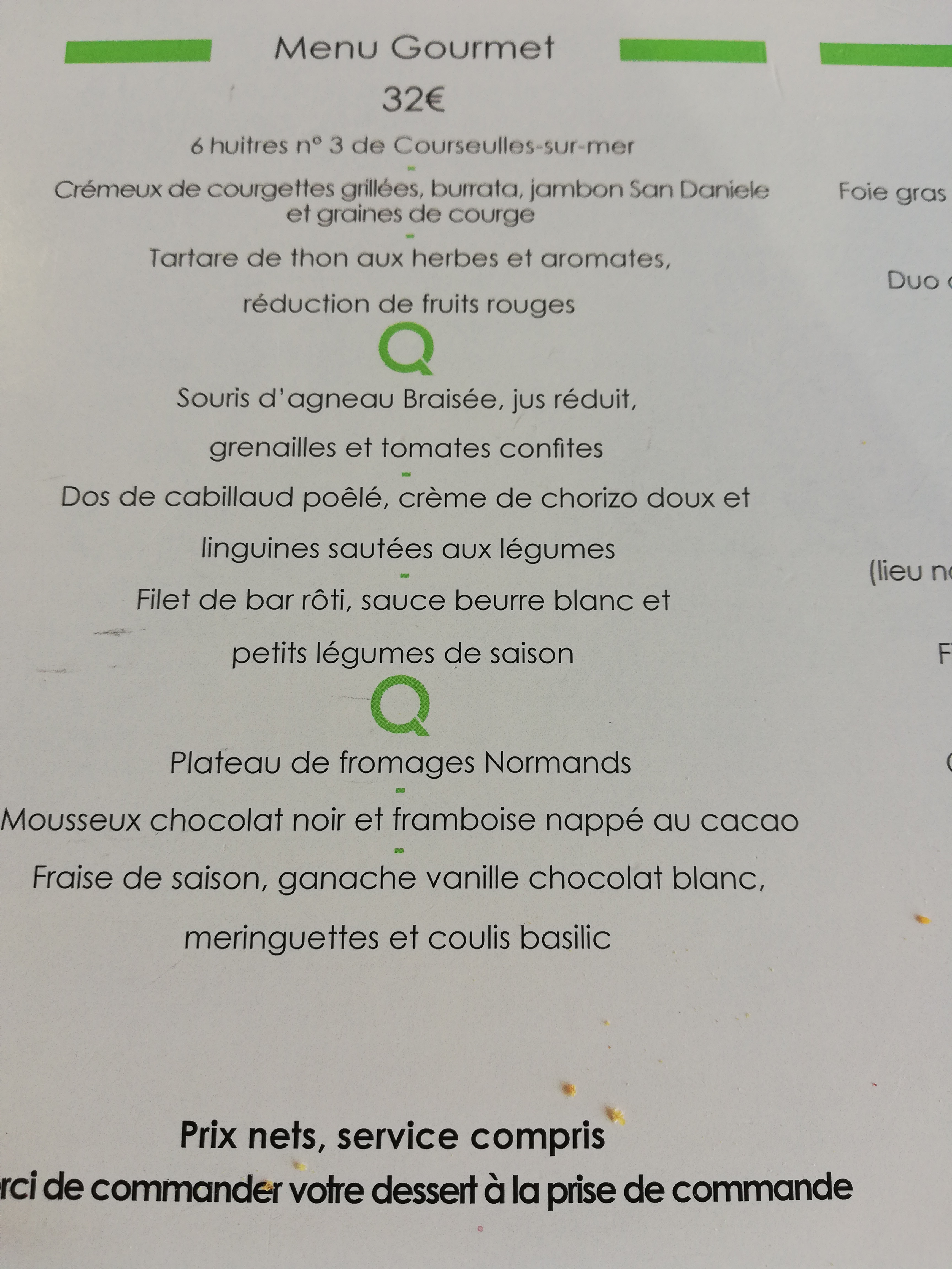 Très bon acceuil, très bon choix de menu (rapport qualité/prix), personnel très chaleureux et professionnel qui n'hésite pas à conseiller sur les choix de plats et des boissons. Bonne adresse si vous passez par Courseulles !