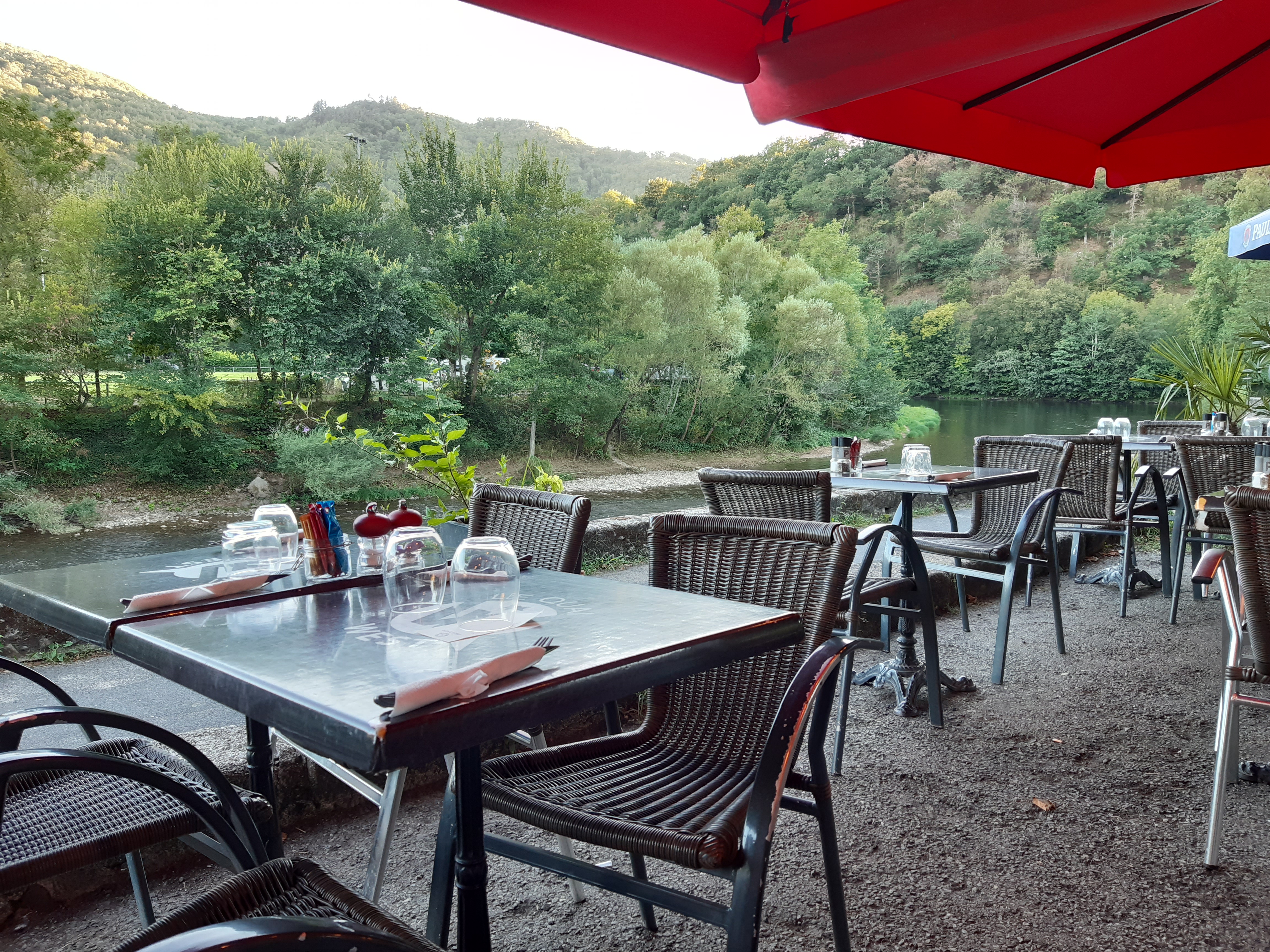 Terrasse ombragée qui domine le Lot. Personnel sympa. Un bon moment de détente. Bon rapport qualité/prix