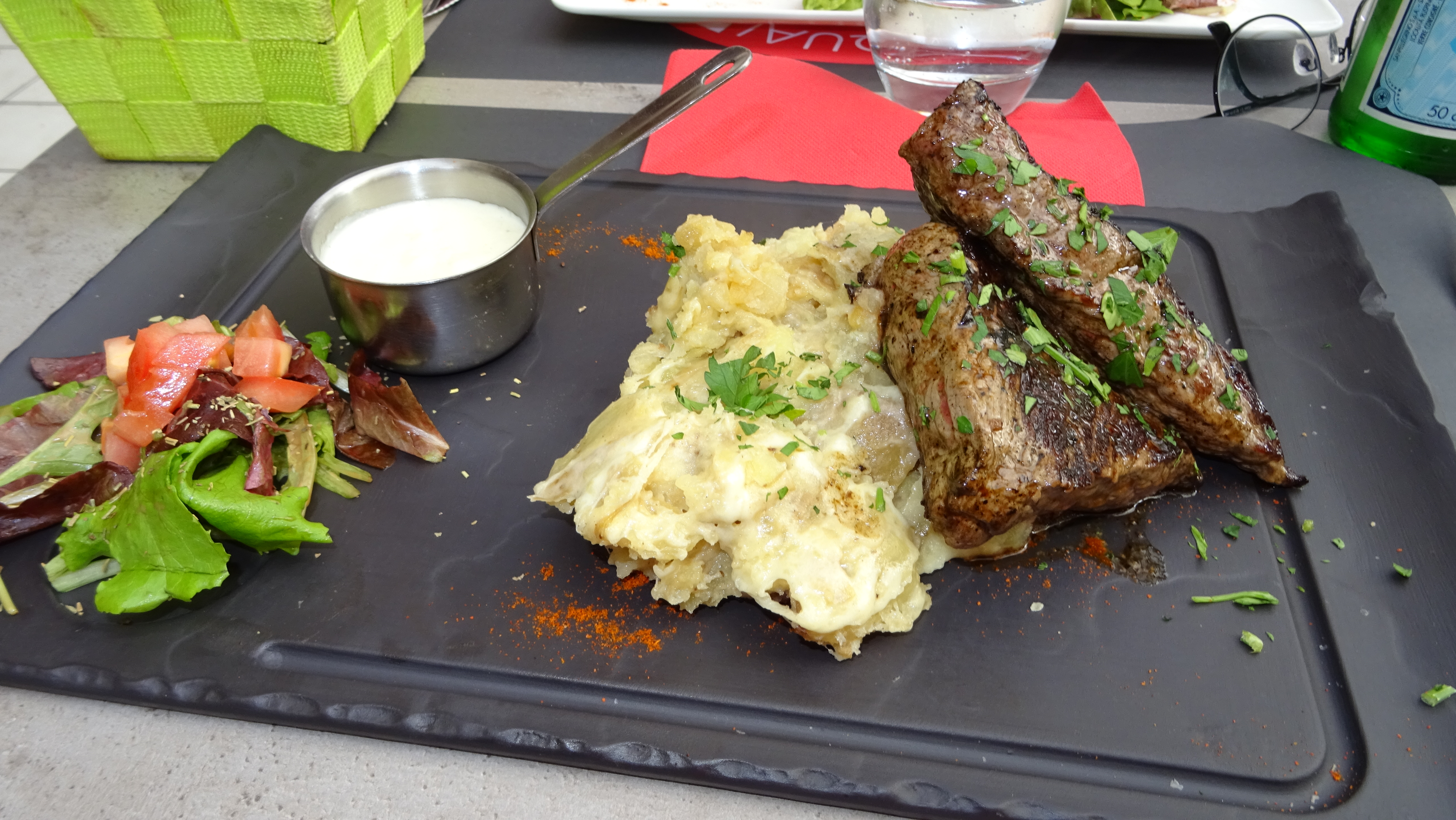 j ai réservé le matin une table pour le repas du soir. je me retrouve au fond du quai alors qu il y a des tables juste devant bien éclairées. l entrecôte est de bonne qualité bien servie avec des frites. pour ce qui est de l aligot saucisse .l aligoté n à aucun goût et semble fait avec de la purée en flocon. pour le dessert le Caffè liégeois est réalisé avec des glaces bas de gamme. même pas de café à l intérieur.la crème brûlée est lourde et grasse . bref c est un restau pour touristes à éviter même si les serveurs sont sympathiques. il y a bien mieux localement.