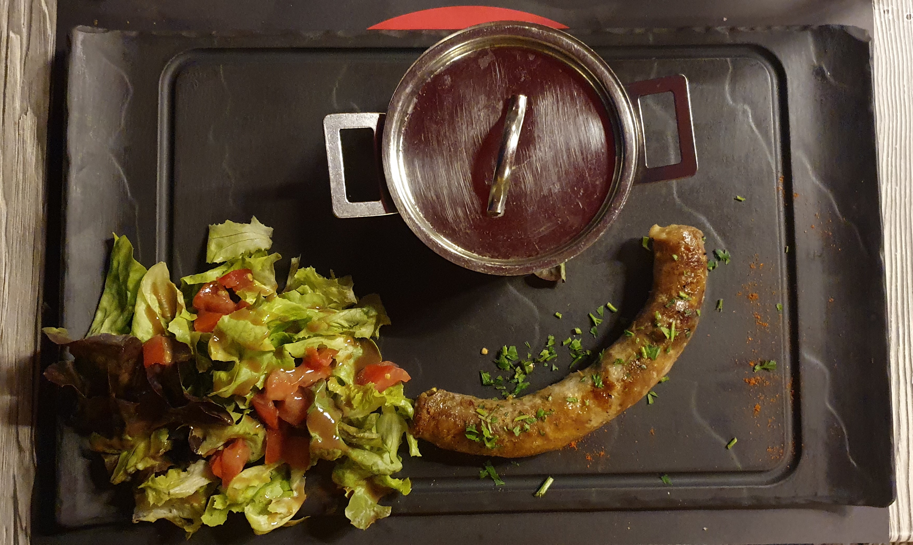 Excellent accueil. Nous étions passé le matin pour prendre un café. Nous y sommes revenus pour déjeuner. Nous avons partagé 1 mètre de saucisse avec frites et aligot à volonté. Tout est frais. Les frites sont excellentes et l’aligot est certainement un des meilleurs que nous ayons eu à déguster (et nous en avons dégusté beaucoup). Le cadre est en plus très sympa avec une décoration chaleureuse et soignée.