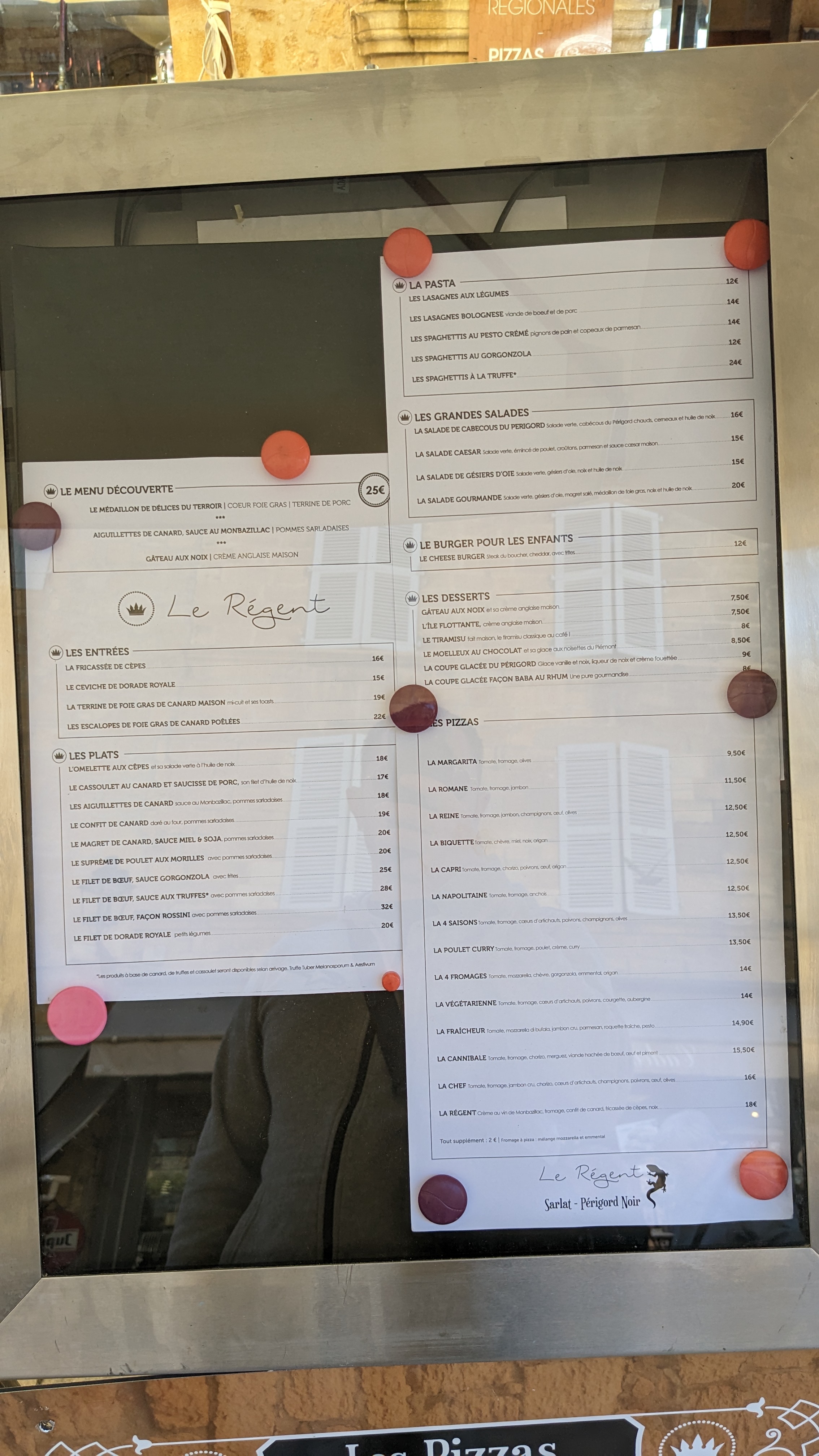 Certes Sarlat est une très belle ville au patrimoine architectural préservé époustouflant.Les choses se compliquent lorsqu'il s'agit de trouver une bonne table avec un rapport qualité prix correct car entre l'offre de restaurants et les magasins de produits régionaux, on a parfois l'impression de respirer l'atmosphère de Lourdes.C'est au Régent que nos pas nous conduisent; Repas correct sans plus, prix raisonnables pour un site hyper-touristique. C'est le serveur qui assurément arrivera a vous faire passer les petits désagréments que vous pourriez rencontrer lors de votre repas comme les conversations (trop?) décontractées salle-cuisines audibles de la salle.