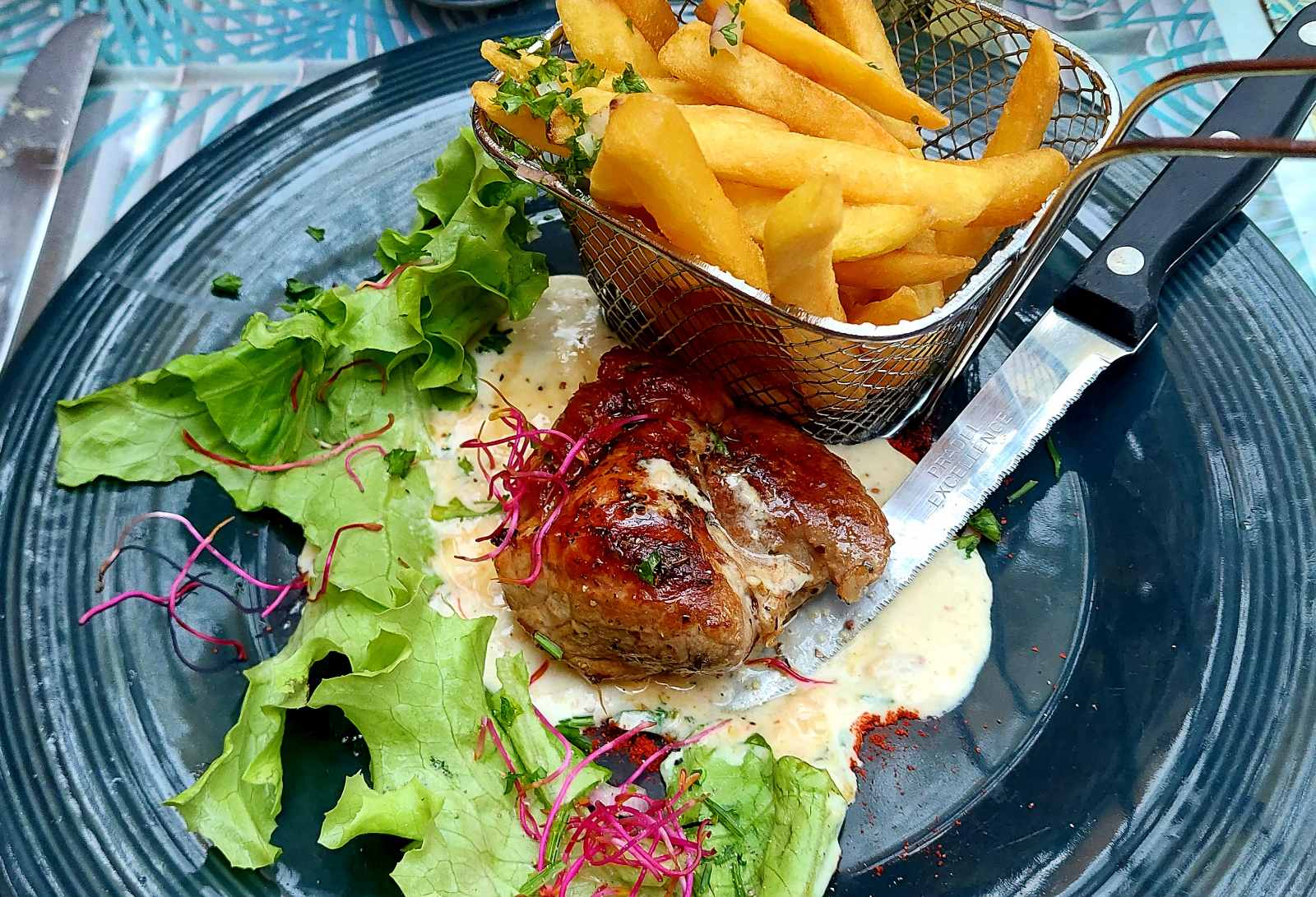 Fuyez ce lieu où les frites sont à base de purée, les haricots verts sortis d'une boîte de conserve, la glace au cheveu , le pain du super U local et un temps d'attente infini pour être servi... Et en dessert, une minuscule crème brûlée (diamètre intérieur du contenant 4cm et épaisseur de la crème 1cm... Bon appétit... En dernière réponse à la vôtre : je sors de chez vous et je confirme que votre frites n'en sont pas et que vos haricots verts sortent d'une boîte de conserve. Faut pas prendre les gens pour des andouilles monsieur le cuisinier