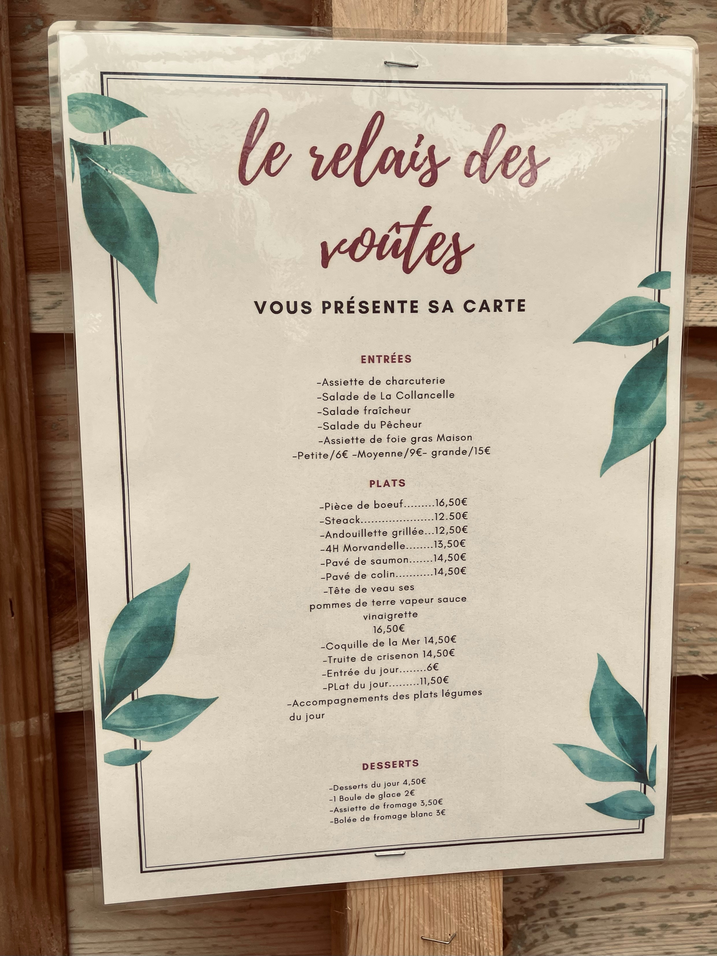 Bof bof !!! J ai Manger en extérieur mais enfermé par des cloisons de bois ! Choix du plat du jour limite langue de bœuf ou tripes... donc j ai pris a la carte les 4h maurvendelle jambon crus pas du Morvan , omelette bien bien cuite au patates , frites salade et fromage blanc pas de ferme sans crème ni sel poivre ou sucre déçu dommage pour un endroit ou beaucoup de vélocycliste passe et dommage pour la gastronomie française .