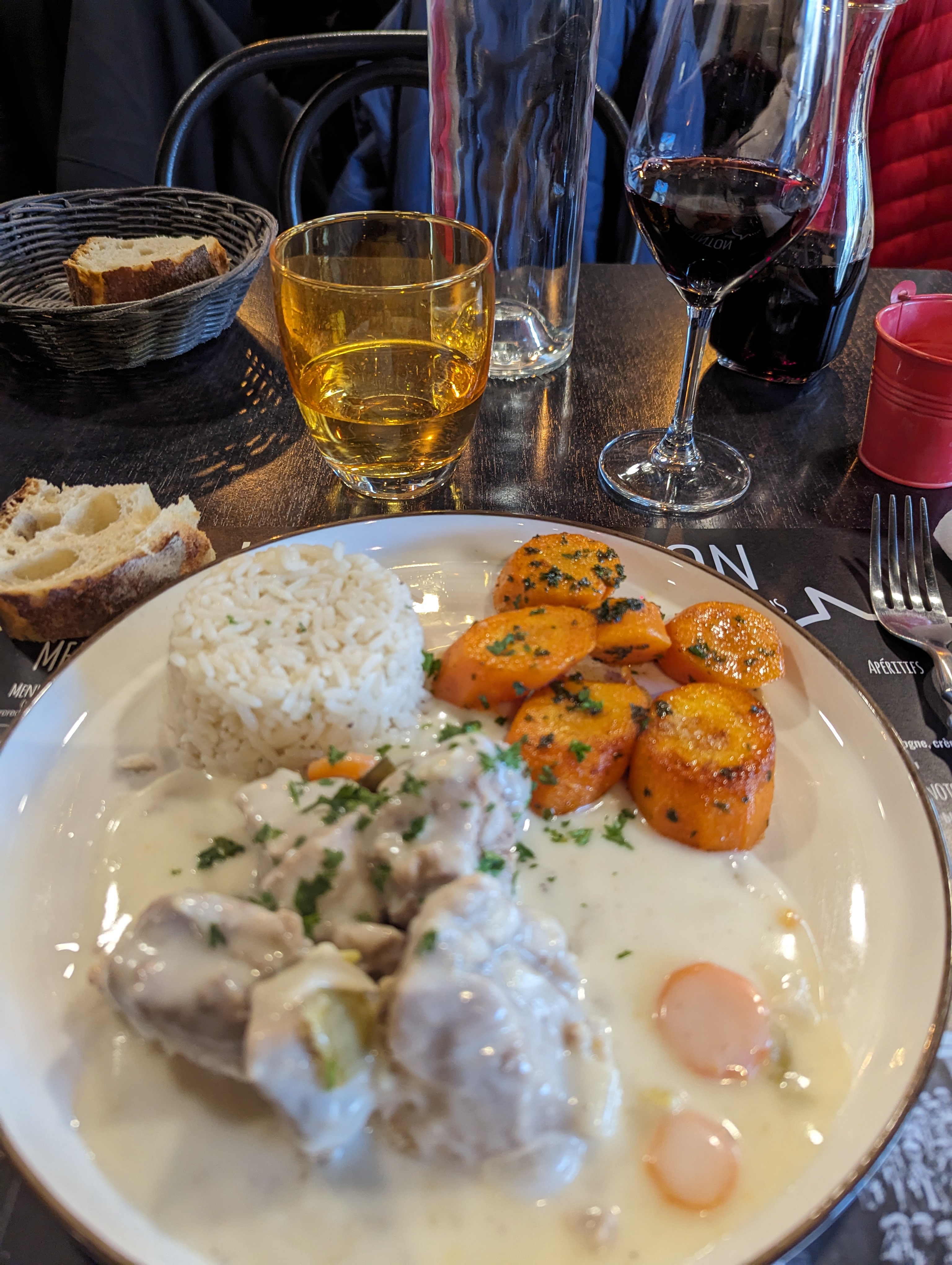 Posté le 26/12/2023 à 18:37"Nous avons déjeuné ce midi à trois en prenant la formule du jour : beignet de poisson et salade, paleron /purée, dessert ( tarte praliné, pruneaux aux épices, mousse au chocolat ). Tout était délicieux et le service rapide et souriant . Bravo !!"