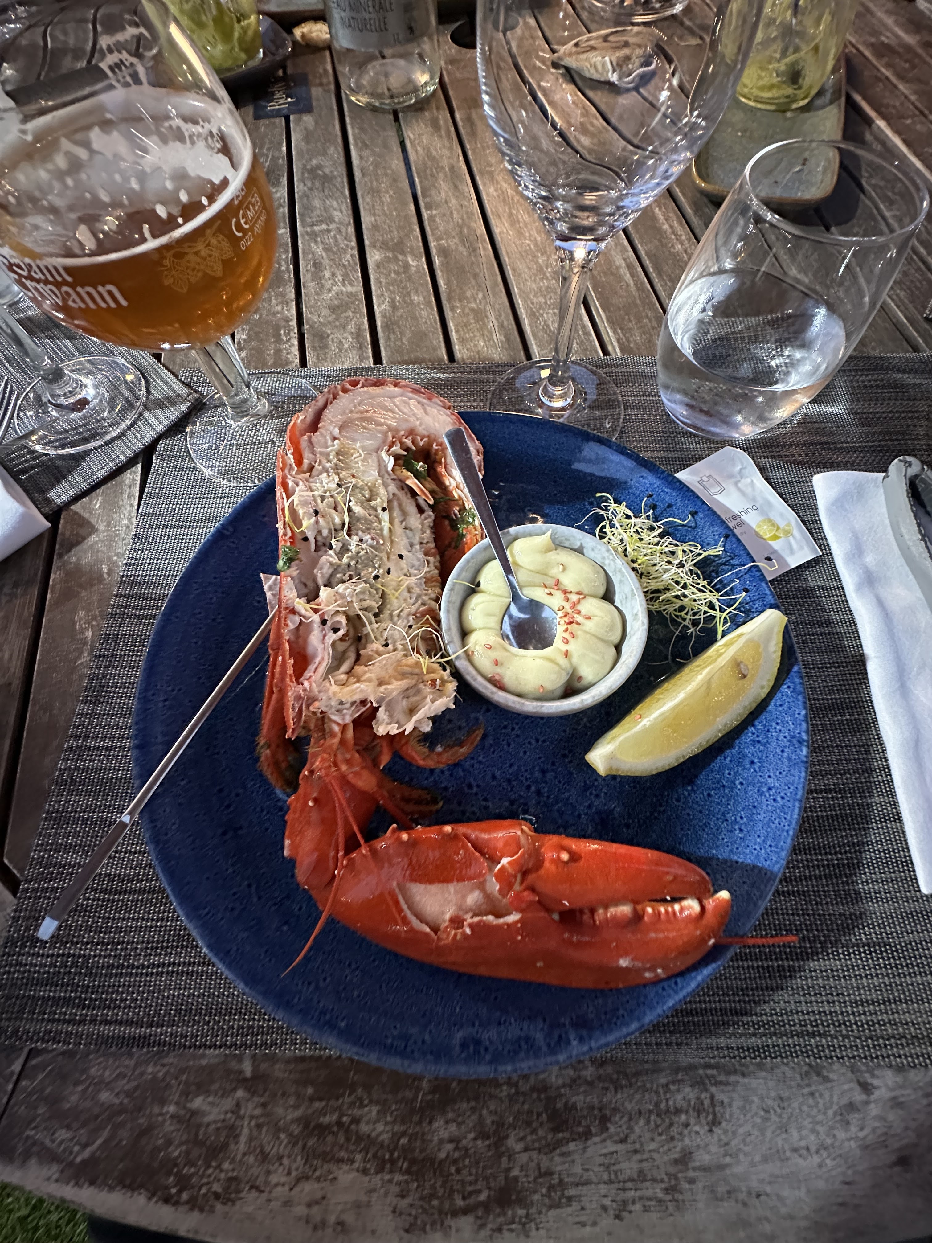 Posté le 22/08/2023 à 10:34"Cela avait pourtant bien commencé ... Bel endroit, accueil chaleureux et excellent cocktail. Mais chose intolérable pour un restaurant dingue on nous sert un Saint Julien 2016 déjà débouché ... on voit bien qu'elle a été goûtée et probablement un retour client. La boîte de Doliprane et autre médicament juste à côté des homards ... On nous avait fait une belle promo pour ce restaurant ... loupé"