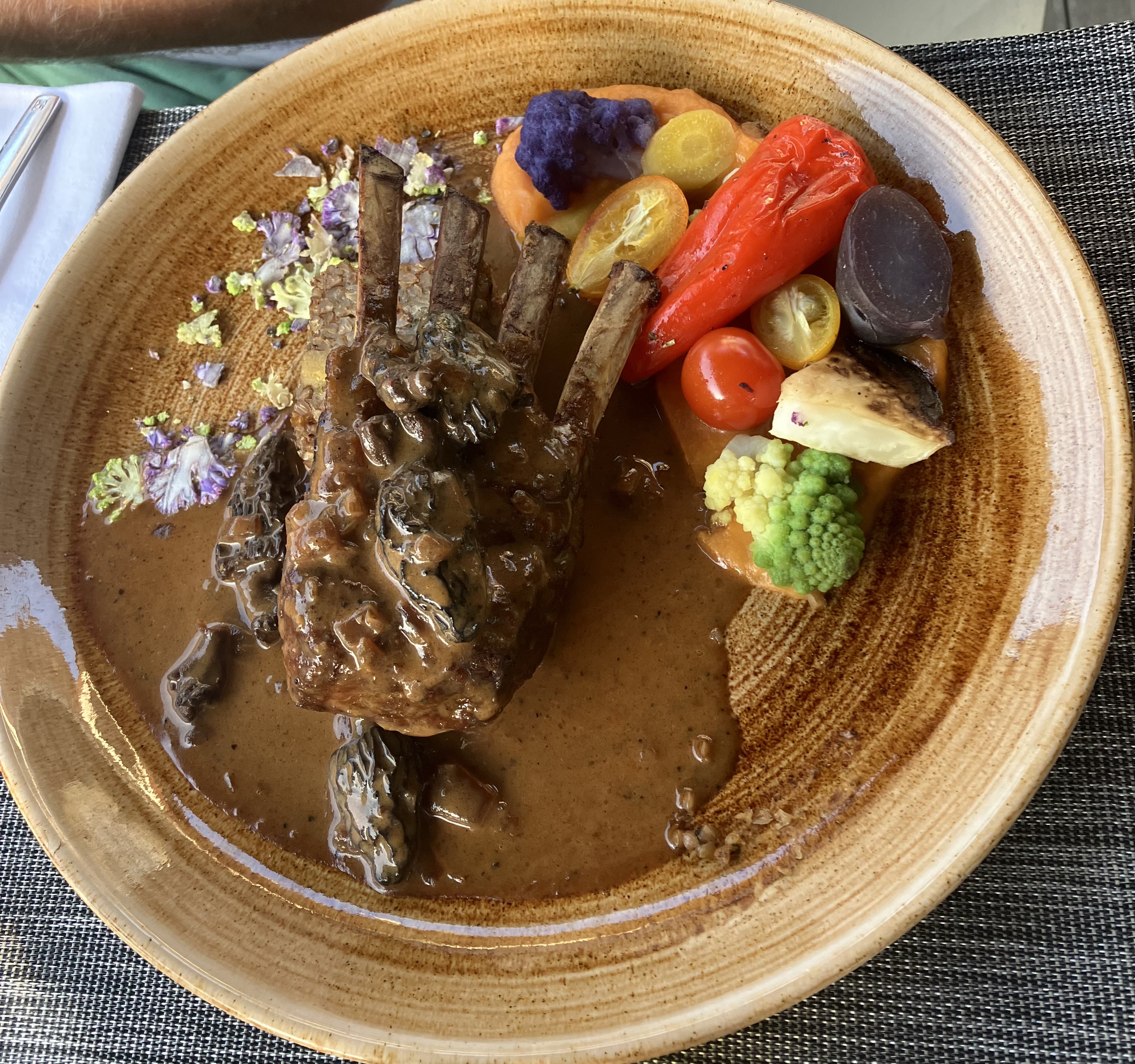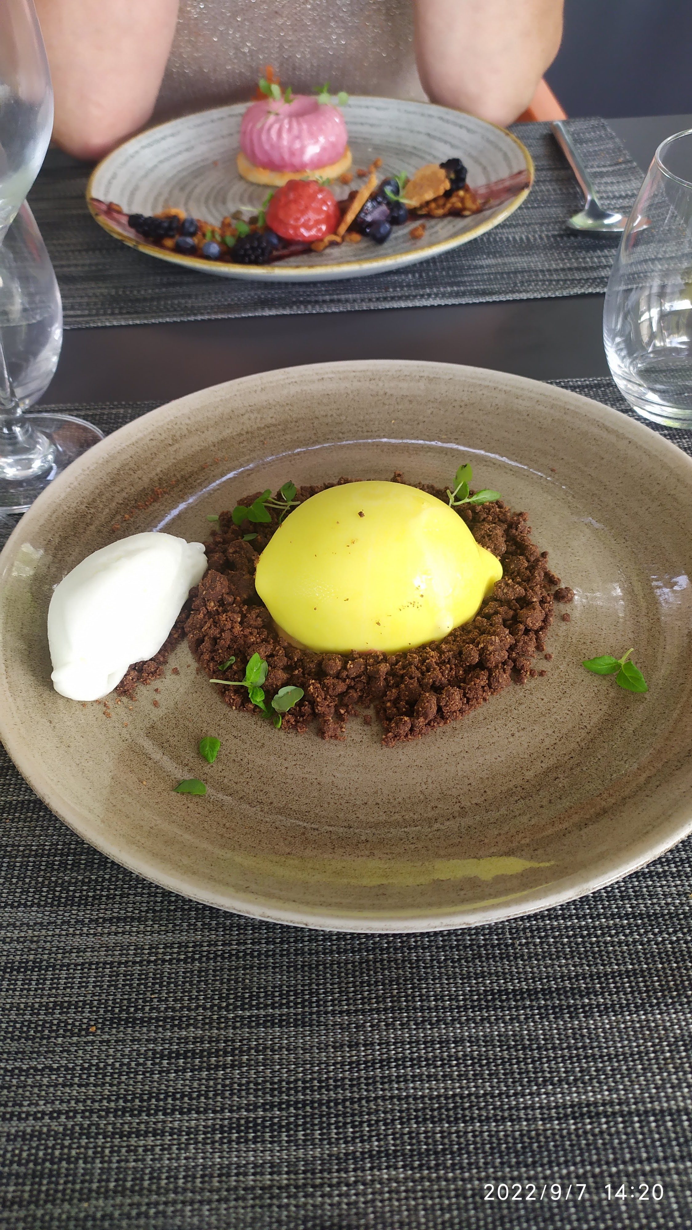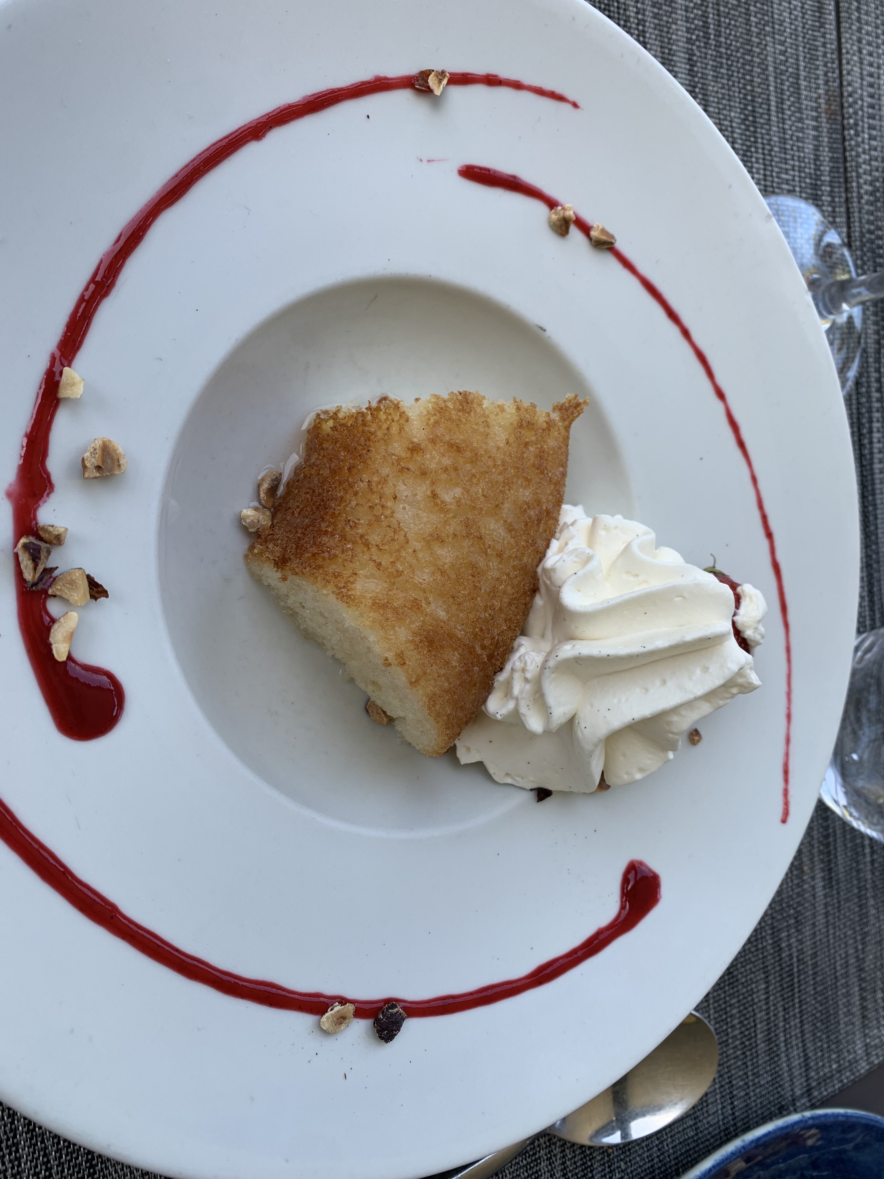 Déjeuner en terrasse. Risoto de homard, saint pierre et pavlova. Cadre très agréable et repas excellent.