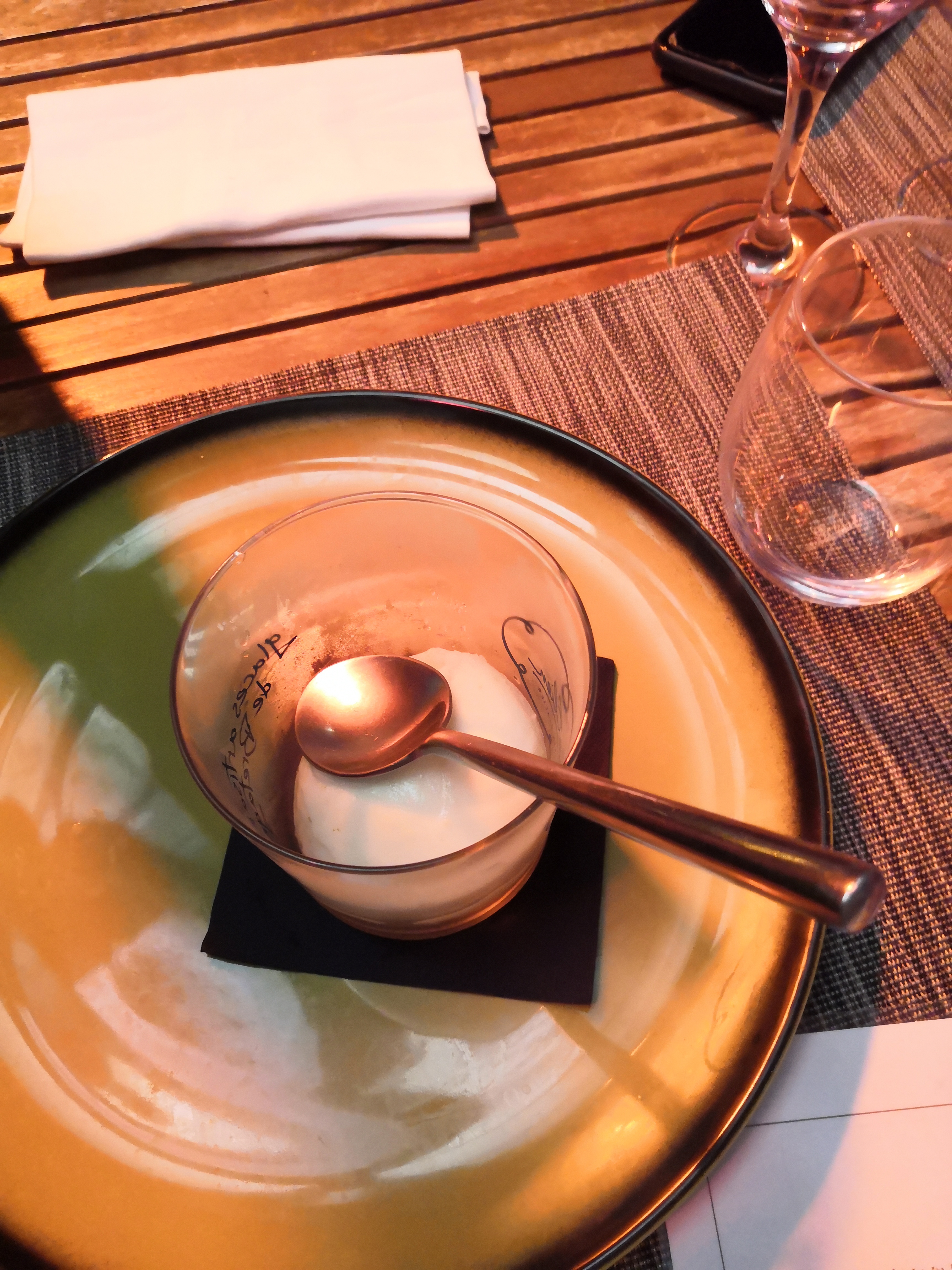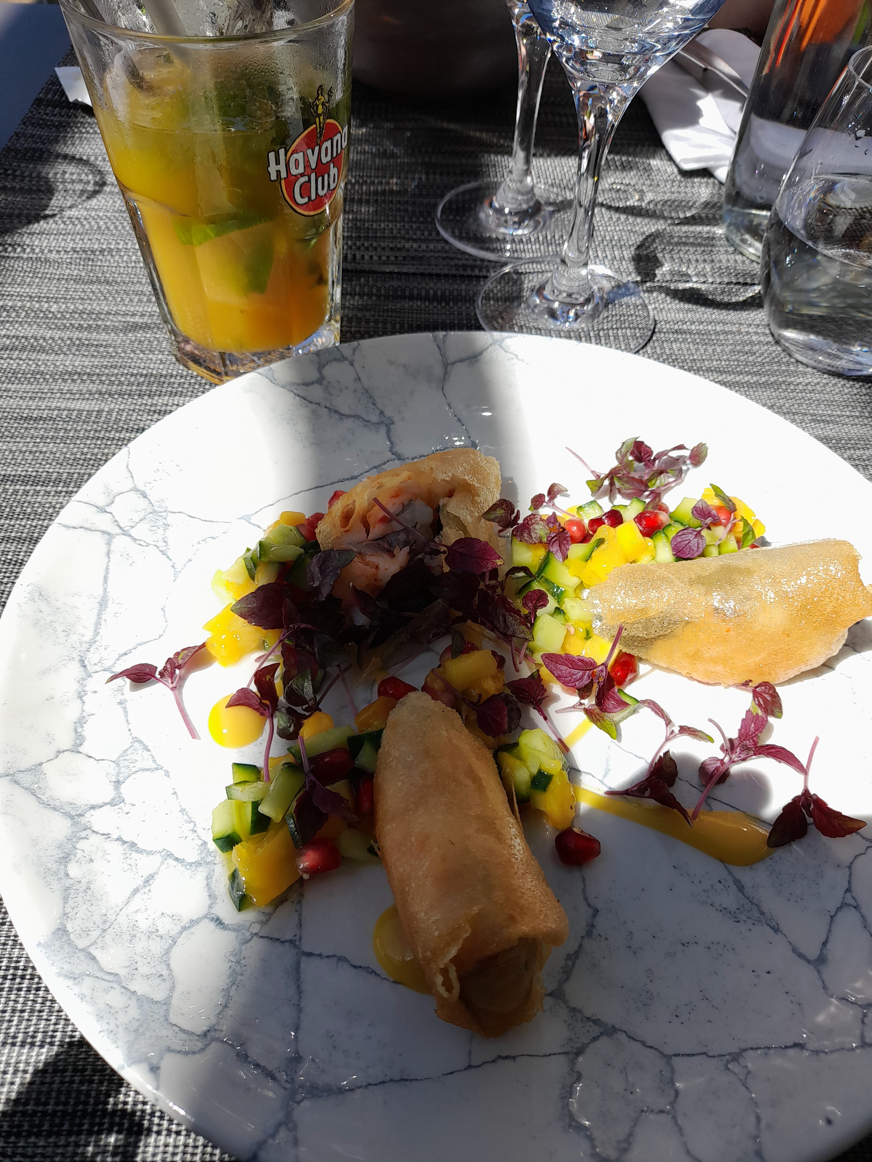 Un cadre sympathique, nous étions un gros groupe donc nous avions une pergola uniquement pour nous ce qui est fort agréable. Tout avait bien commencé avec des cocktails vraiment très bons. Malheureusement notre bon moment a un peu été gâché par la suite. Une serveuse qui pousse à la consommation et qui ne comprend pas pourquoi nous ne prenons pas de Langoustes.. Les prix pratiqués sont assez élevés et nous nous attendons à sortir de table repu, malheureusement les hommes de notre table sont ressortis en ayant faim..(le risotto qui est terminé en 2 cuillères) Nous sentions clairement que la serveuse nous avait dans le viseur certains pics comme : Voila l'assiette dans laquelle j'ai craché, on était la pour rigoler mais il me semble que c'est quand même très familier .. Et la note n'en parlons pas .. C'est dommage car c'est un lieu plein de charme que j'appréciais énormément au temps des anciens propriétaires.