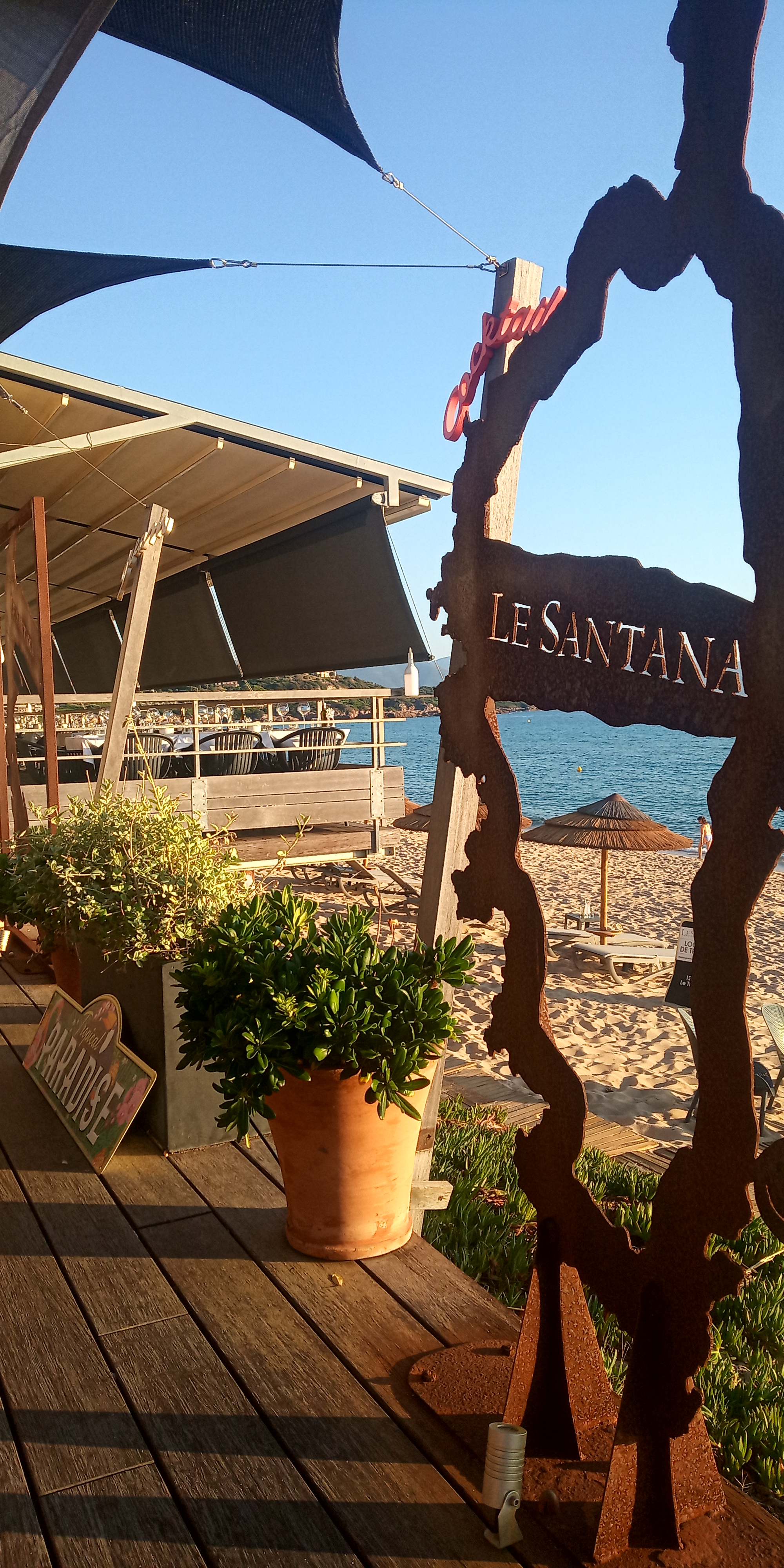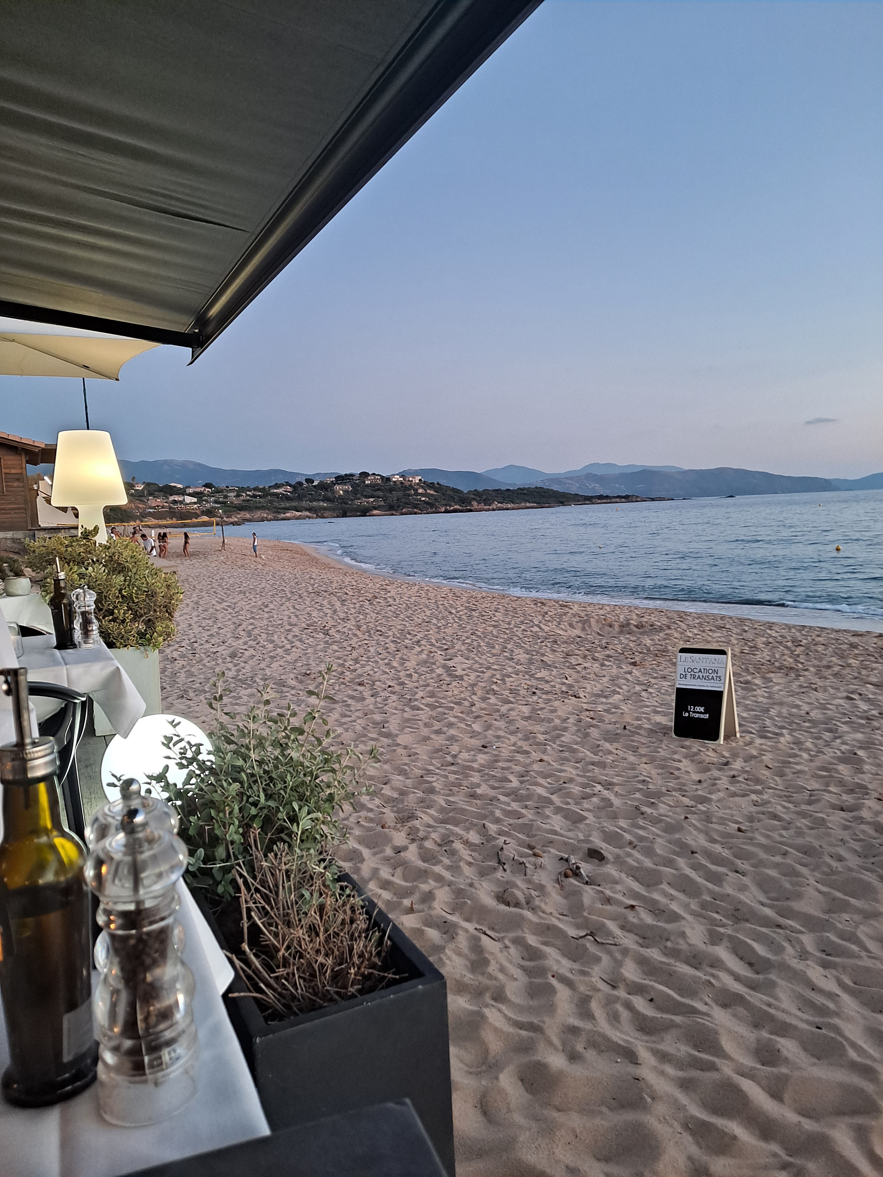 Nous nous sommes régalés à 6 en famille pour la deuxième fois au Santana! Un accueil particulièrement chaleureux et convivial des patrons, mais aussi des serveurs. Un emplacement paradisiaque avec cette plage magnifique qui donne sur la baie de Sagone et lorsqu’on est chanceux, nous permet de profiter d’un couché de soleil sur la mer. Des entrées au desserts, les goûts sont très bien équilibrés, sans jamais dénaturer le produit phare, qui est bien souvent le poisson. Tout est frais, nous avons notamment adoré le tartare d’espadon à la clémentine et mousse de coco ainsi que la dorade royale à la croûte de sel. Et pour finir, les desserts aussi sont à tomber, grâce à un vrai chef pâtissier. Rapport qualité / prix incomparable. Bref, passage obligé pour profiter d’un cadre idyllique si vous passez par Sagone!
