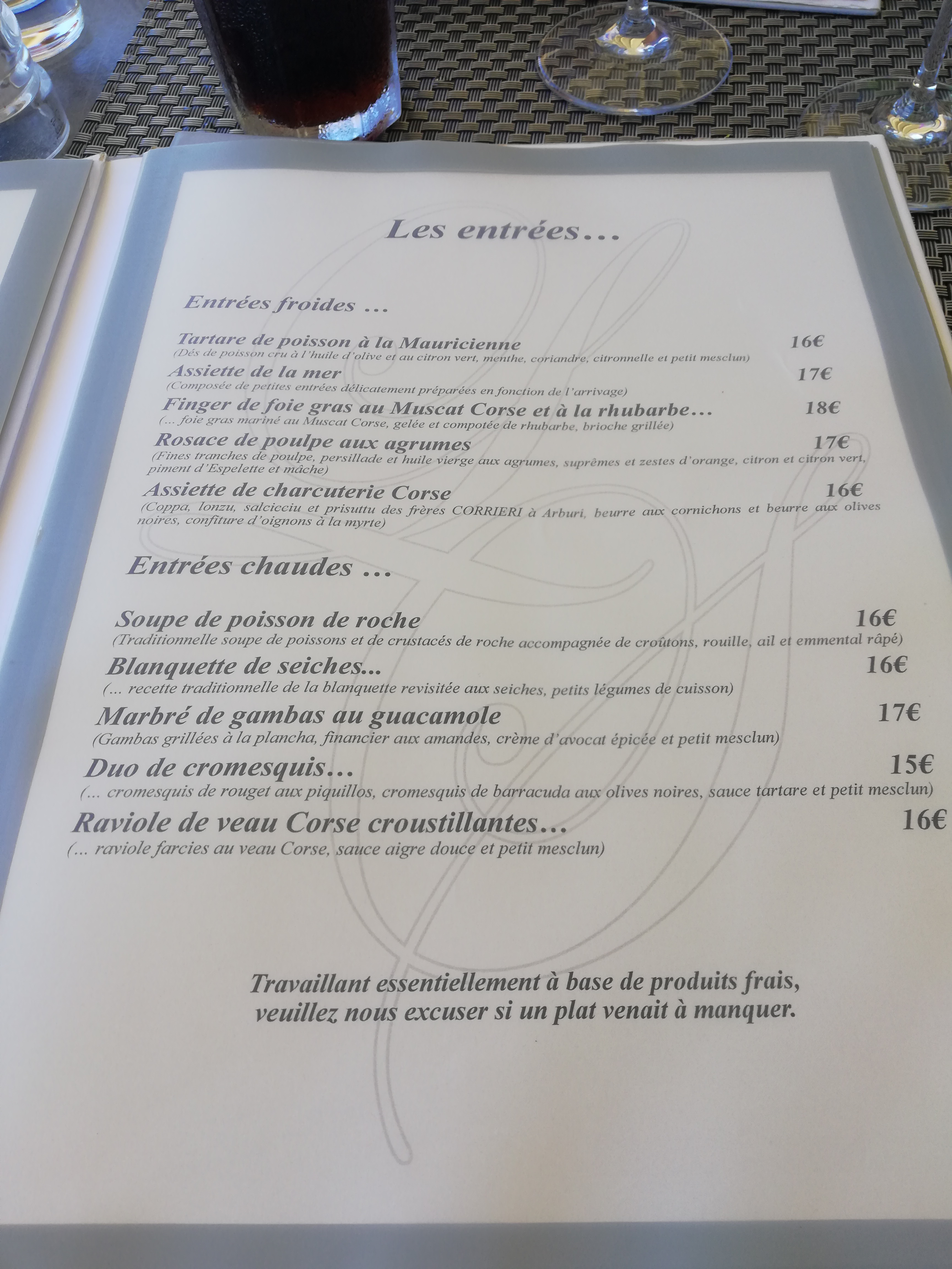 Tout de À à Z à été plus que parfait. Mise en bouche avec un petit gaspacho de pastèque/menthe offert. Menu à 36€ pour madame, avec carpaccio de poisson (espadon), storzapeti au brocciu et nougat glace. À la carte de mon côté avec le risotto seiches/chorizo et un grand cinto en dessert. Envoi des plats ultra rapide et serveuses aux petits soins, venant régulièrement s'inquiéter au cas où quelque chose manquerait, cadre exceptionnel au coucher du soleil et digestif offert par la maison. Tout cela pour une note de 110 €, avec mojitos, bouteille d'eau gazeuse et cafés. Excellent rapport qualité prix.