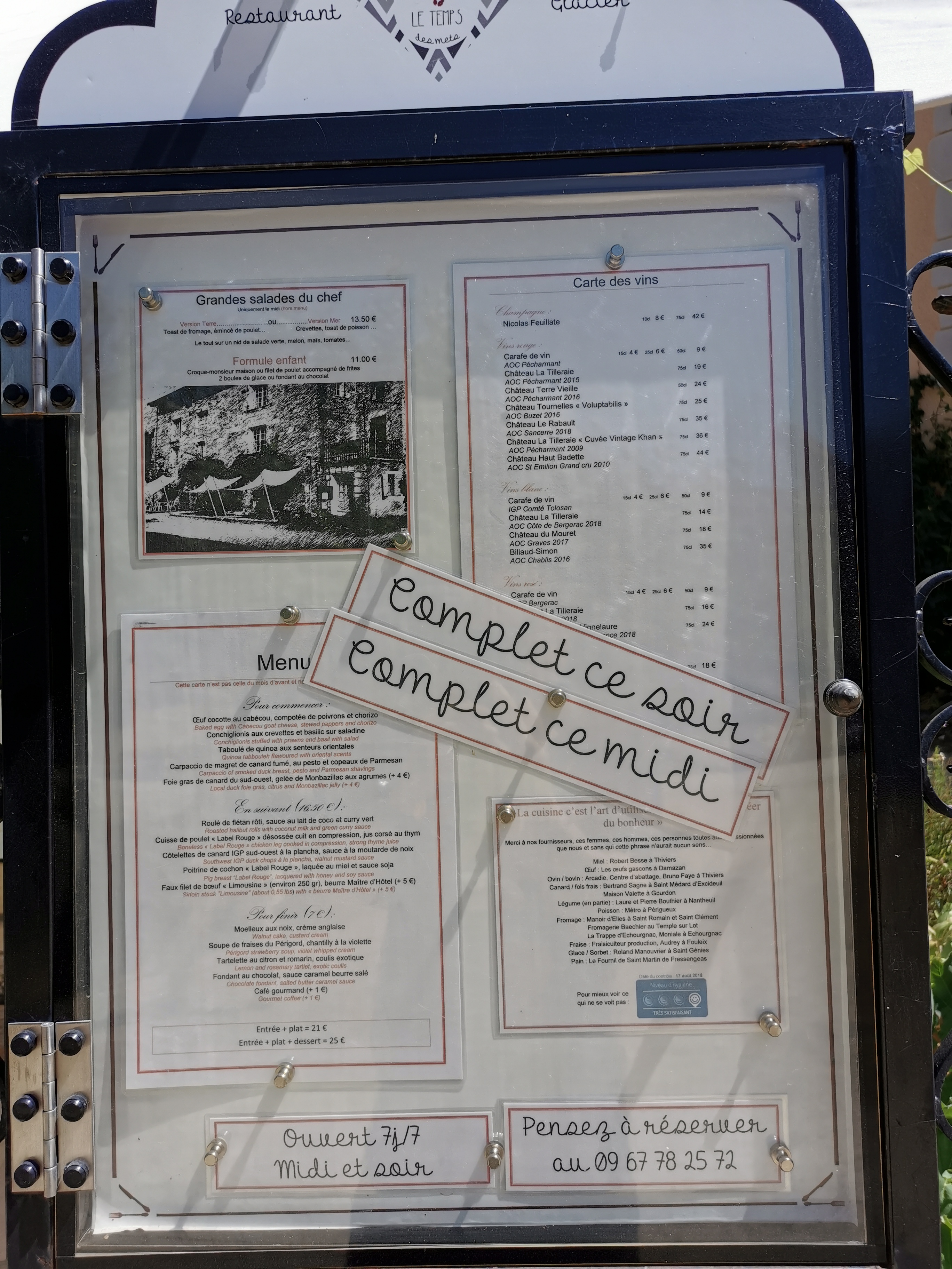 Situé en plein cœur d’un des plus beaux villages de France avec sa terrasse ombragée, l’endroit aspire à passer un agréable moment au vu des avis très élogieux laissés par les internautes. Déception, le 15 septembre, le restaurant est fermé le mardi et le mercredi. Qu’à cela ne tienne, nous y sommes retournés le jeudi 17 après avoir réservé. La cuisine est bonne, les plats sont bien présentés. L’apéro pourtant jusqu’à 4,80€ pour le Get 27 manque d’accompagnement alors que nos voisins de table en avait ! Le supplément de 4€ pour la part de foie gras du pays ne se justifiait pas. Nous regrettons également le manque d’attention pour l’oubli de couvert au dessert pourtant réclamé et jamais amené. La perfection se cache souvent dans de petites attentions. En globalité, c’est bien… peut mieux faire et en tout cas pas si idyllique que l’on veut bien nous le faire croire.