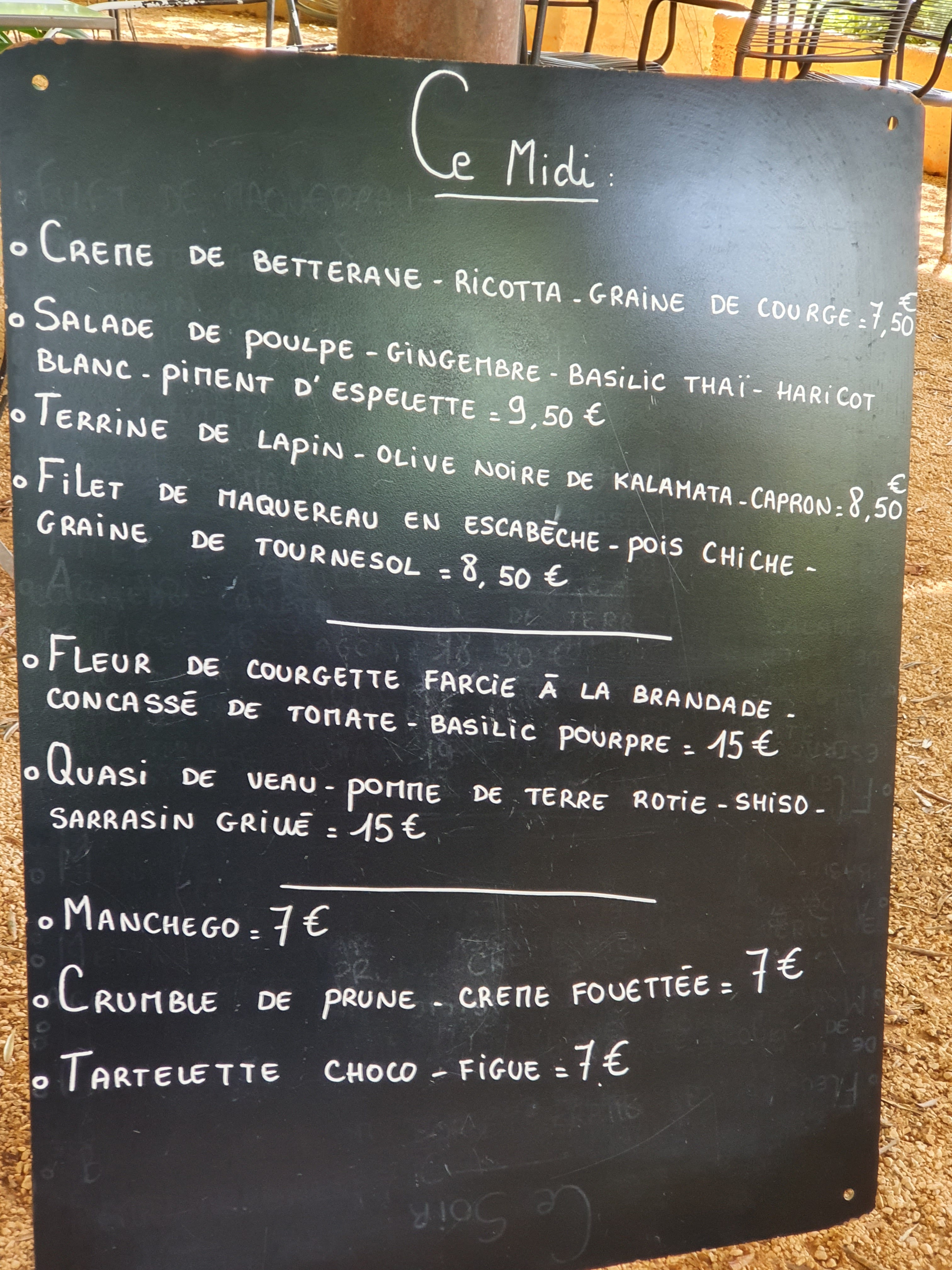 De la place entre les tables permet de garder une certaine intimité pour ce qui est de la terrasse où nous avons dîné Décoration rustique et zen avec beaucoup de verdure. Hâvre de paix protégeant du soleil et du vent. Il y a une salle à l'intérieur. Le service est assuré par la propriétaire et sa fille dans la bonne humeur tout en étant professionnel. Tout est fait maison, copieux, délicieux, permettant de découvrir de nouvelles saveurs, des associations sucrées salées offrant des expériences uniques, savoureuses. Très bon rapport qualité/prix. On mange à la carte ; les plats sont proposés sur de grandes ardoises ainsi que les vins des domaines de la région avec de nombreuses appellations en bio. Adapté aux personnes handicapées car de plain pied. Grand parking privé avec emplacement pour handicapé. Il est conseillé de réserver. A recommander pour bien manger au calme dans la bienveillance.