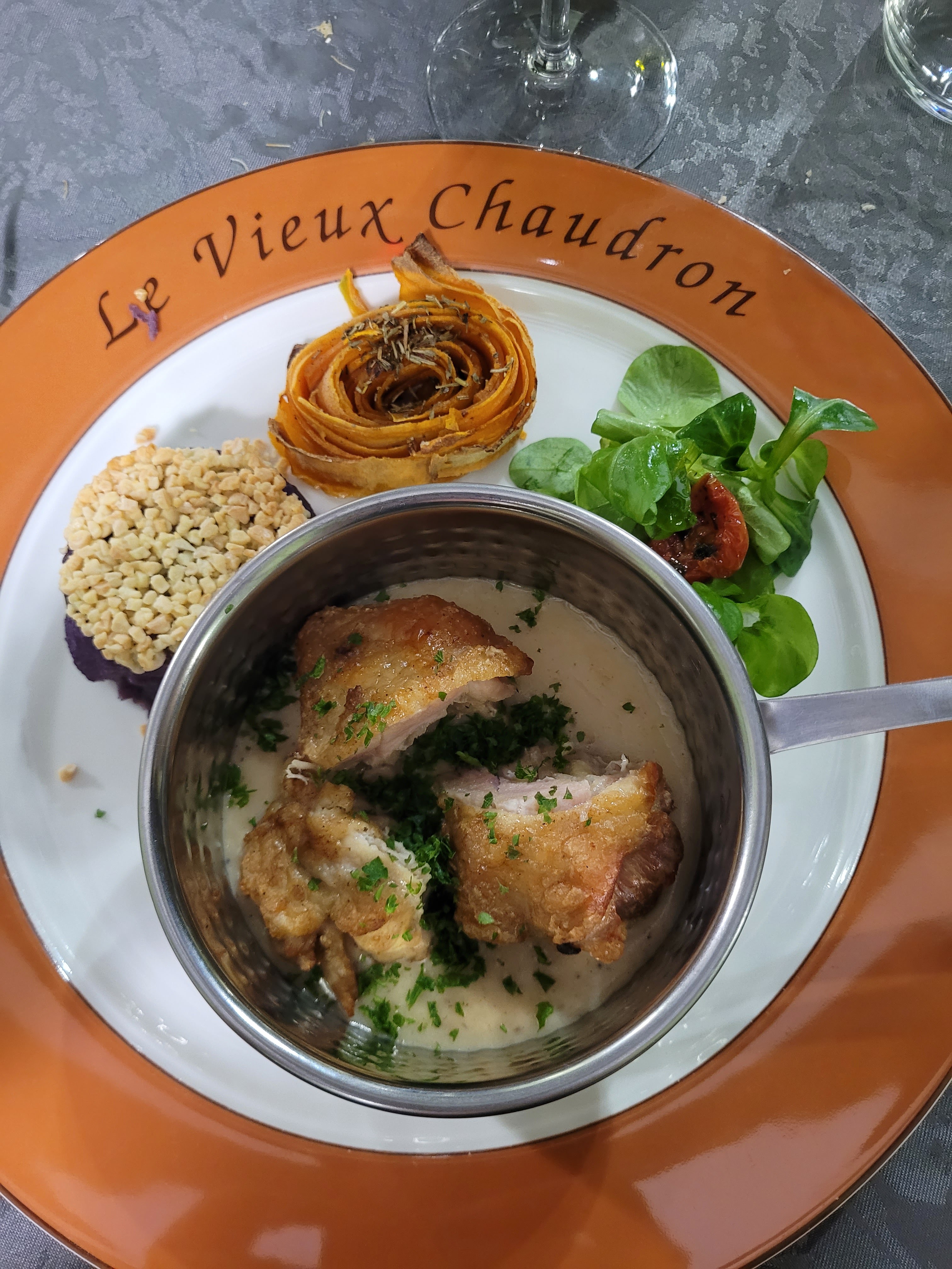 Ma femme et moi nous sommes rendus au Vieux Chaudron pour y fêter le mariage de mon meilleur ami et de sa femme. Les lieux avaient été privatisés pour l'occasion. La nourriture était délicieuse ; le personnel gentil et serviable ; et le cadre champêtre, s'il n'est pas au goût de tout le monde (pour moi, si), convient à merveille à la bâtisse qui abrite l'établissement, et au petit village où il se trouve. Nous avons commencé la soirée en profitant d'un excellent vin d'honneur format entrée-plat-dessert, constitué d'amuse-bouches tous plus succulents les uns que les autres (j'en ai vraiment trop mangé), et accompagné d'une soupe champenoise très bien réalisée (et je dis ça en étant Champenois et très à cheval sur cette recette de mon pays). Le repas a ensuite achevé de nous convaincre de la qualité de ce restaurant ; nous avons vraiment apprécié cette cuisine traditionnelle française revisitée et préparée avec de bons ingrédients. Bref, une bonne adresse si vous voulez profiter d'un bon repas tradi bien de chez nous !