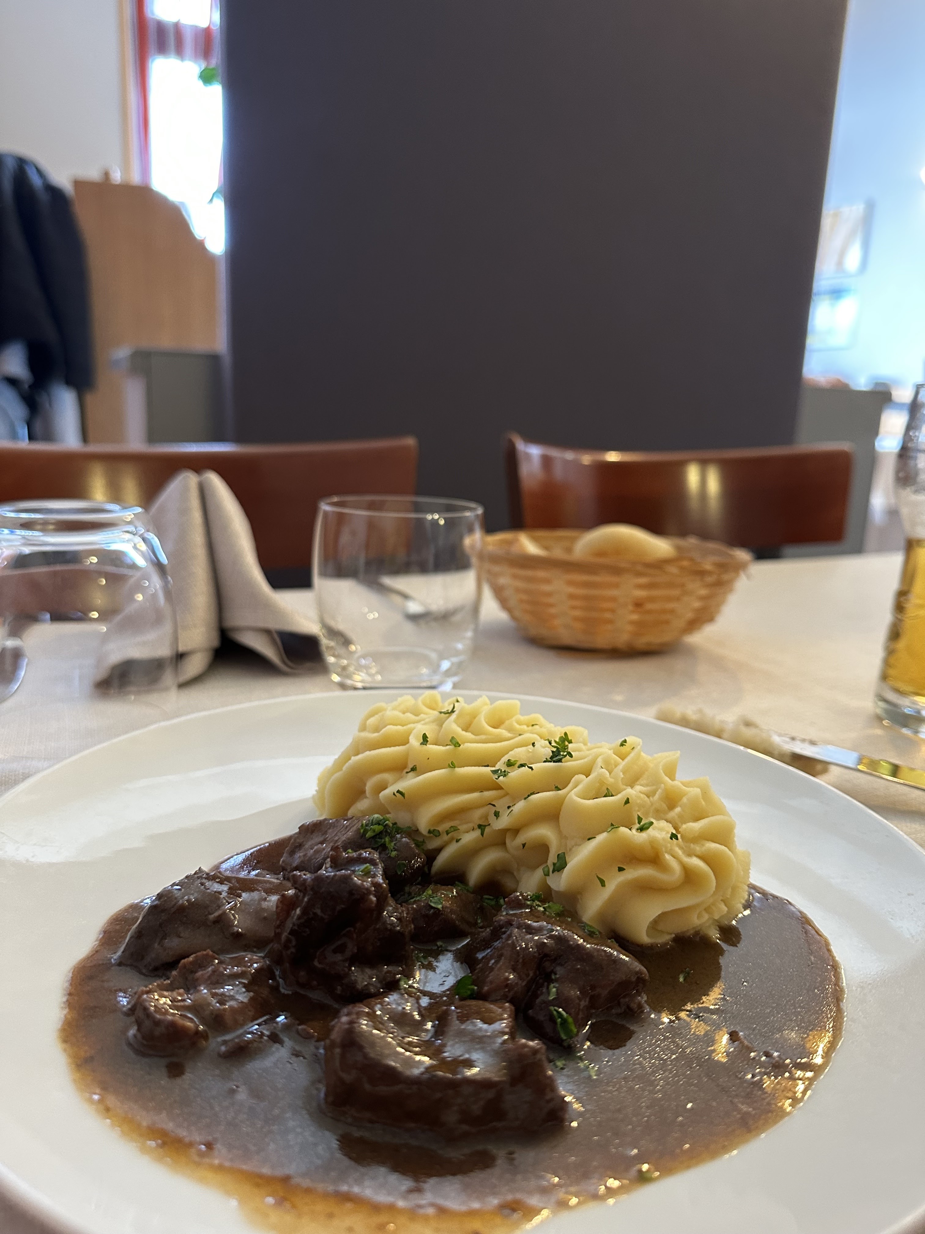 Plat du jour cuisine traditionnelle (joues de bœufs). Boissons et café à prix très correct.