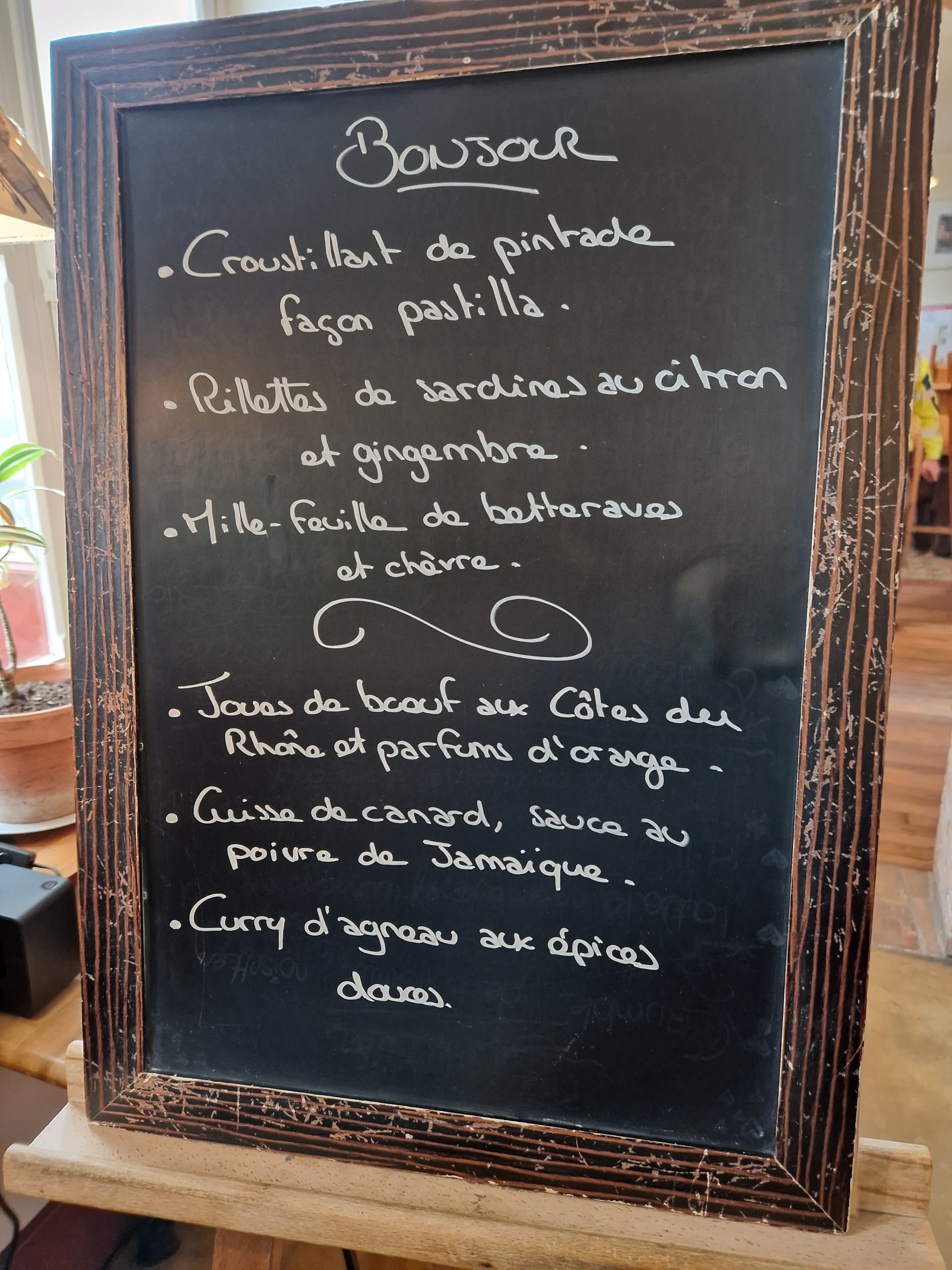 Lieu très agréable et détendu on s'y sent bien le menu est honnête pas trop rempli mais on y trouve son choix prendre le temps de le lire même les petits caractères vous comprendrez. Quand l'assiette est arrivé j'avoue avoir repproché la panière mais en fin de compte c'était inutile à la fin de l'assiette j'avais bien mangé... 😁