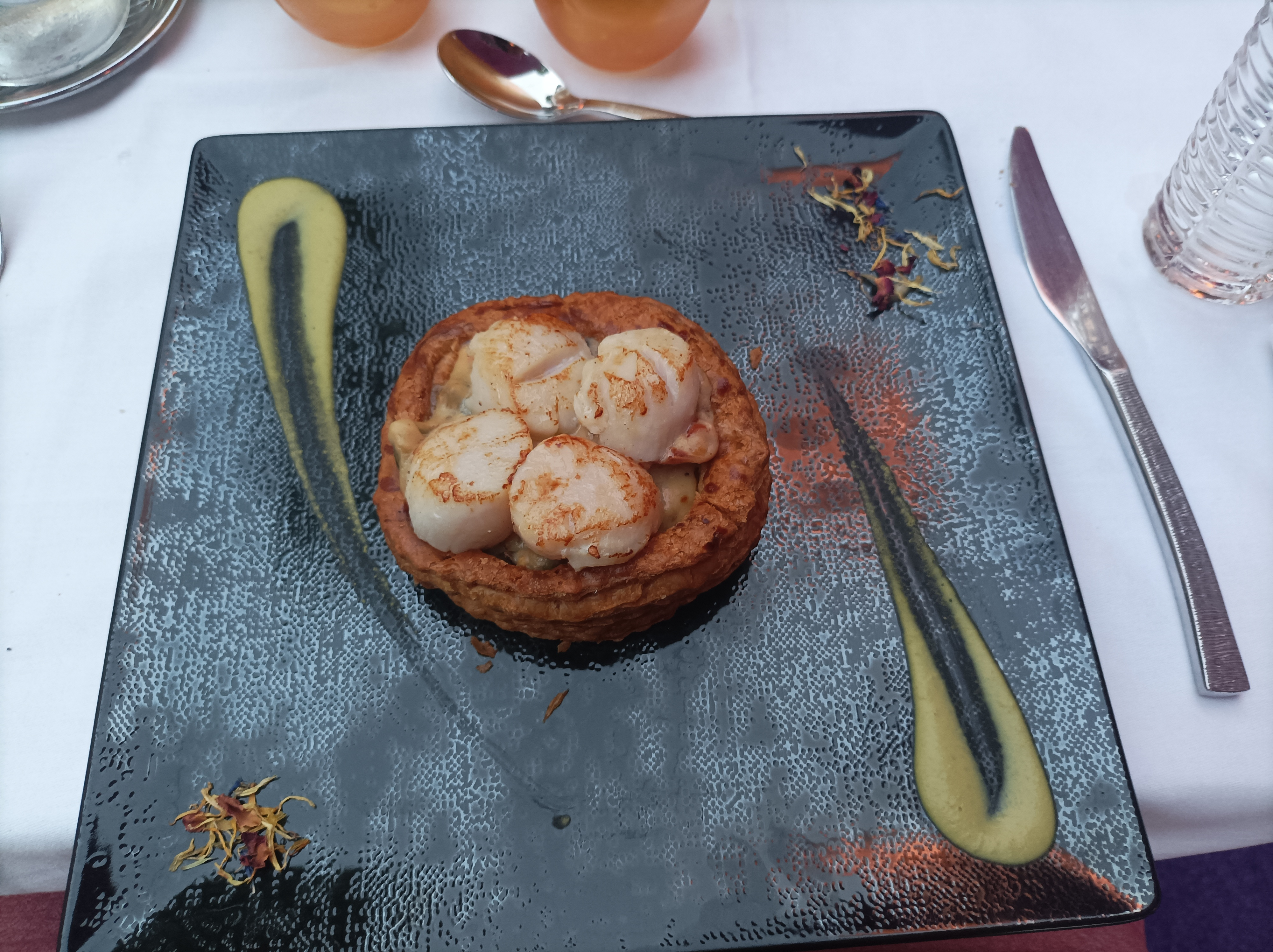 Le plat des noix de St Jacques aux ravioles truffées est excellent. Le cadre est magnifique, même en terrasse. Je regrette le prix du menu découverte. Plat + dessert 36 euros. Je trouve que c'est excessif.