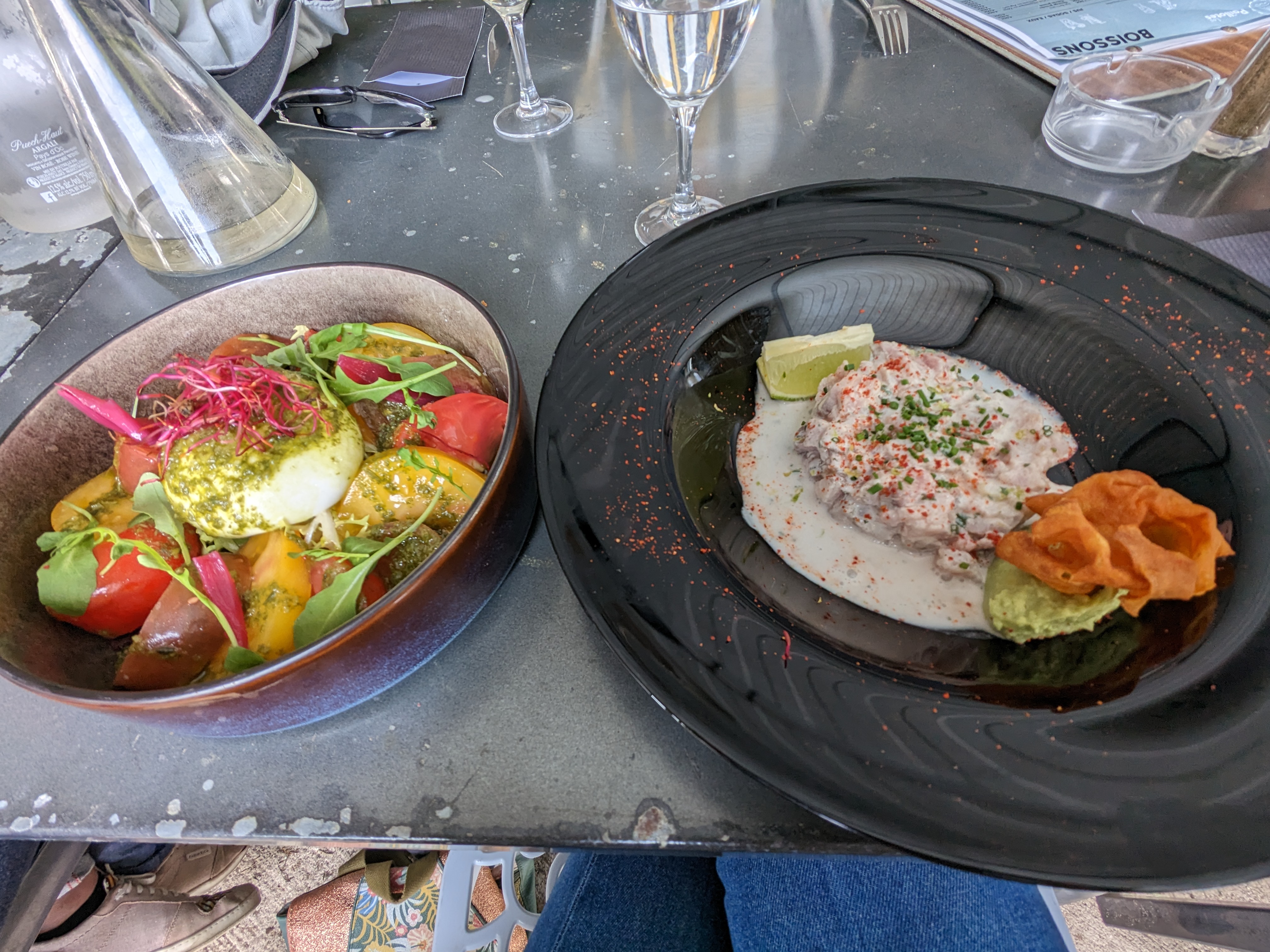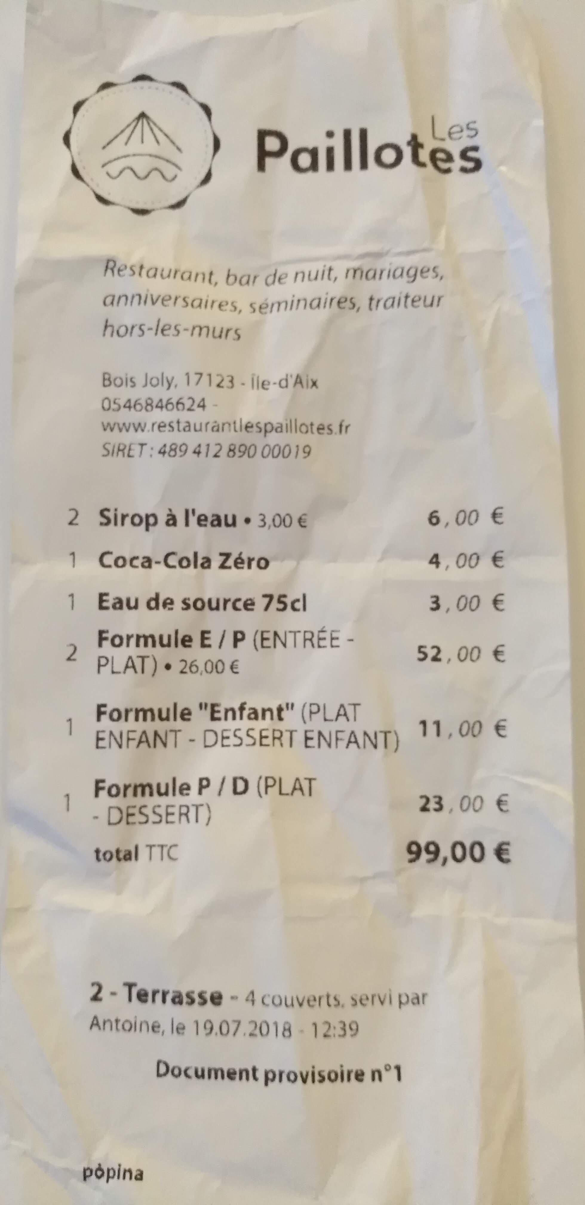 Un peu déçu !! Le restaurant est agréable, la terrasse à l'ombre. L'accueil est sympathique. Cependant un peu juste sur les plats. La viande manque de tendreté. La portion de pâte est vraiment light. Dommage également que ça soit juste chaud sur les assiettes. Le reste était correct mais sans plus. Je trouve également très limite que l'eau de source soit facturée sans qu'on nous informe car non commandée, ce n est pas commerçant et le tarif est exorbitant pour 75cl (je m en suis aperçu sur le bateau du retour). La bouteille d'eau est sur toutes les tables. (photo 1 que j avais prise pour la terrasse). Au final, ce petit détail m'agace et je pense que vous prenez les touristes pour des vaches à lait. J aimerai qu on m explique la dernière ligne de la note également !! (document provisoire) c est peut être plus facile pour faire passer du paiement en liquide.... Merci.