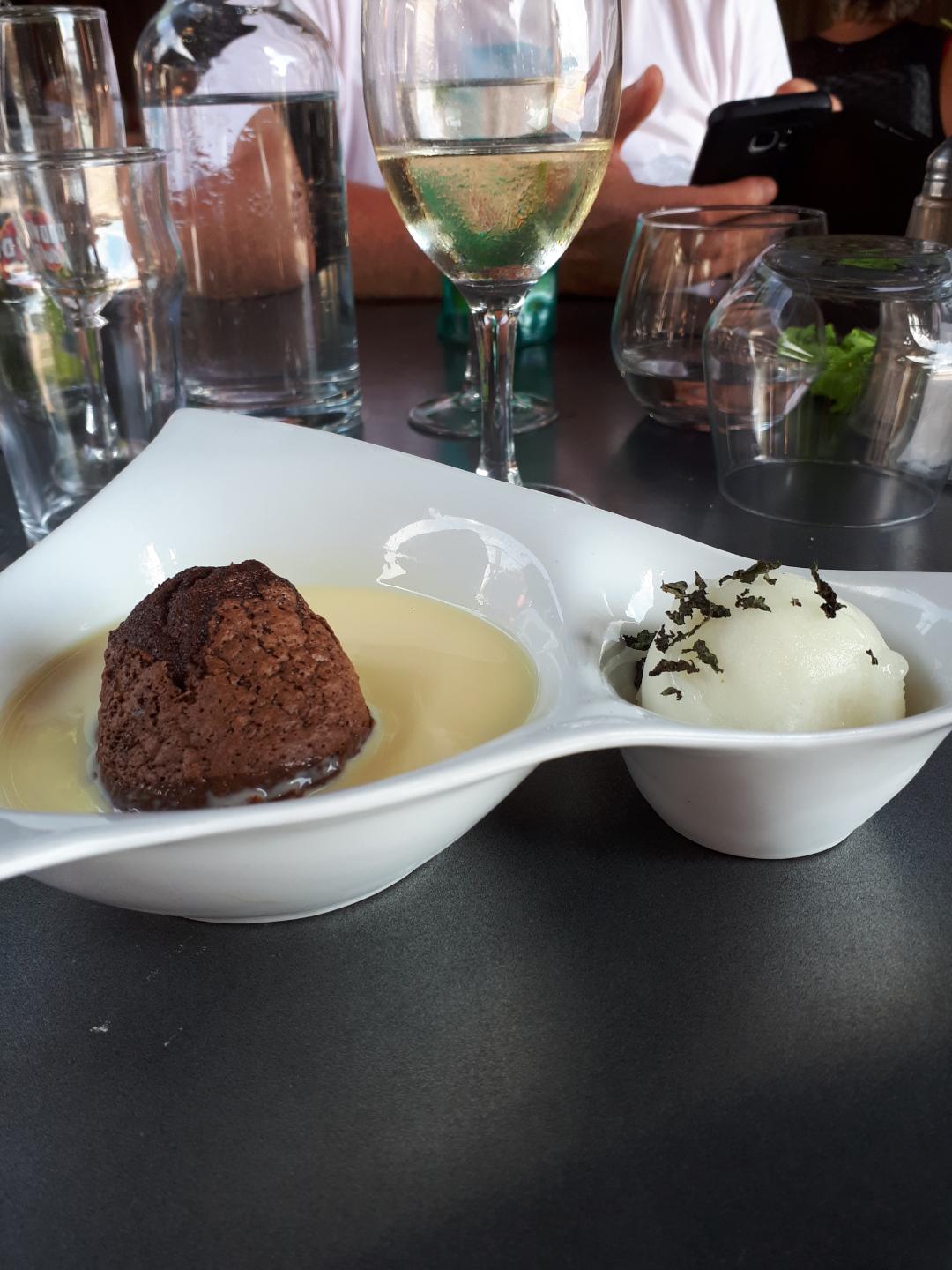 Le lieu est idyllique et vous le sentez dans la facture. Le plat principal est bon, ( blanquette de sèche) un peu léger en sèche pour un plat à 23 € mais une sauce crémeuse avec ses patates grenailles. Par contre le dessert est une blague, une arnaque, ce n est pas un moelleux mais un gâteau au chocolat miniature et assez dure qui vous revient à 9 €.