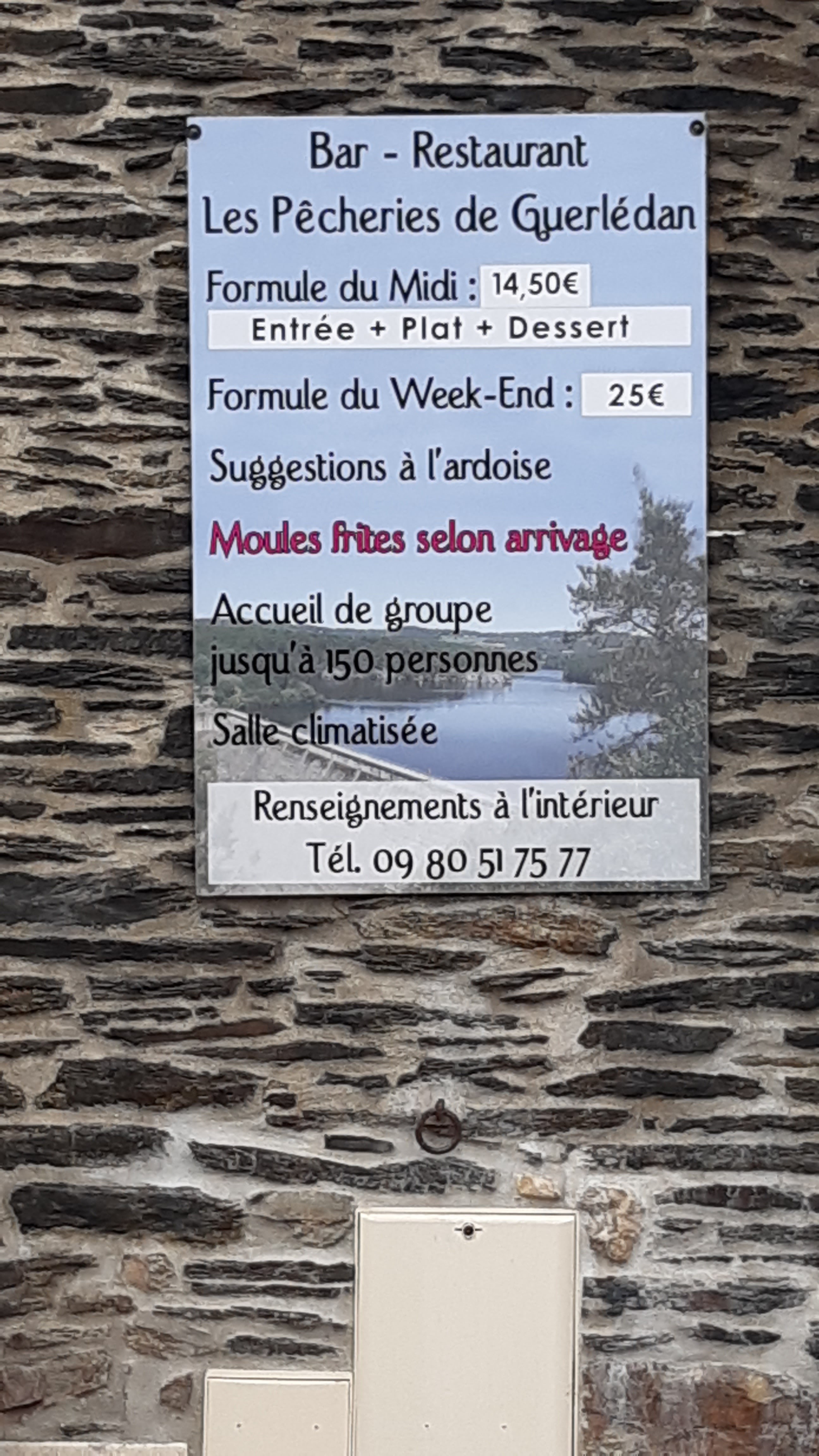 Un restaurant chaleureux dans un joli hameau proche du barrage du lac de Guerlédan. Vous pourrez faire une belle balade jusqu'à la Chapelle Sainte Trephine avec une vue fantastique puis déjeuner aux Pêcheries. Ils proposent un menu déjeuner à 14,40 euros avec des plats classiques français simples. Mais frais et bien préparés et servis avec le sourire. La glace est également très savoureuse et le chien est plus que bienvenu