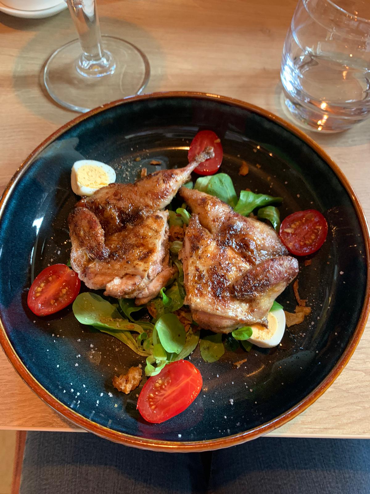 Bonne nuit! Ambiance chaleureuse et nourriture délicieuse. Bons conseils en vins. Deux entrées surprenantes au préalable, suivies d'une caille en morceaux joliment cuite. Saumon grillé à la peau croustillante en plat principal : délicieux ! Pain savoureux avec du beurre aux herbes aussi. J'ai choisi l'assiette de fromages pour le dessert, cela s'est avéré être un excellent choix. Nous nous souviendrons de cet endroit et serions ravis de revenir pour dîner avec nuitée.