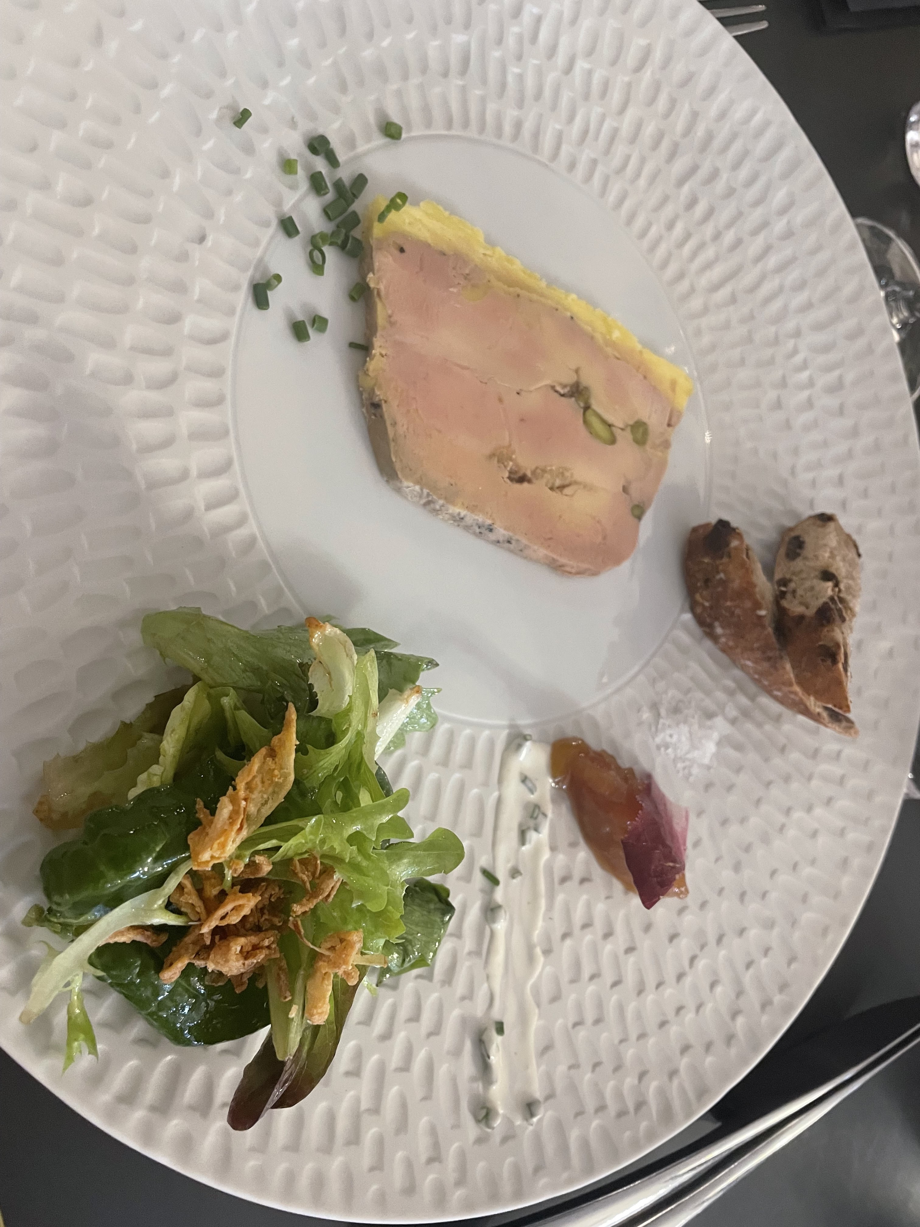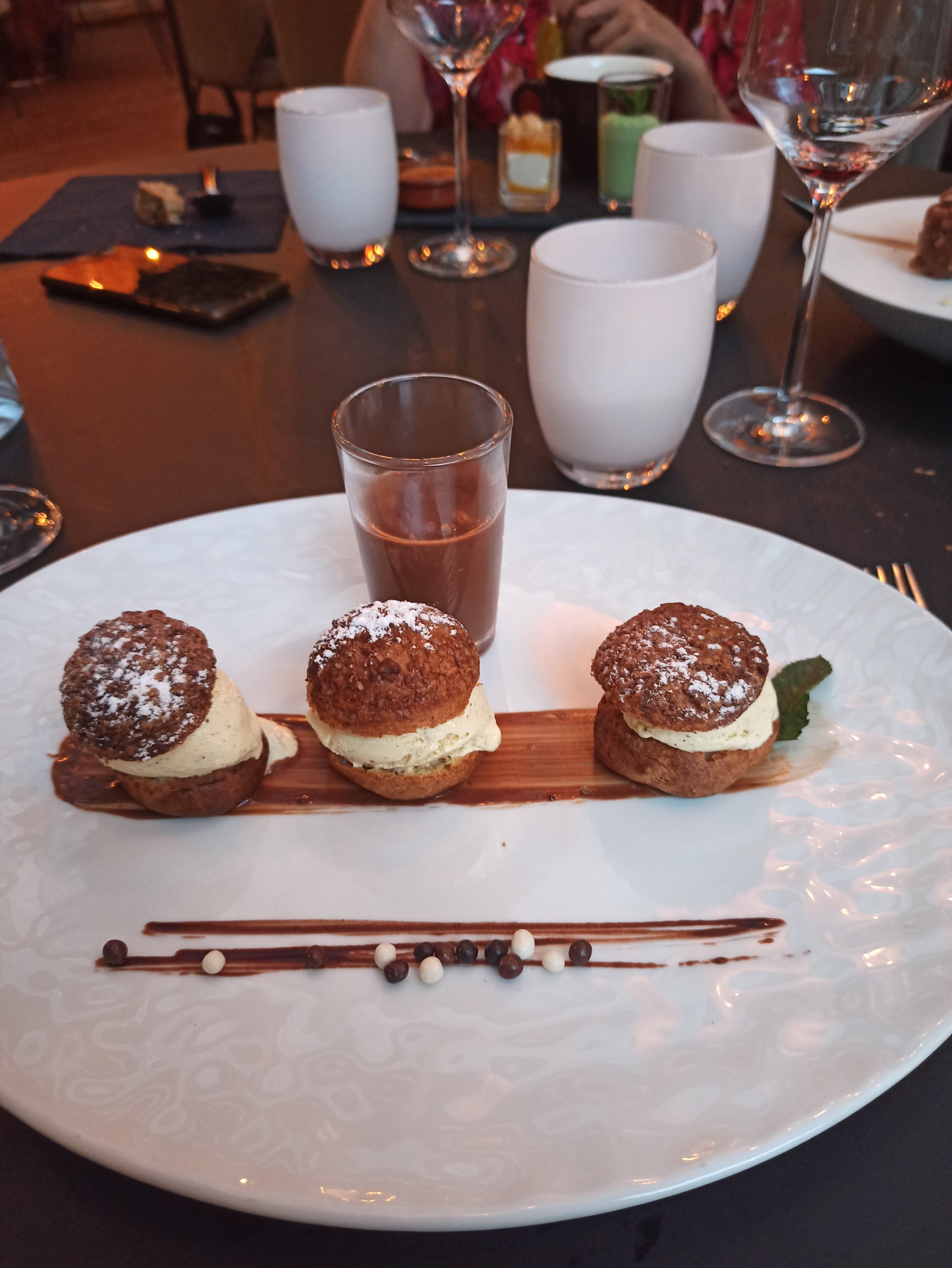 Un régal vraiment. Les entrées des oeufs époisse et meurette un délice. La sauce framboise pour le magret un peu trop en quantité à mon goût et un peu trop sucrée... La viande était parfaite .. Et les Profiteroles les choux étaient un peu trop cuits aussi pour nous. Le finger chocolat une tuerie et une des convives s'est extasiée des gambas et du risotto à la truffe.