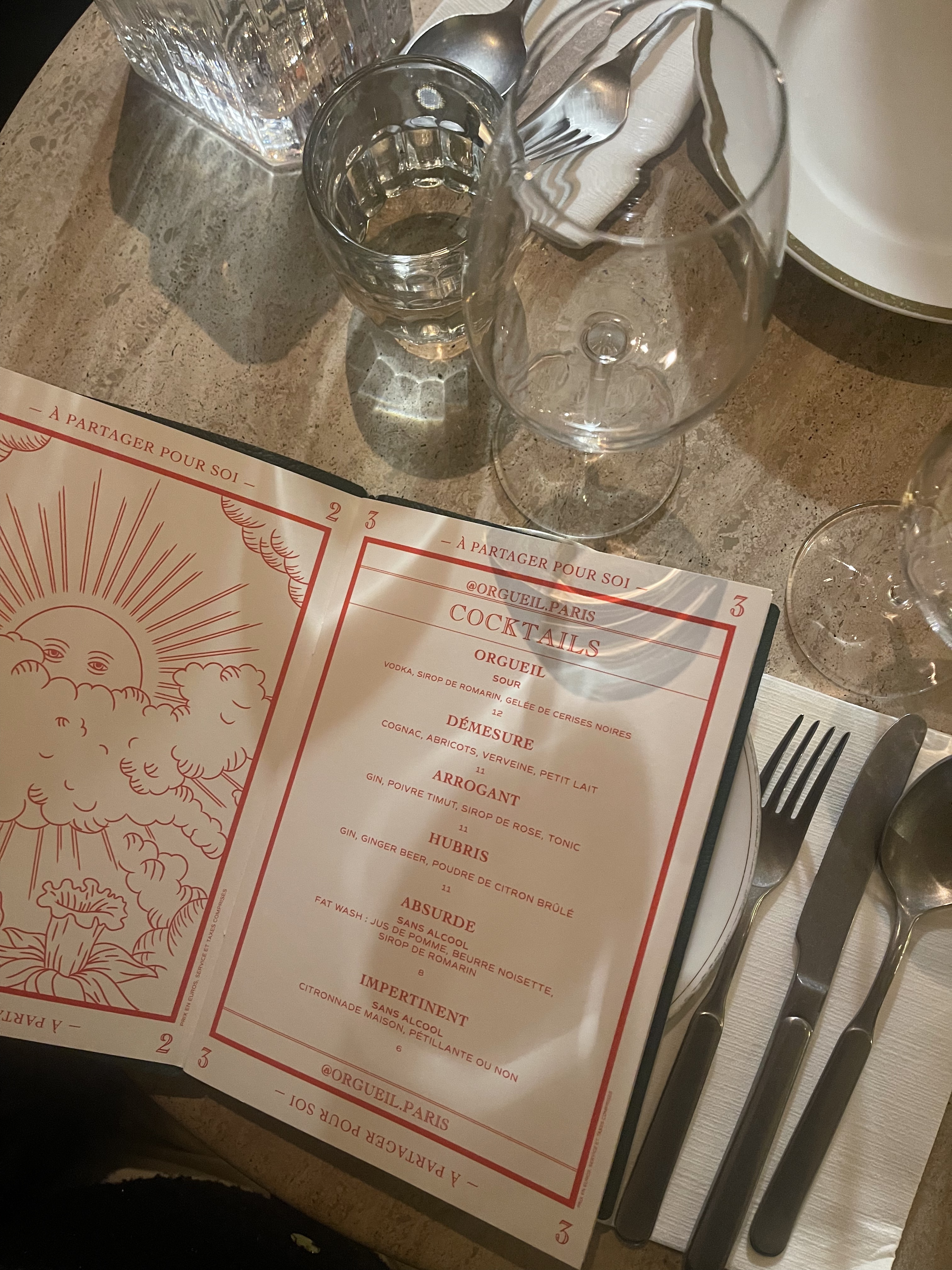 Déjeuner avec un ami de longue date, amateurs de bons plats, ont s’est tous les deux décidé à aller visiter le fameux Orgueil (côté bistro). Déjà, on a été super biens reçus, équipe super souriante, attentionnée, attentive, bonne ambiance dans le resto, service impeccable. La musique était chouette et au bon volume (on s’entendait parler correctement mais on appréciait aussi le fond sonore). On a adoré le menu en cartes de tarot, la DA globale des menus et du restaurant est vraiment jolie et bien pensée. Pour la nourriture, on s’attendait à ce que ce soit très bon, et on a quand même été épatés par la qualité de ce qui était proposé tout en étant à un prix abordable (certains diraient que ce sont de petites portions, pour nous s’était parfait, ni trop ni pas assez). On peut dire qu’on a été agréablement surpris alors qu’on savait déjà plus ou moins à quoi s’attendre ! De plus, on était contents de voir des options vege qui étaient délicieuses ✨ On a passé un super moment de retrouvailles dans une ambiance chaleureuse avec des bons produits, c’était génial, merci beaucoup ! On a déjà prévu d’aller tester Colère et également la partie Speakeasy ☺️ (A titre d’exemple, nous avons payé 28€ chacun, avec les gnocchis au comté, une pavlova et une tatin, et une boisson chacun)
