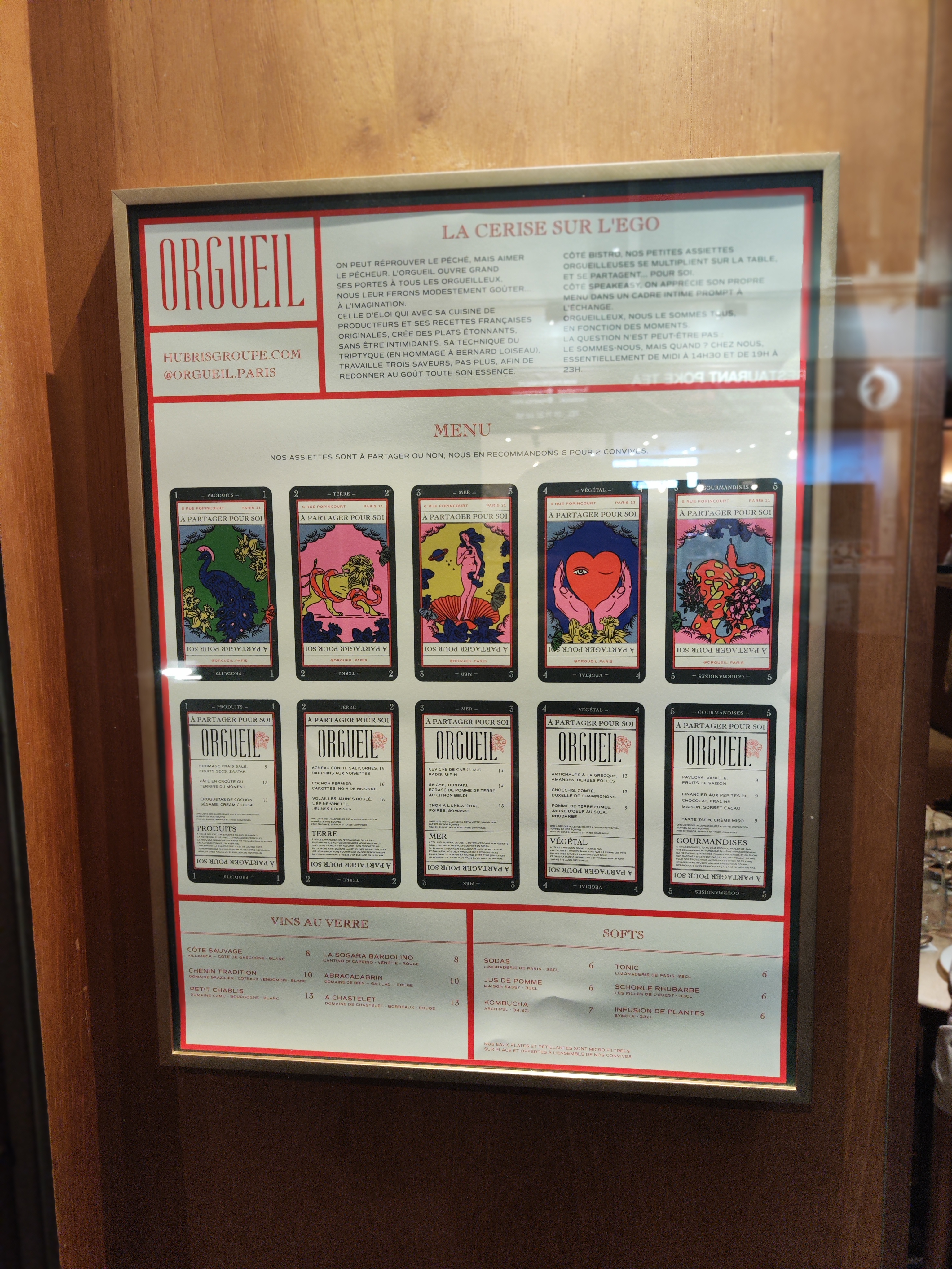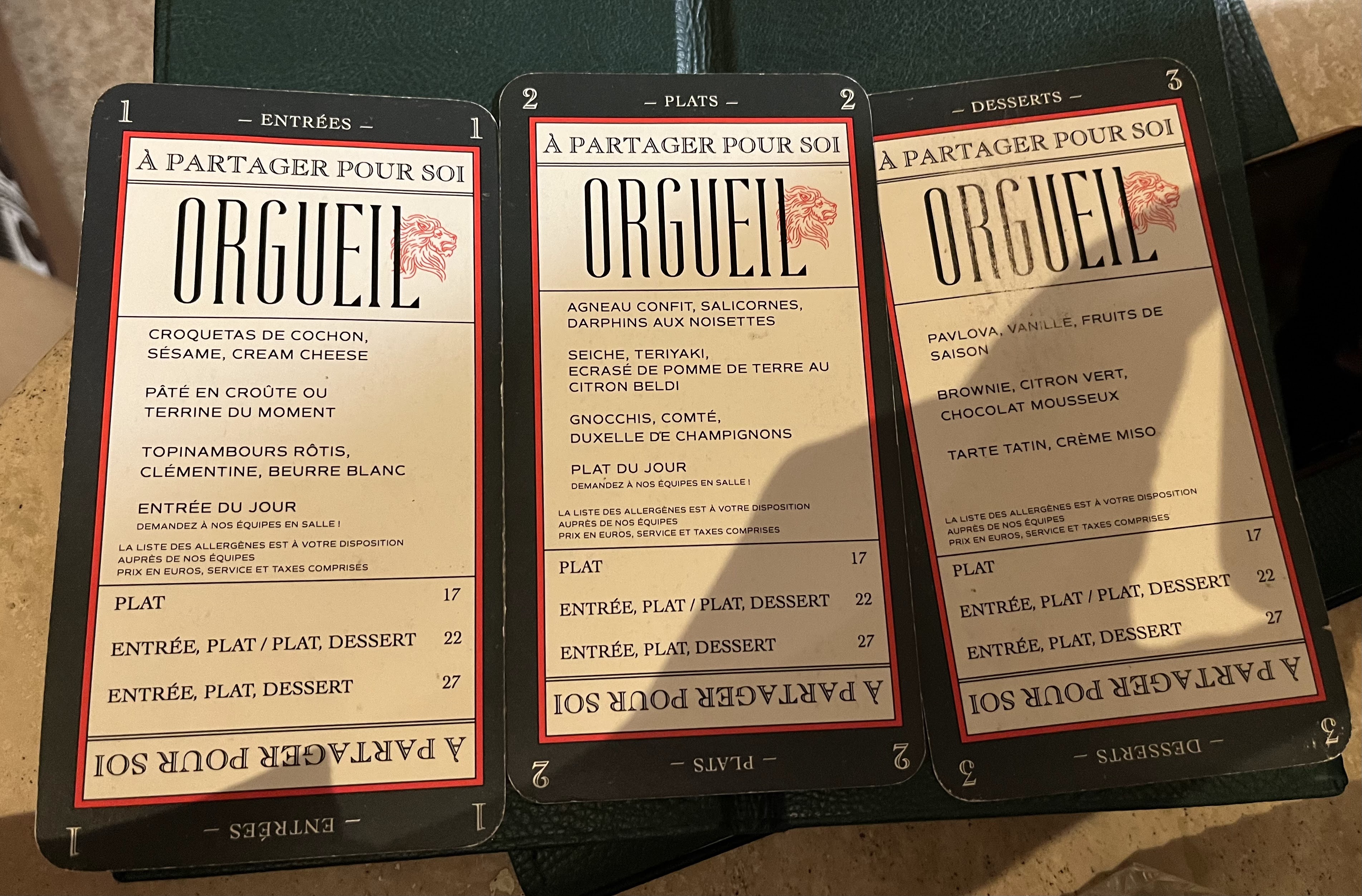 Une belle expérience chez orgueil avec des menus sous formes de cartes de jeux. Très intuitif. Par contre je trouve les portions un peu faibles comparées aux prix. A 30 euros chacun avec un cocktail nous n’étions pas forcément calé… mais tout était très savoureux !